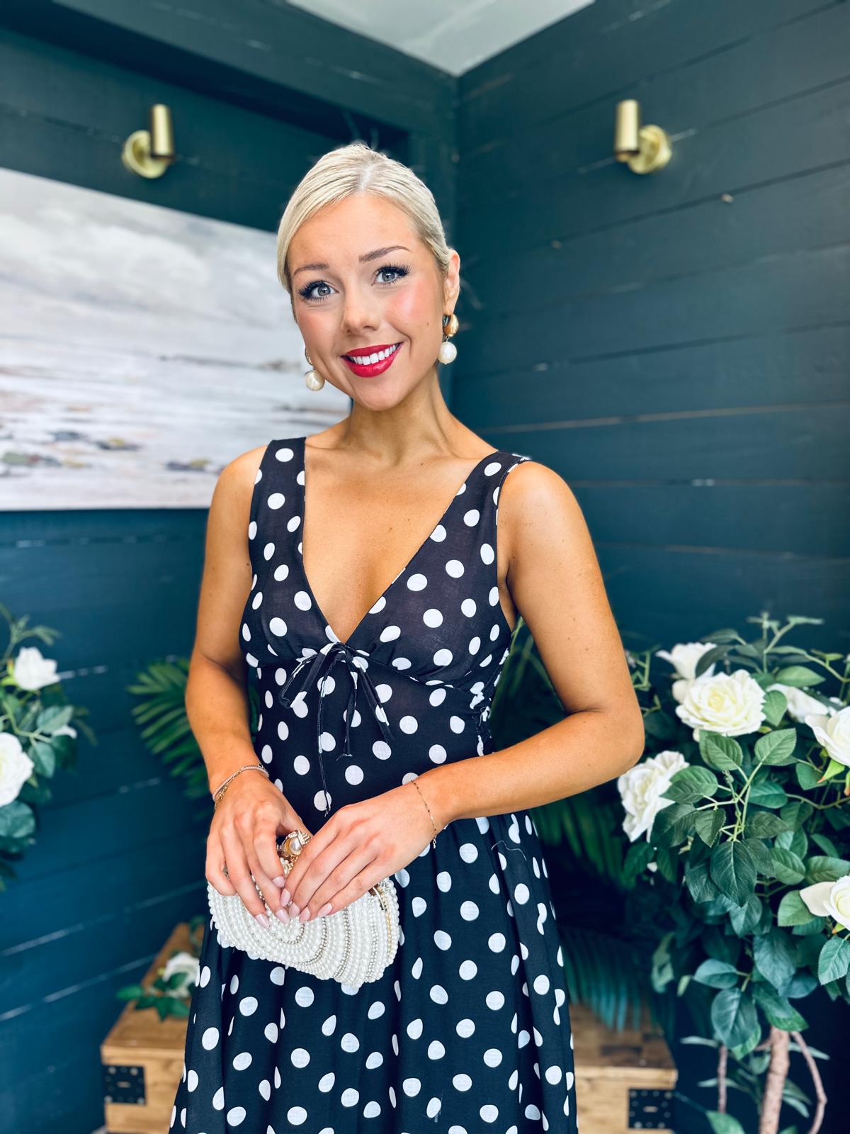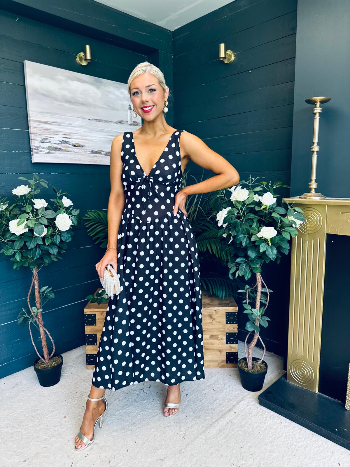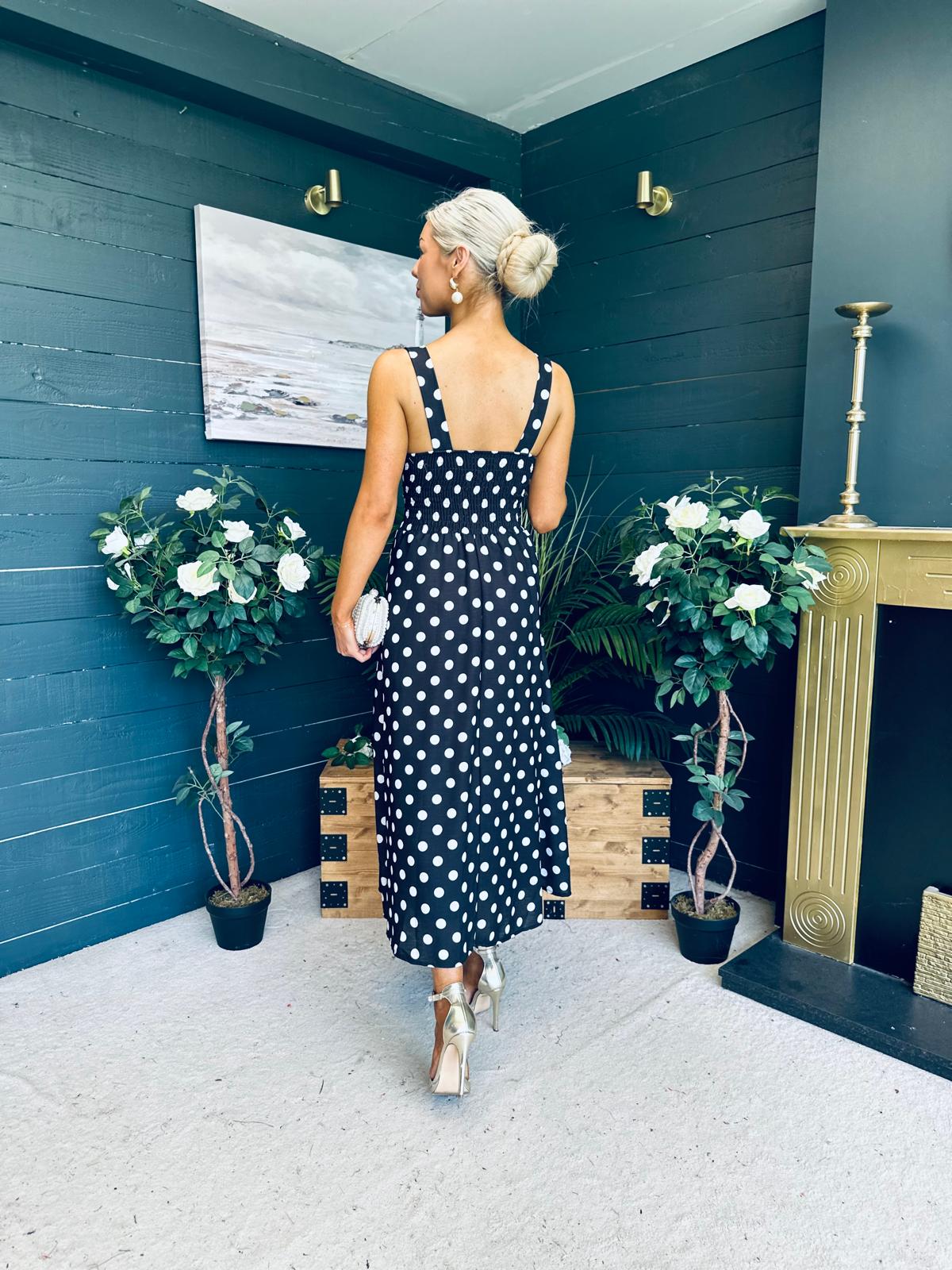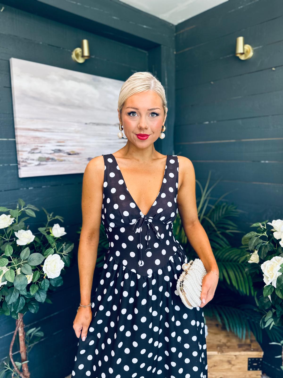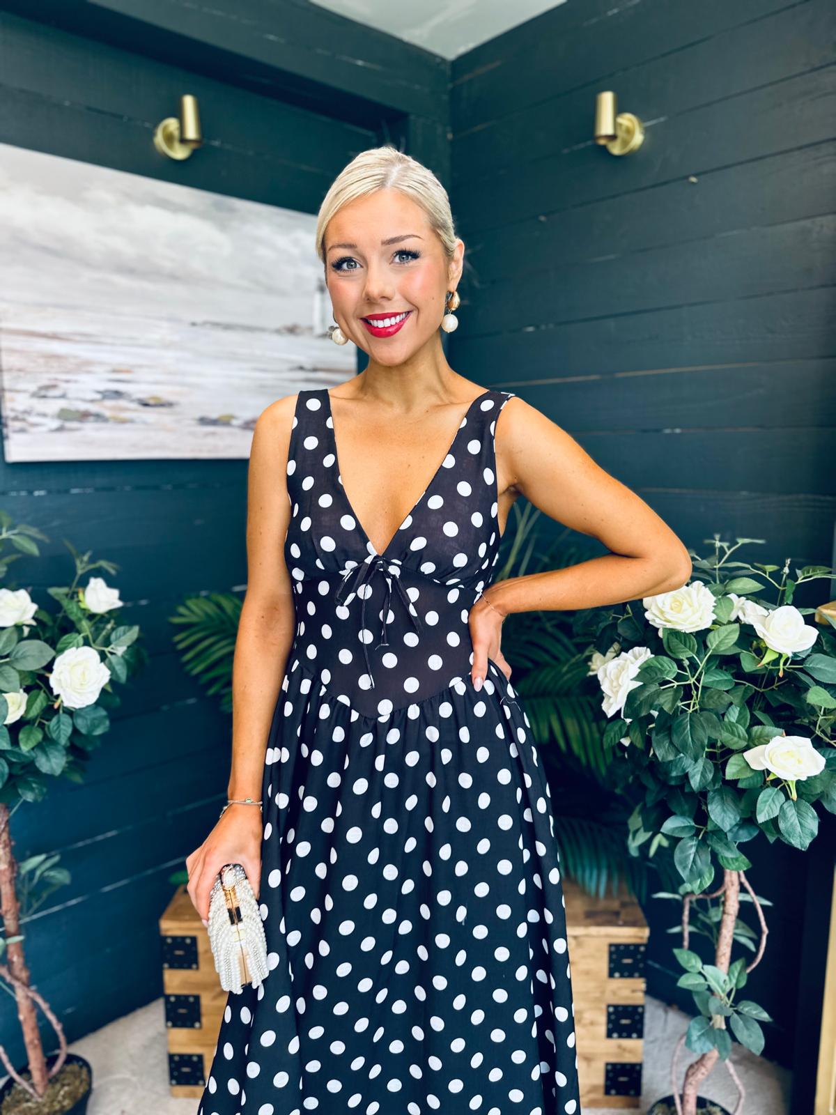 This dress comes in the most amazing polka fabric with beautiful neckline, banded midriff with a hint of drop waist detail, elasticated back to cinch and flowing skirt to flatter