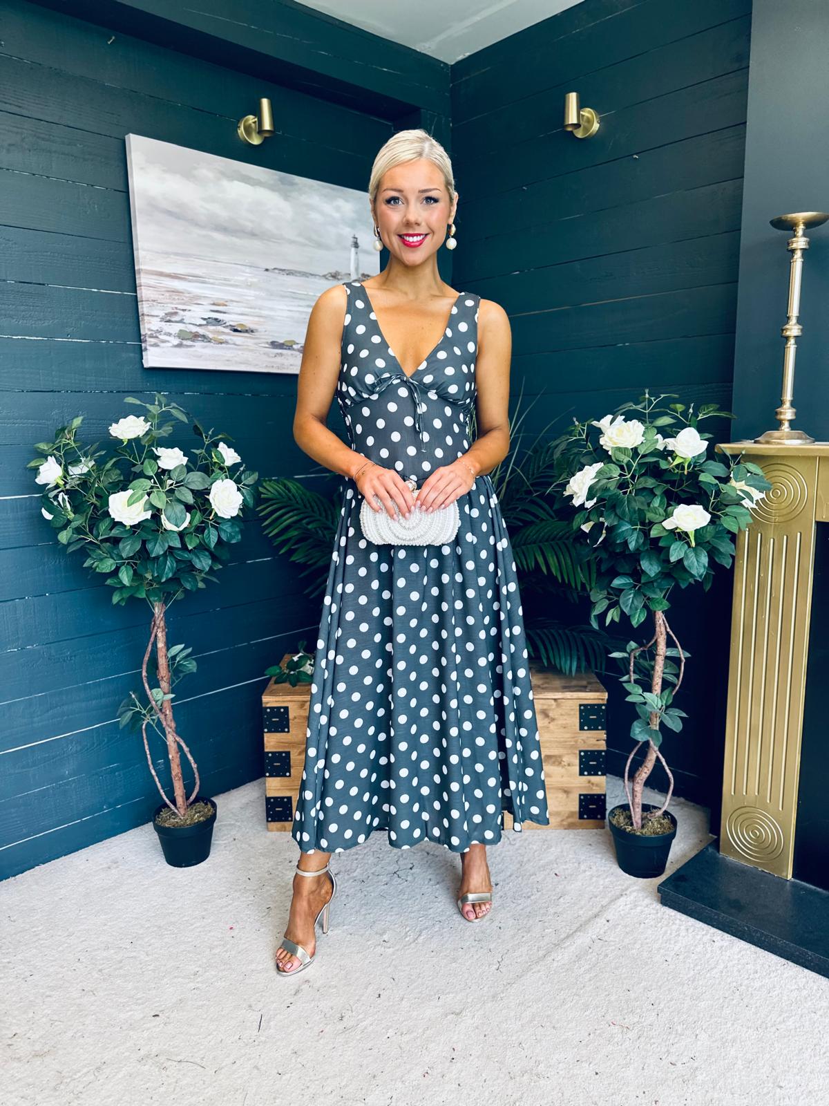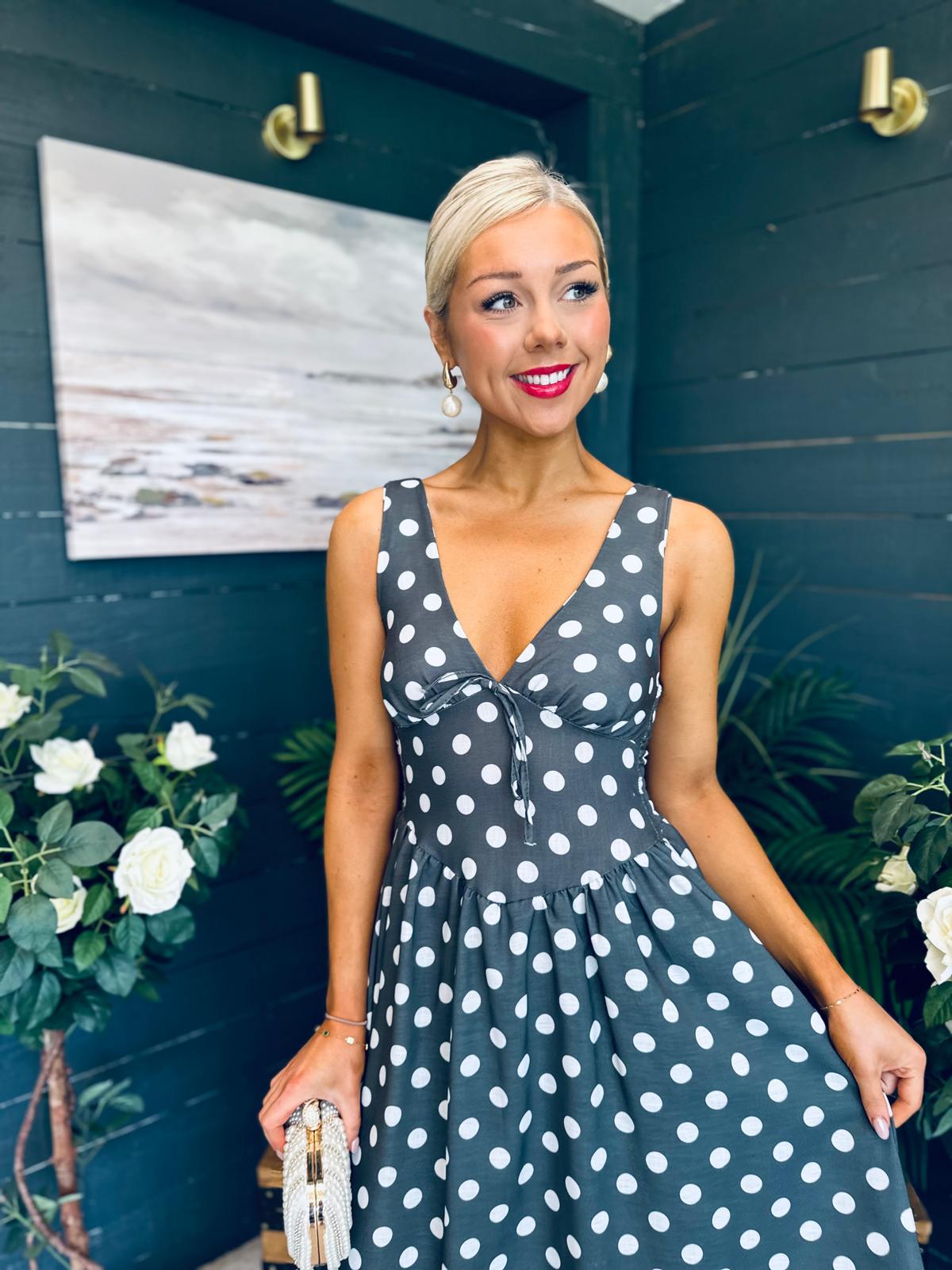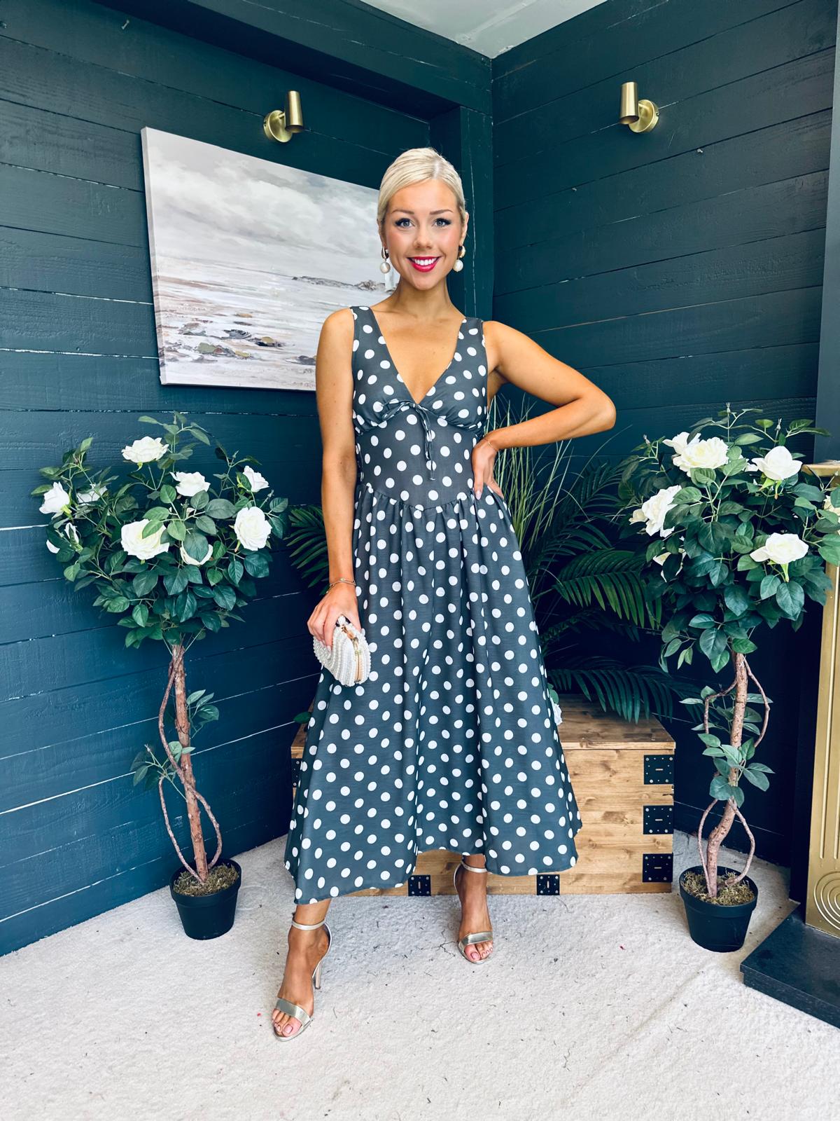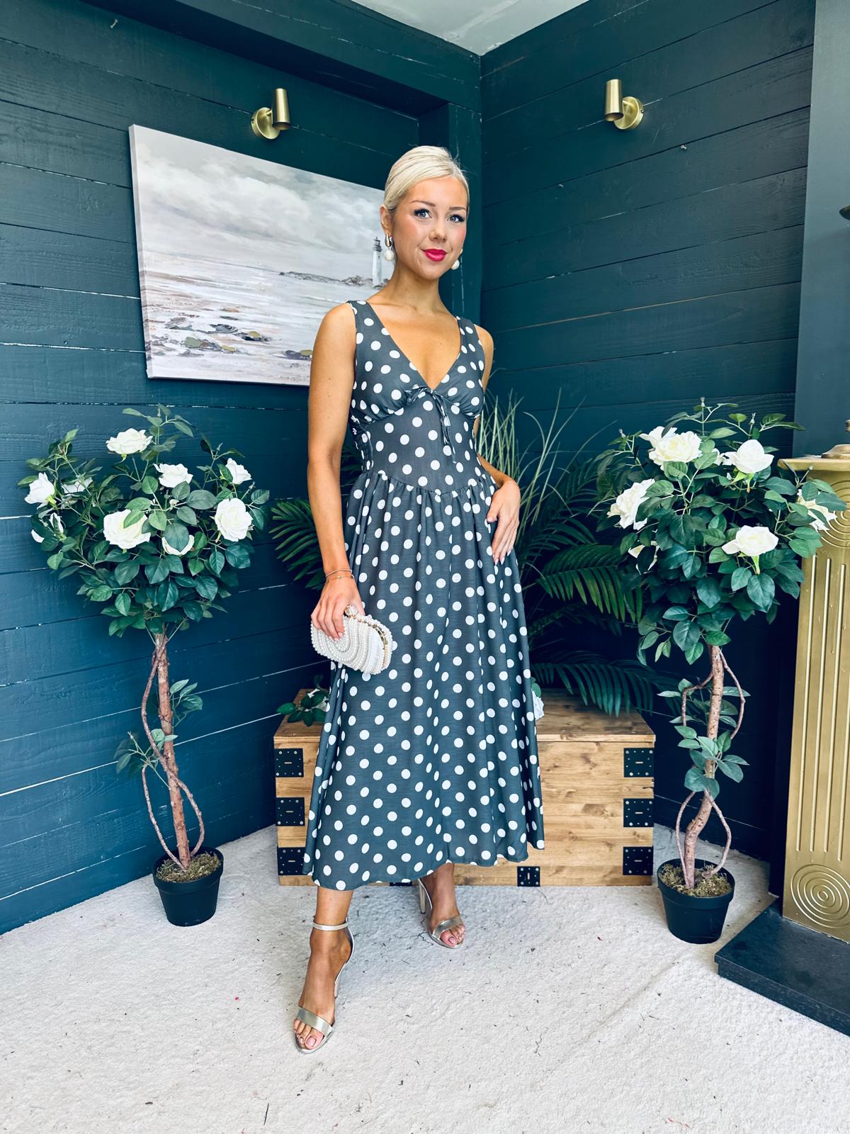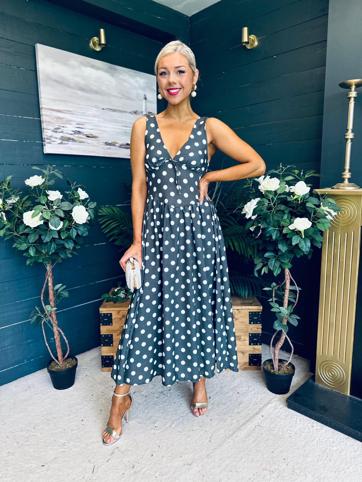 This dress comes in the most amazing polka fabric with beautiful neckline, banded midriff with a hint of drop waist detail, elasticated back to cinch and flowing skirt to flatter