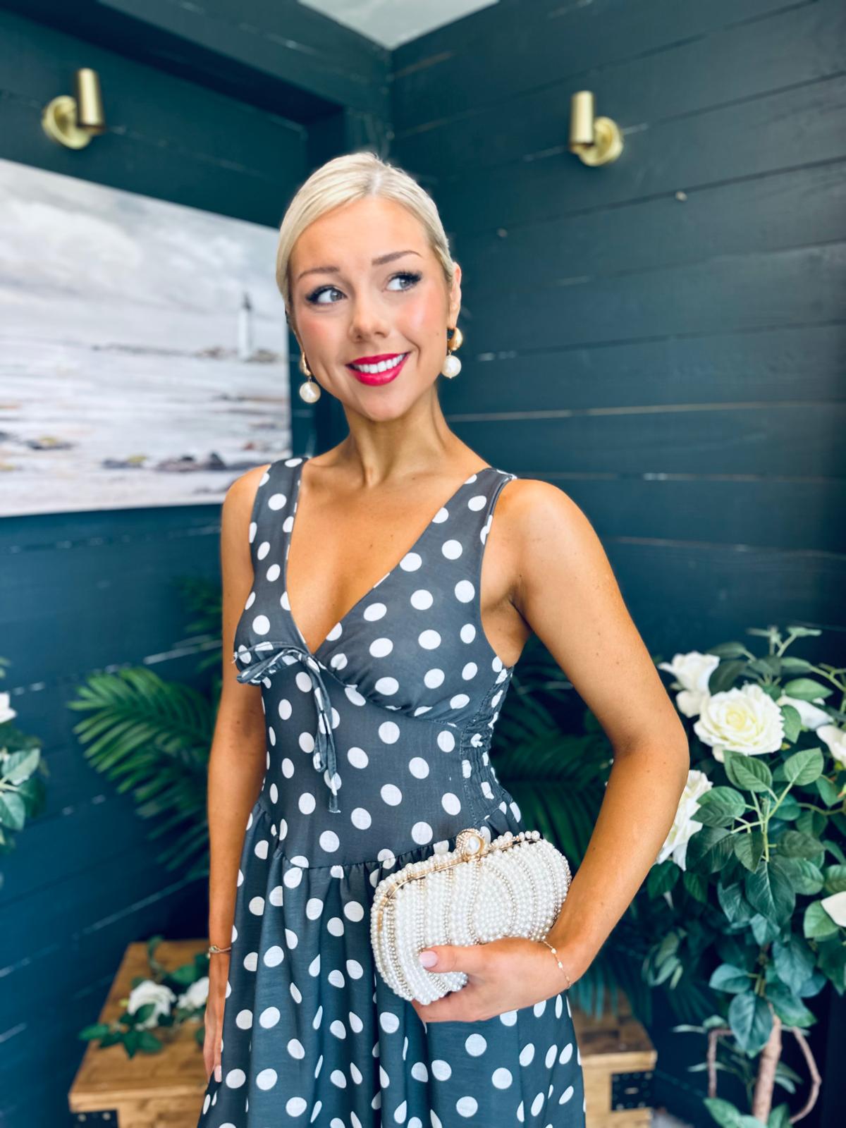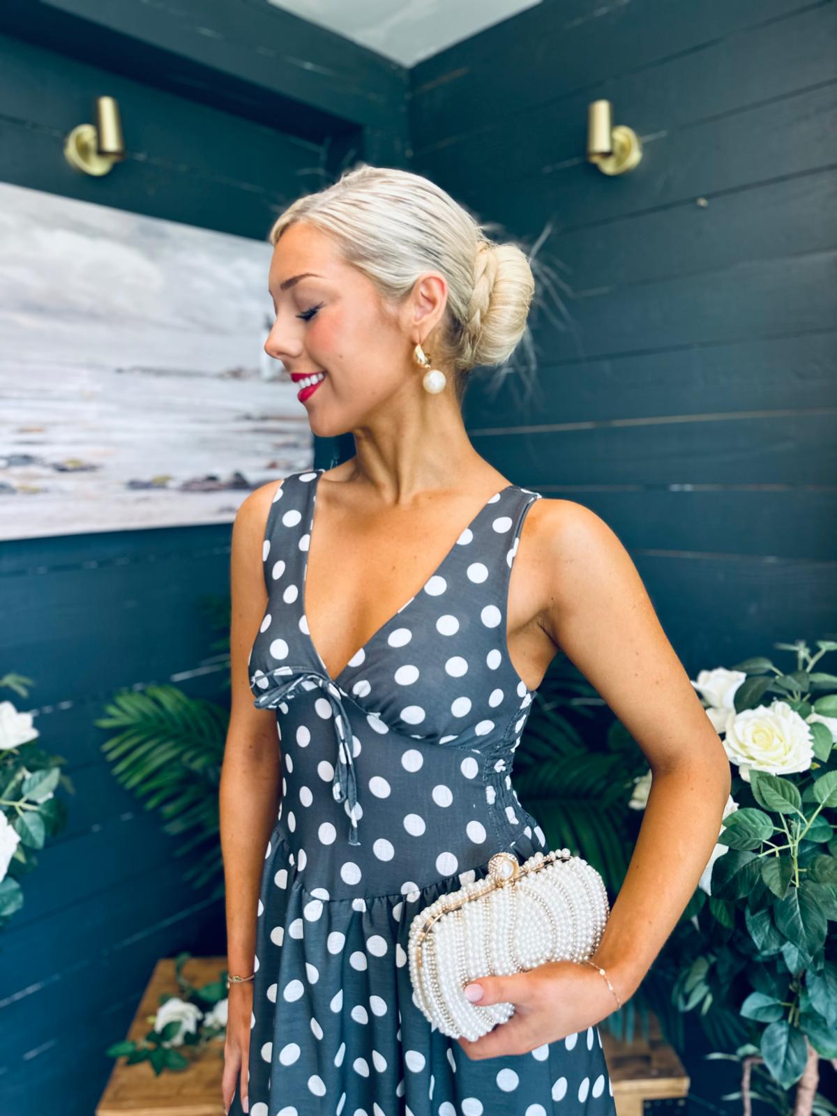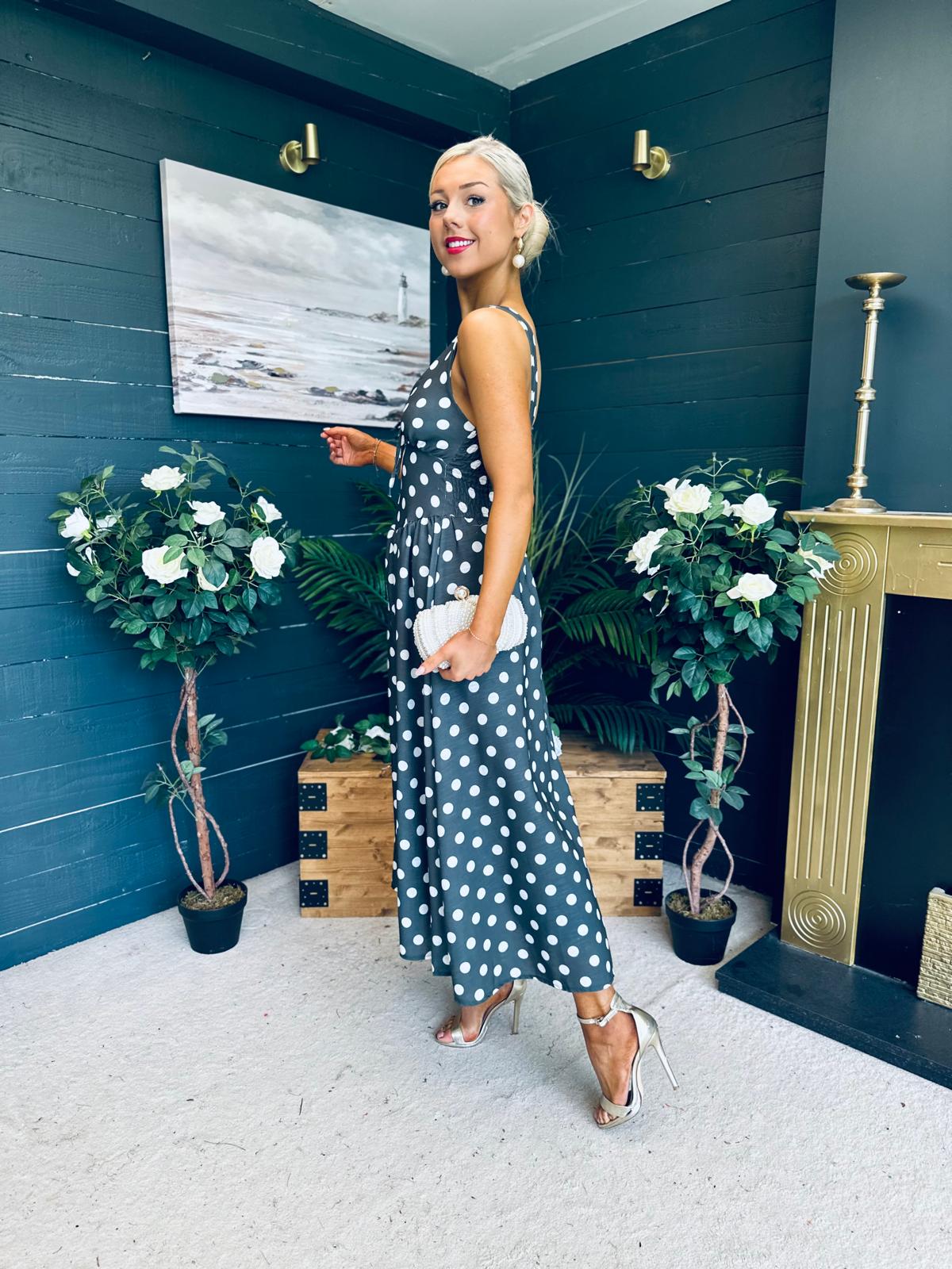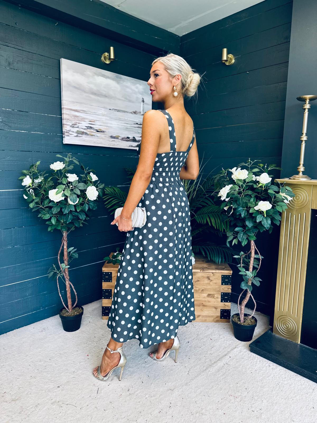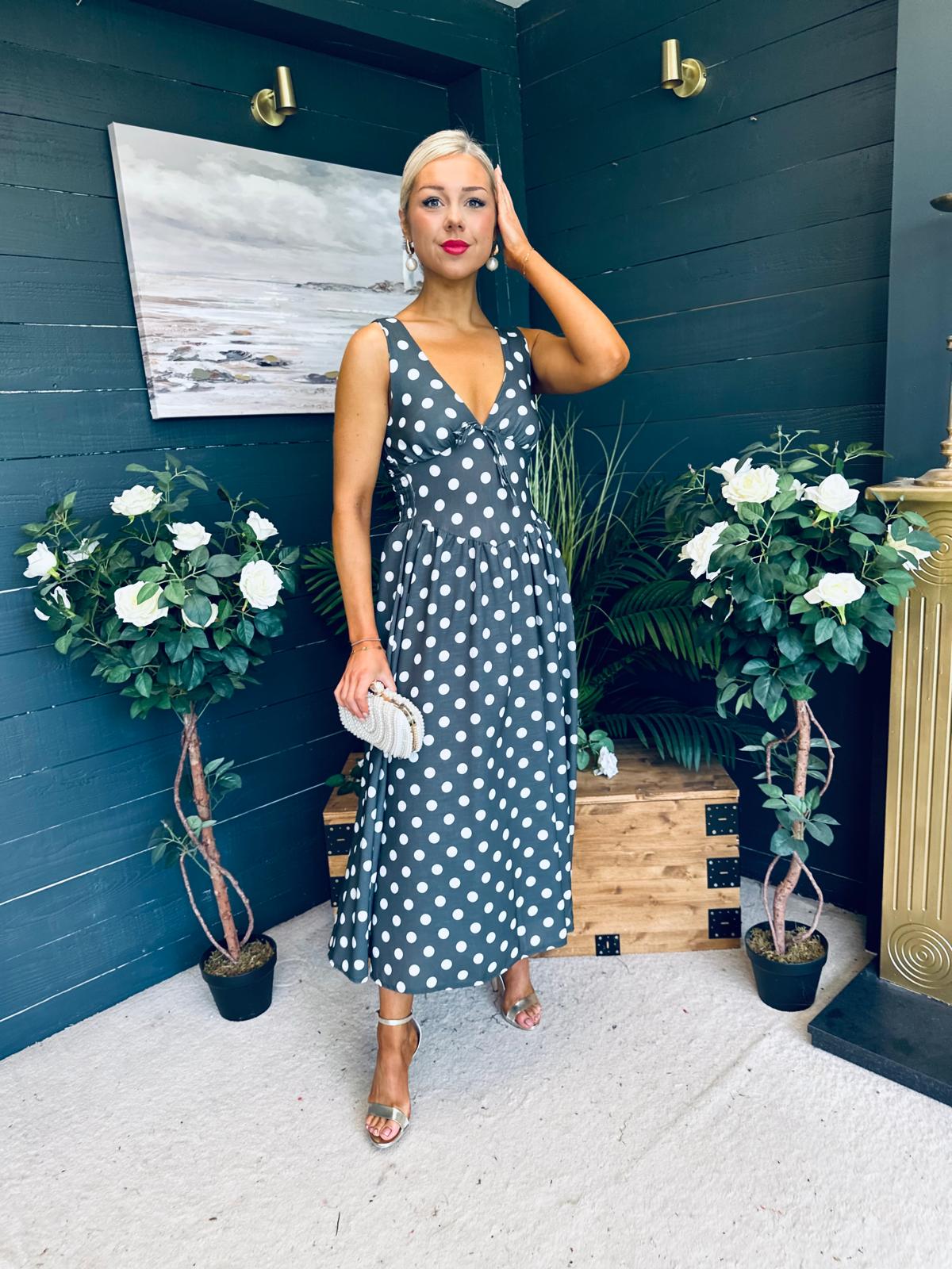 This dress comes in the most amazing polka fabric with beautiful neckline, banded midriff with a hint of drop waist detail, elasticated back to cinch and flowing skirt to flatter