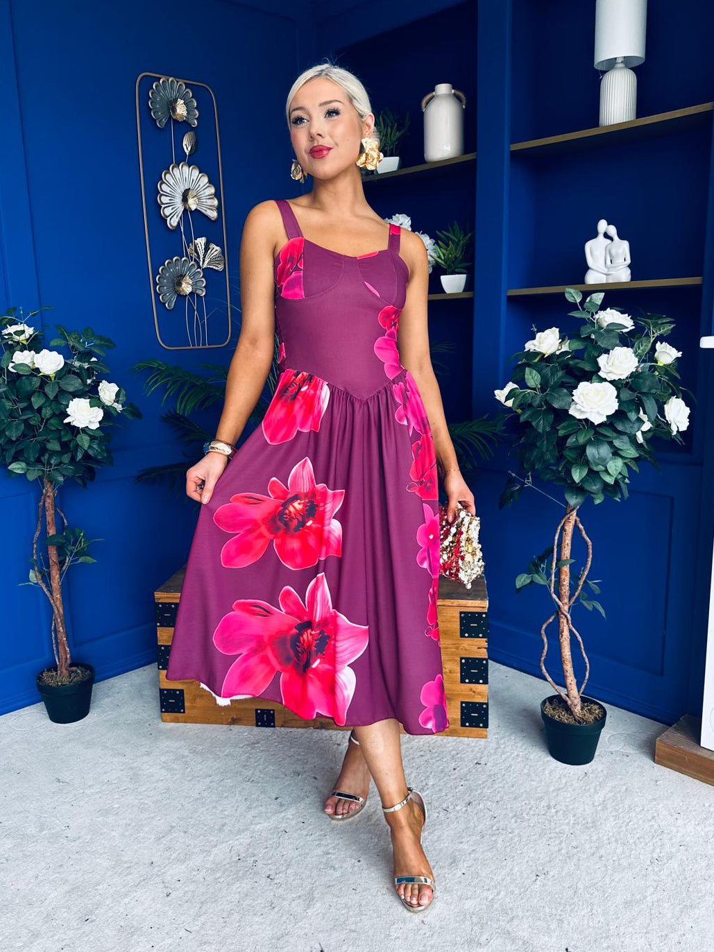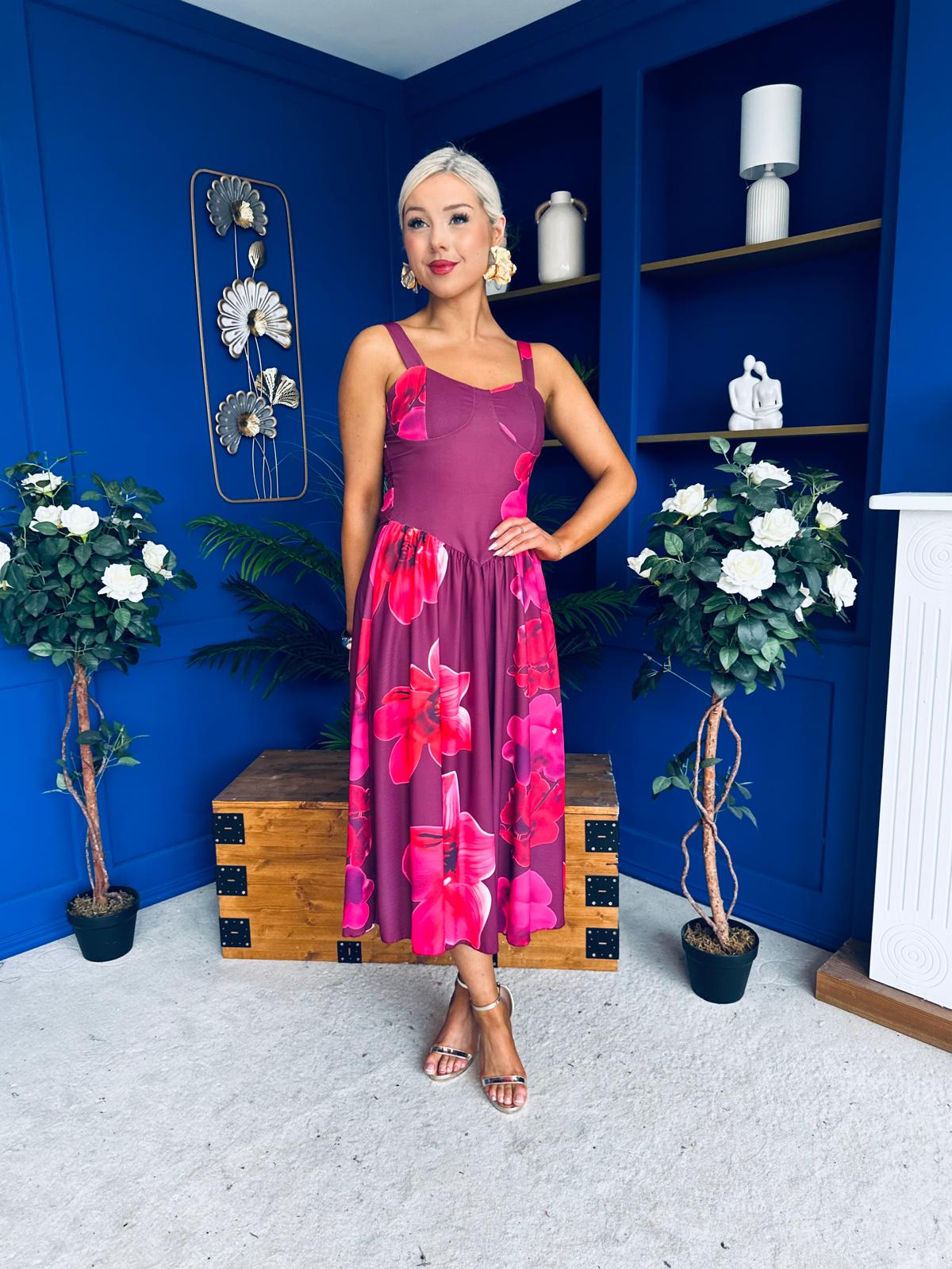 Jude Drop Waist Midi Dress Floral Berry