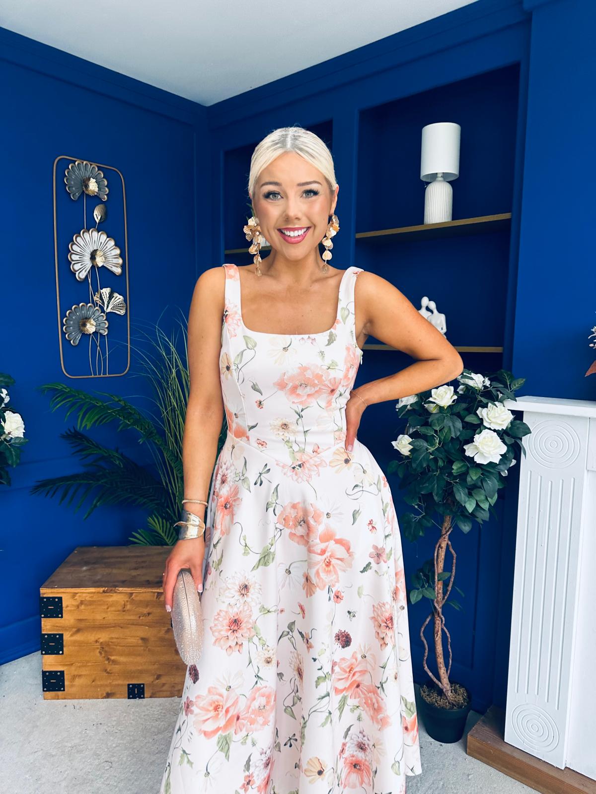 Renew your spring/summer wardrobe with our gorgeous Multi Floral Print Square Neck A-line Midi Dress.