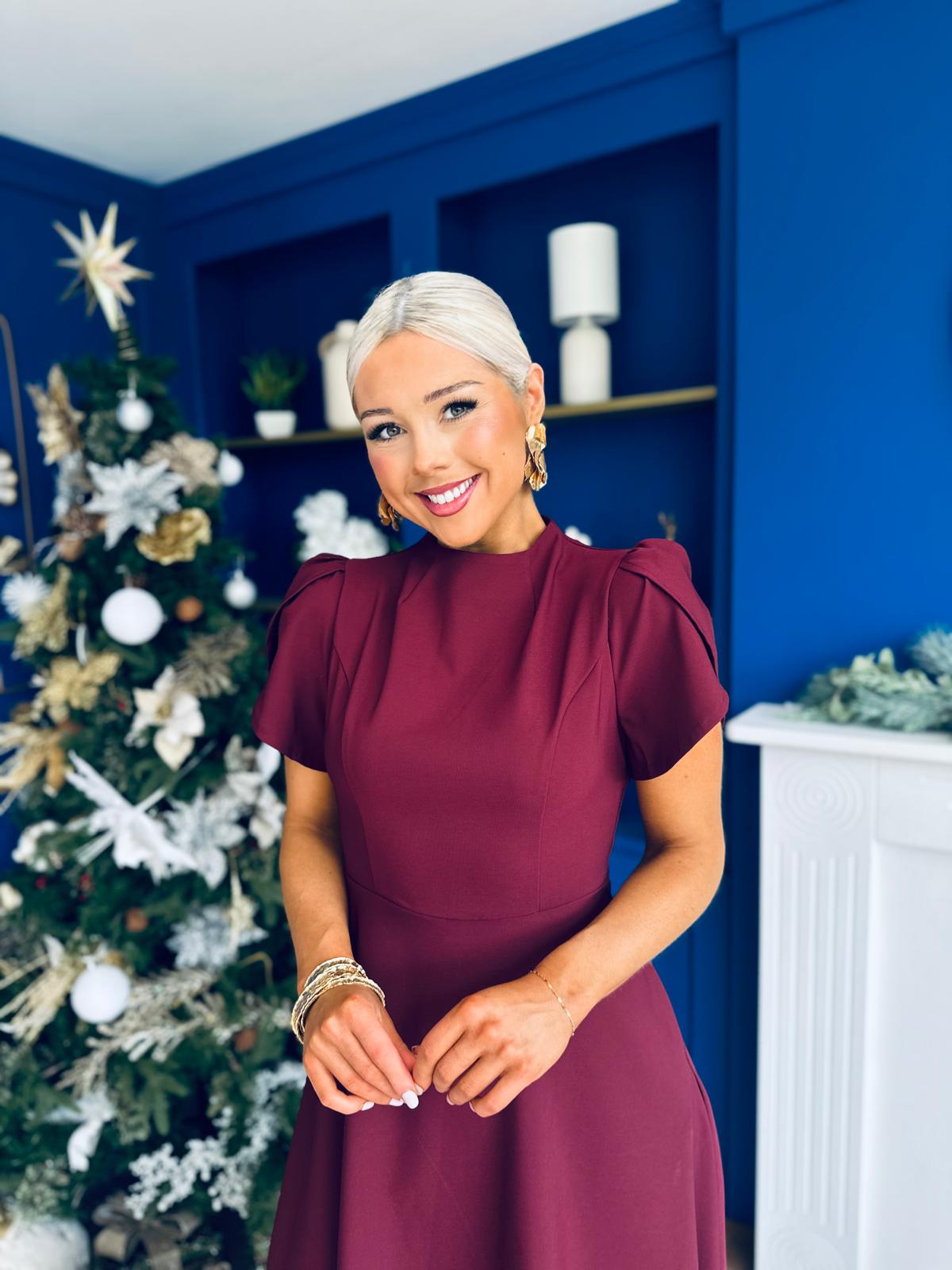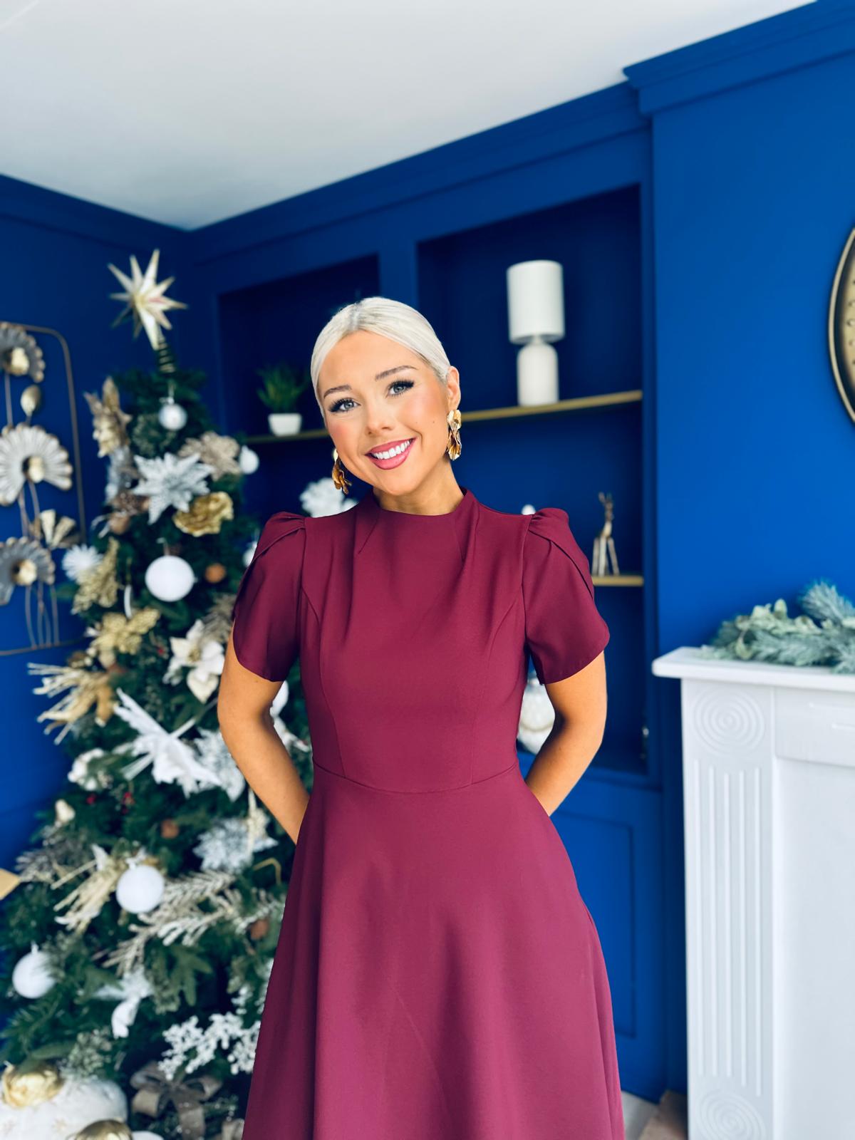 Katisha Tulip Sleeve High Neck Midi Dress Burgundy