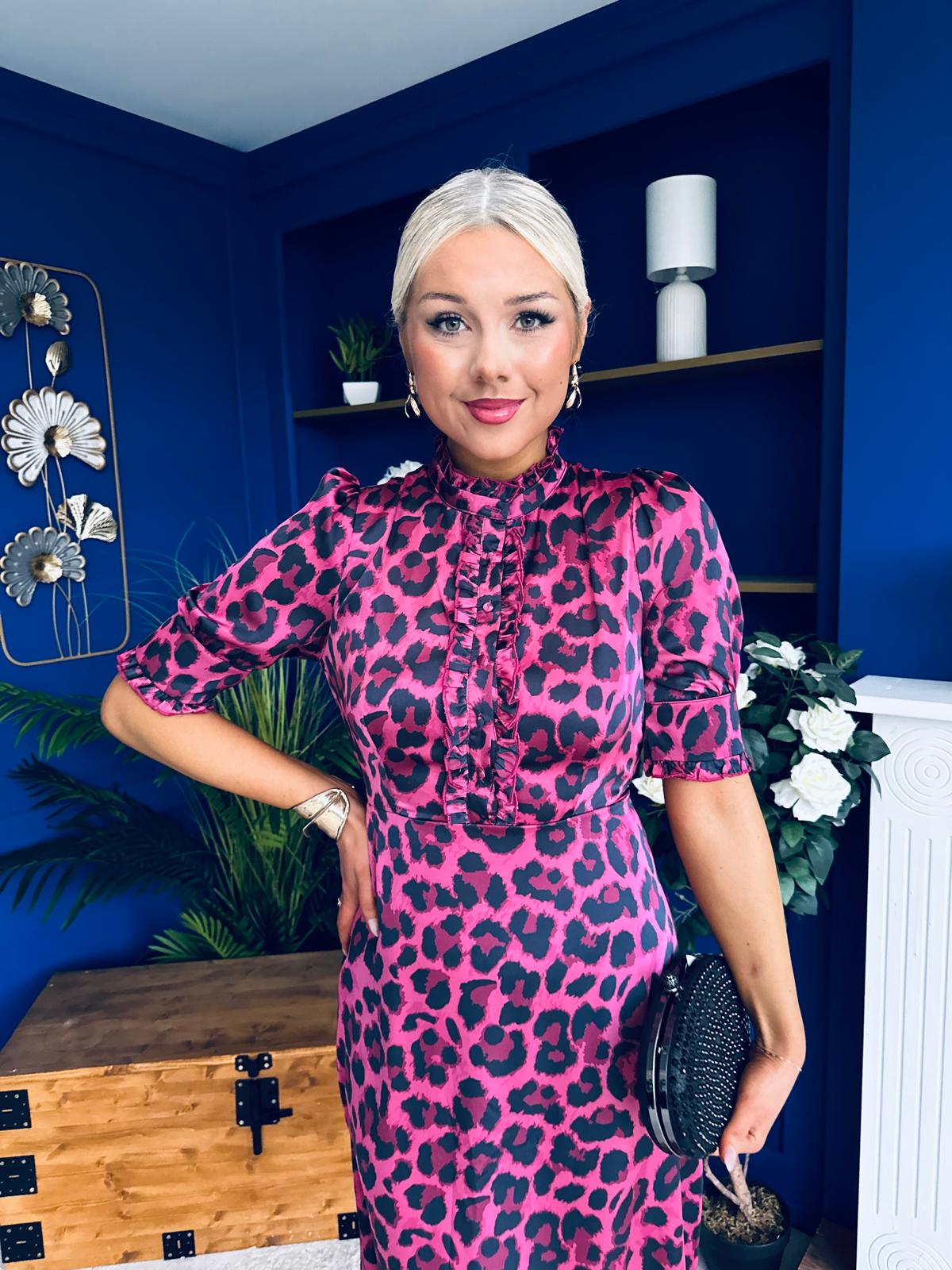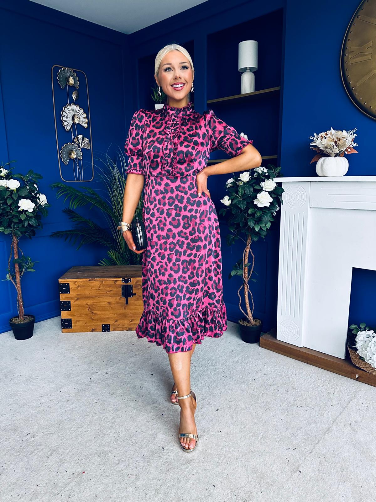 Kirsty Ruffle Hem Midi Dress Pink Leopard