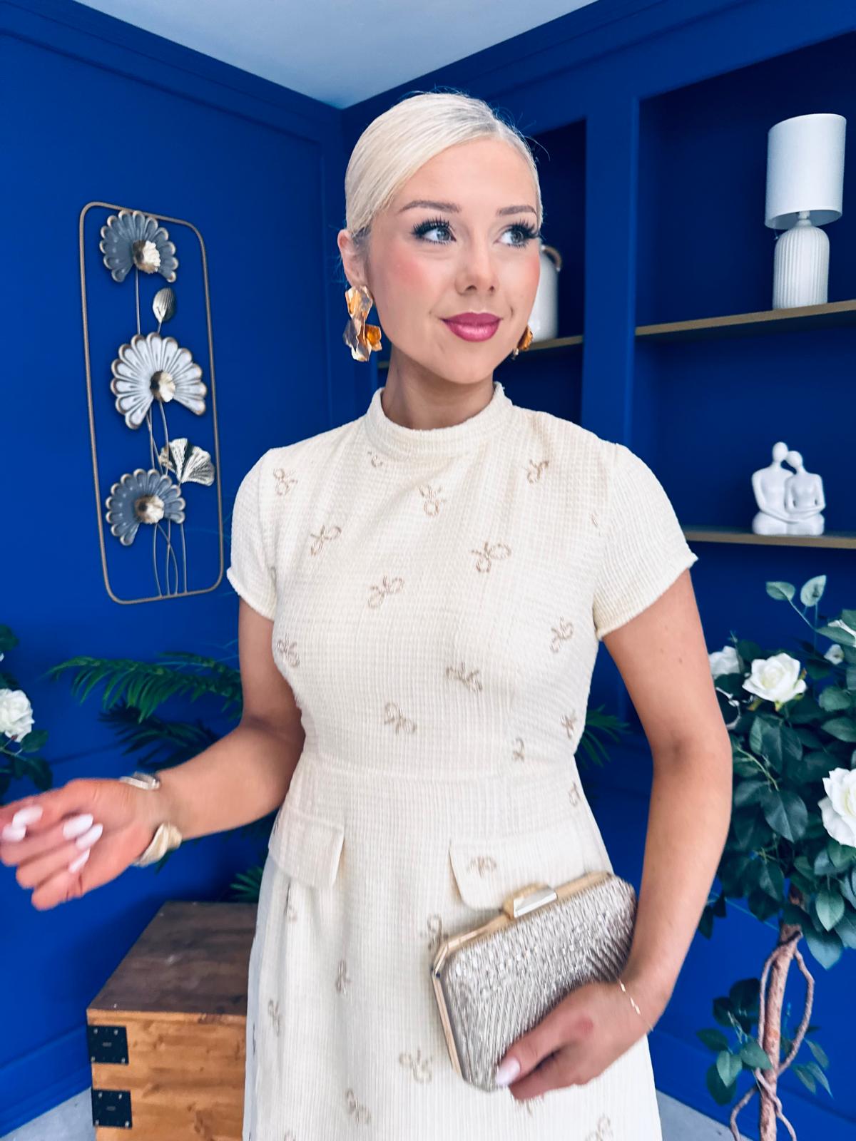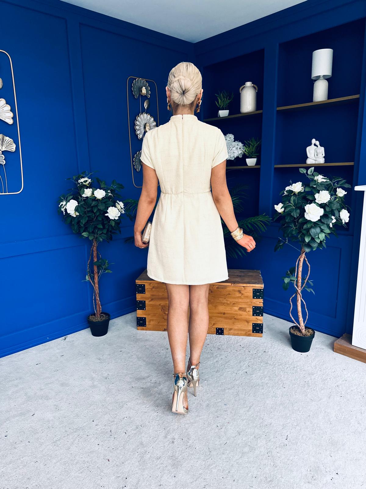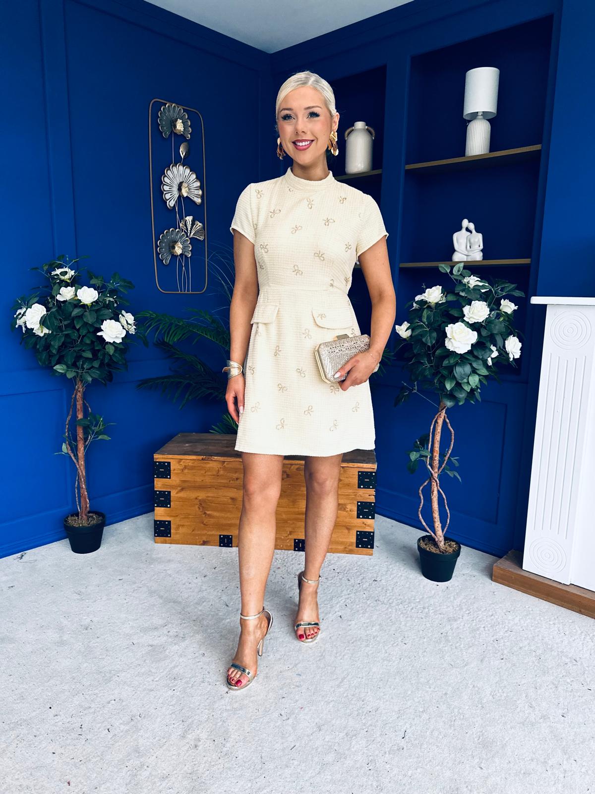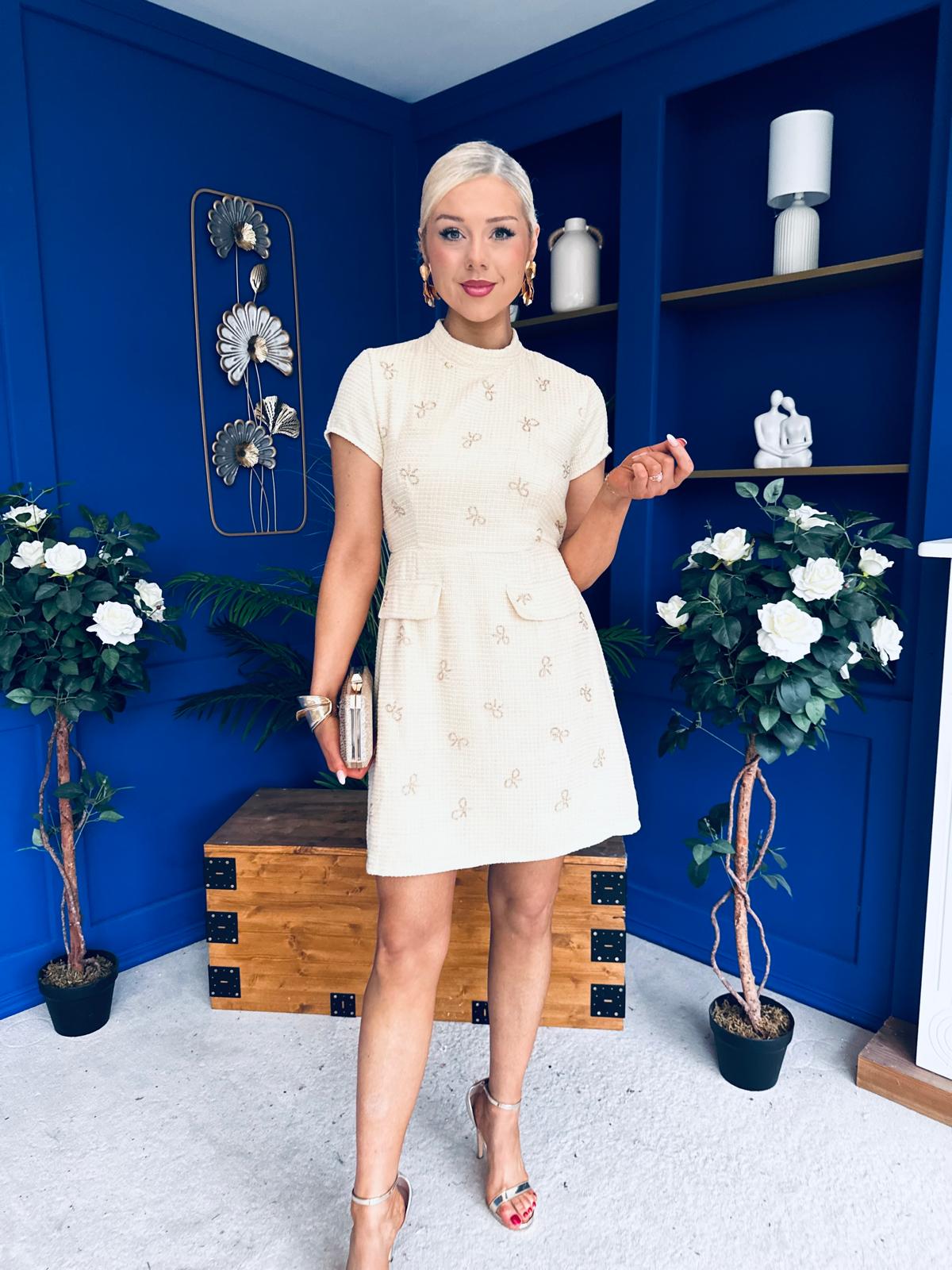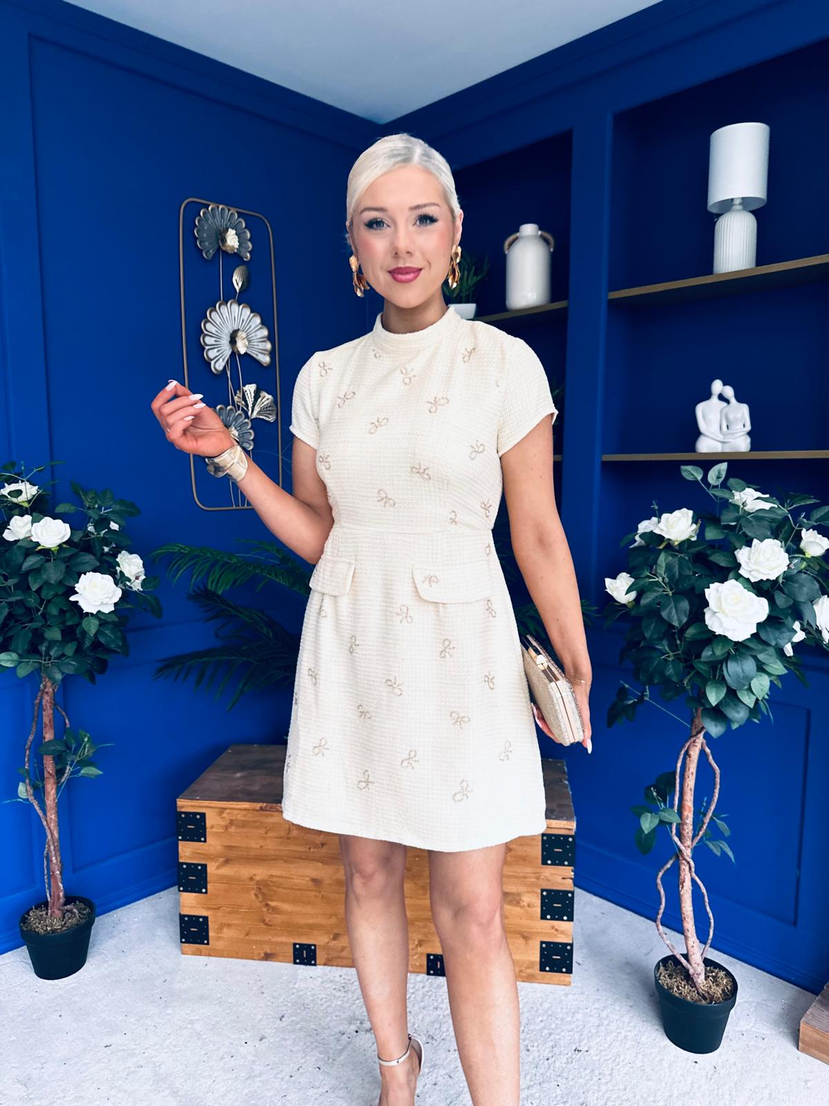 Laureen Gold Bow Embellished Tweed Mini Dress Yellow