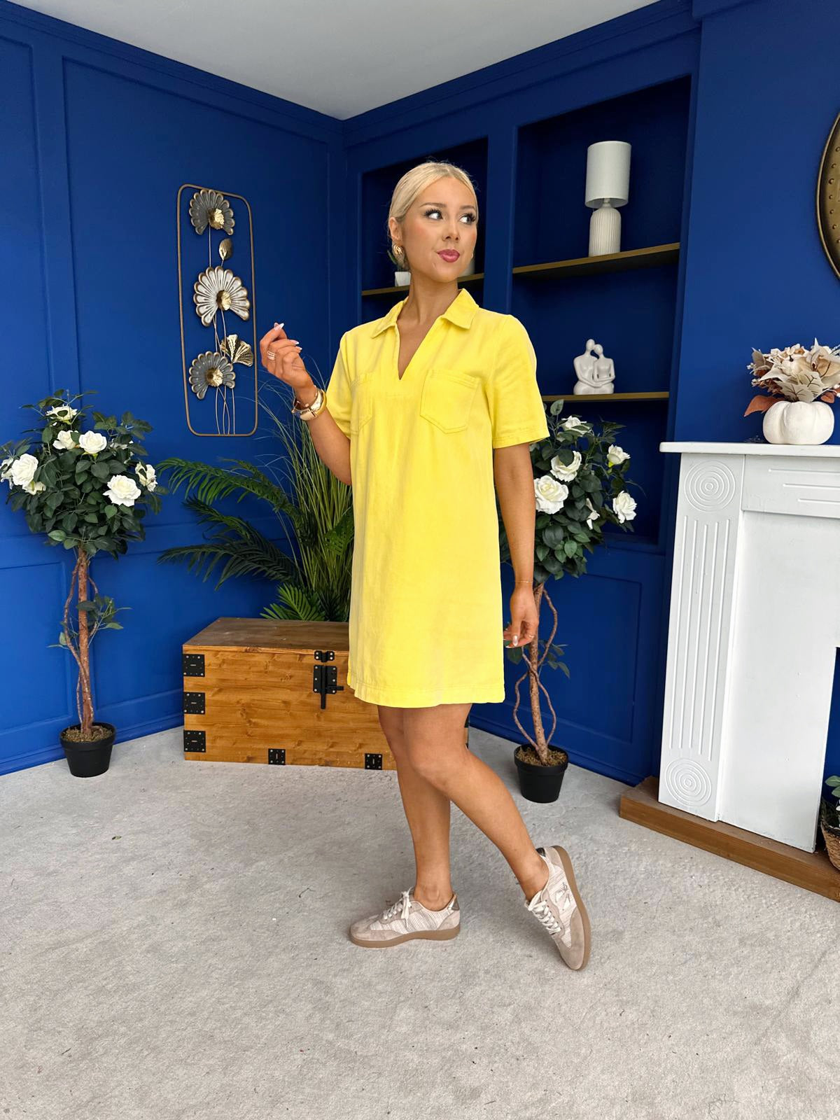 Our fabulous new denim dress with collar and soft V neckline is sure to catch the eye