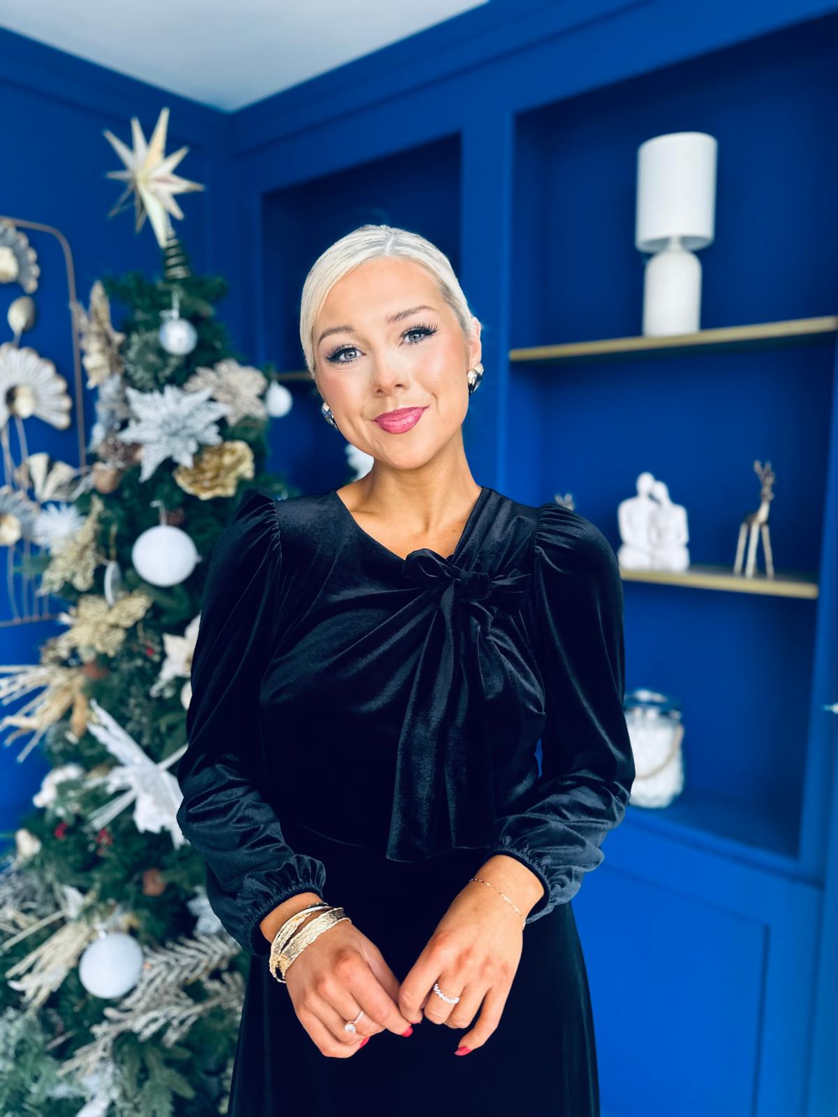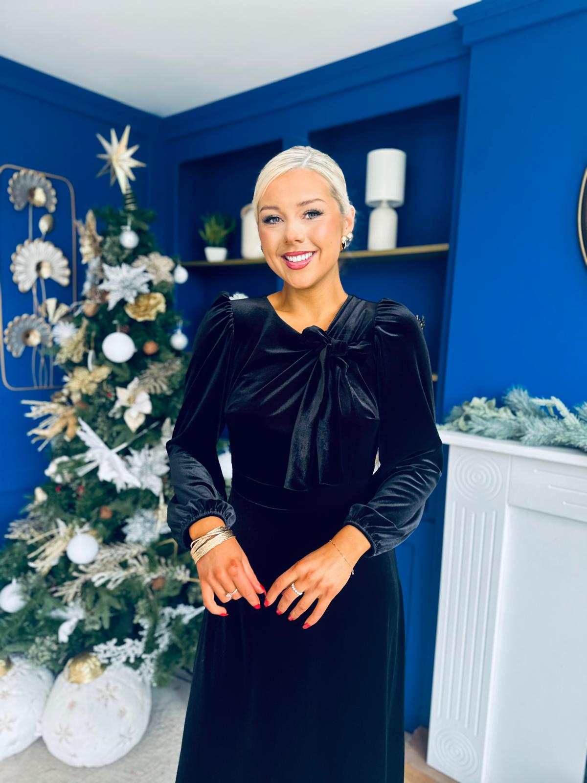 With a full length sleeve, shoulder detail, gathered top with bow and A line skirt this dress just embodies elegance