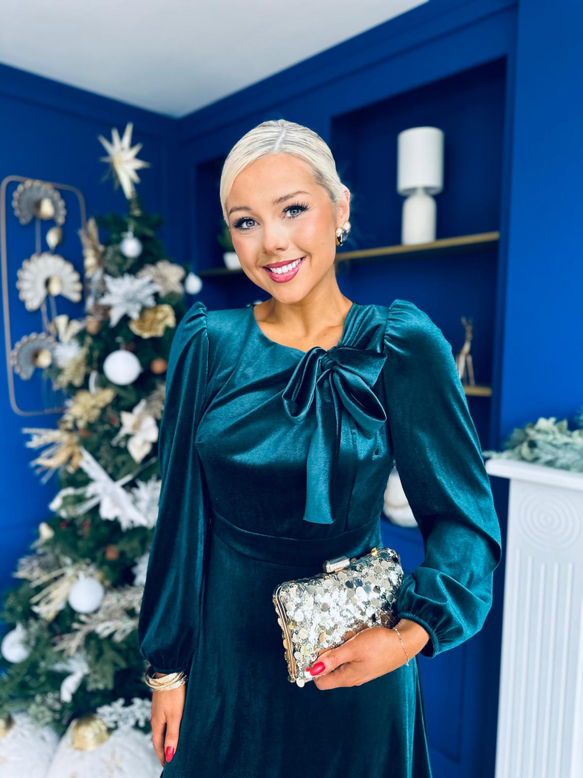 With a full length sleeve, shoulder detail, gathered top with bow and A line skirt this dress just embodies elegance