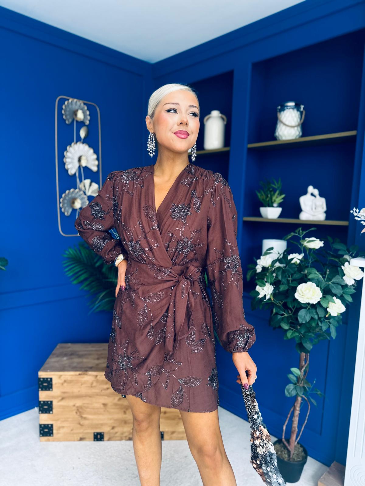 Its dramatic floral detailed fabric, wrap over neckline & full sleeve with banded midriff and faux wrap flowing skirt create a stand out look