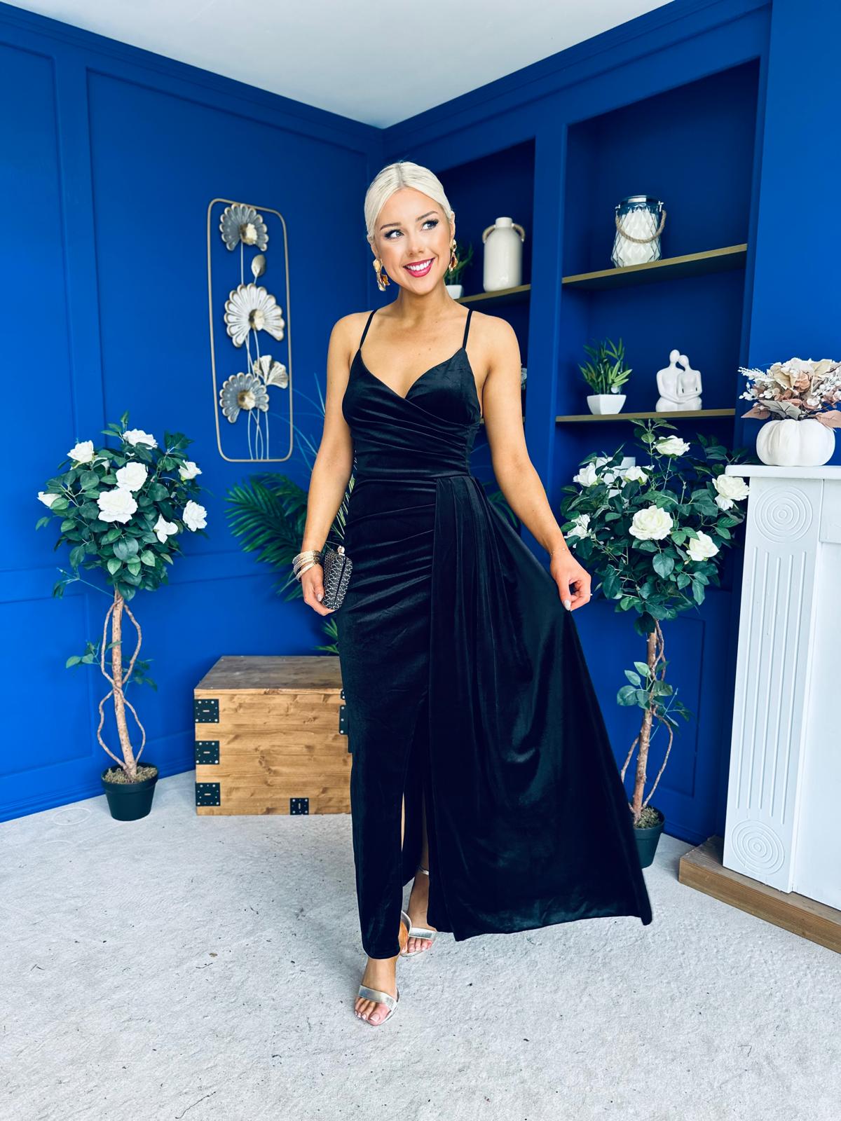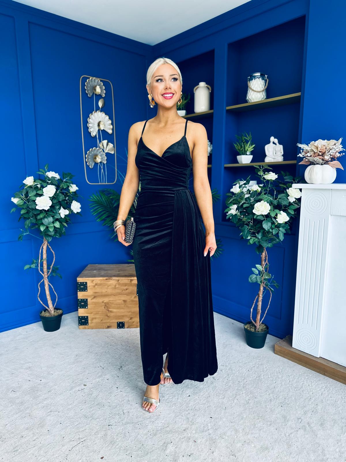 The amazing Libby occasion dress, in a fabulous velvet material, with pleated wrap over neckline and drape detail