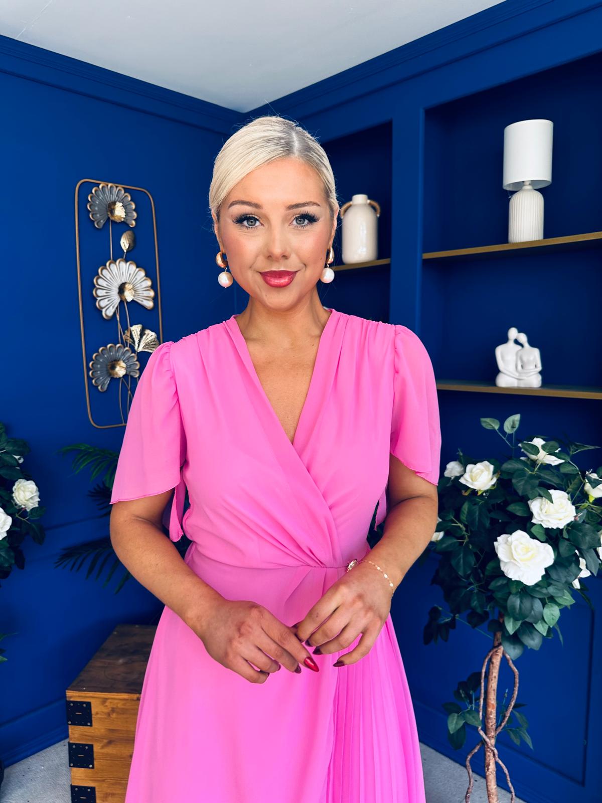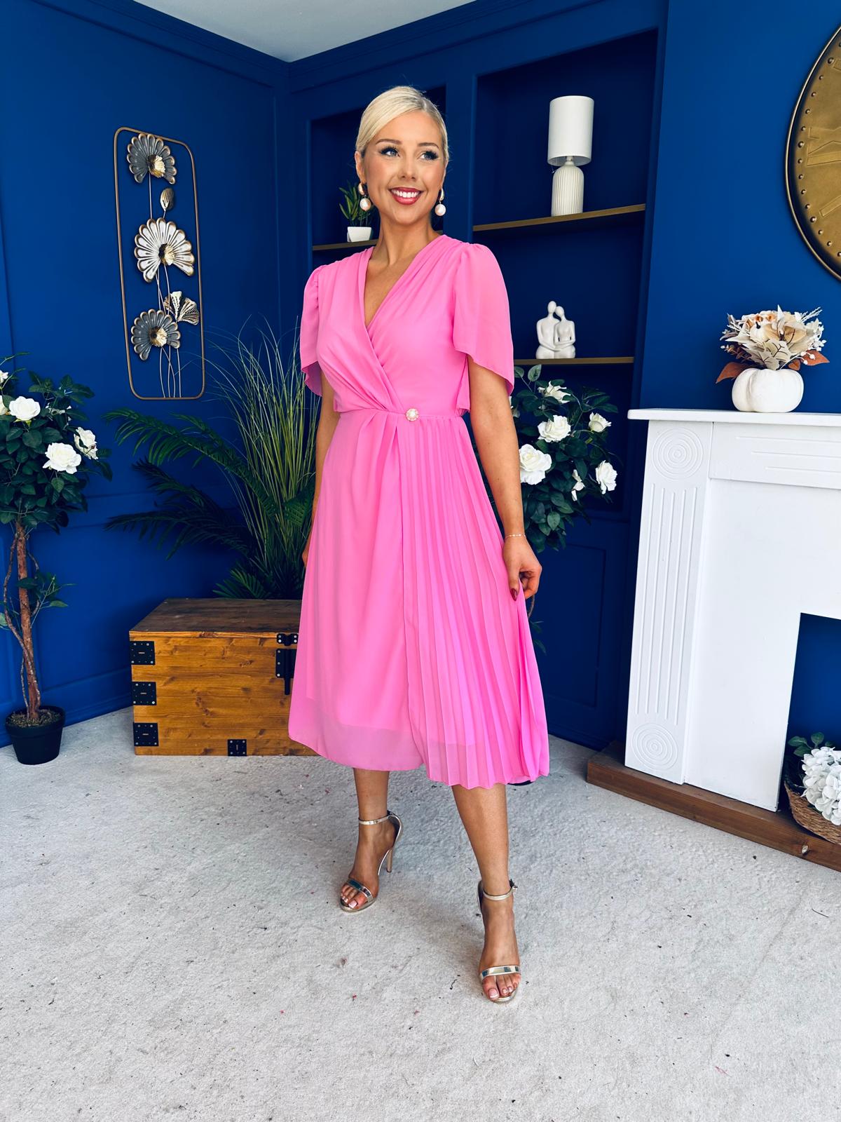 Featuring a wrap over neckline, sheer asymmetric sleeve, elasticated waist with button detail and flowing skirt with pleat section for a statement silhouette and a flattering look, this dress will make you feel and look your best.Β