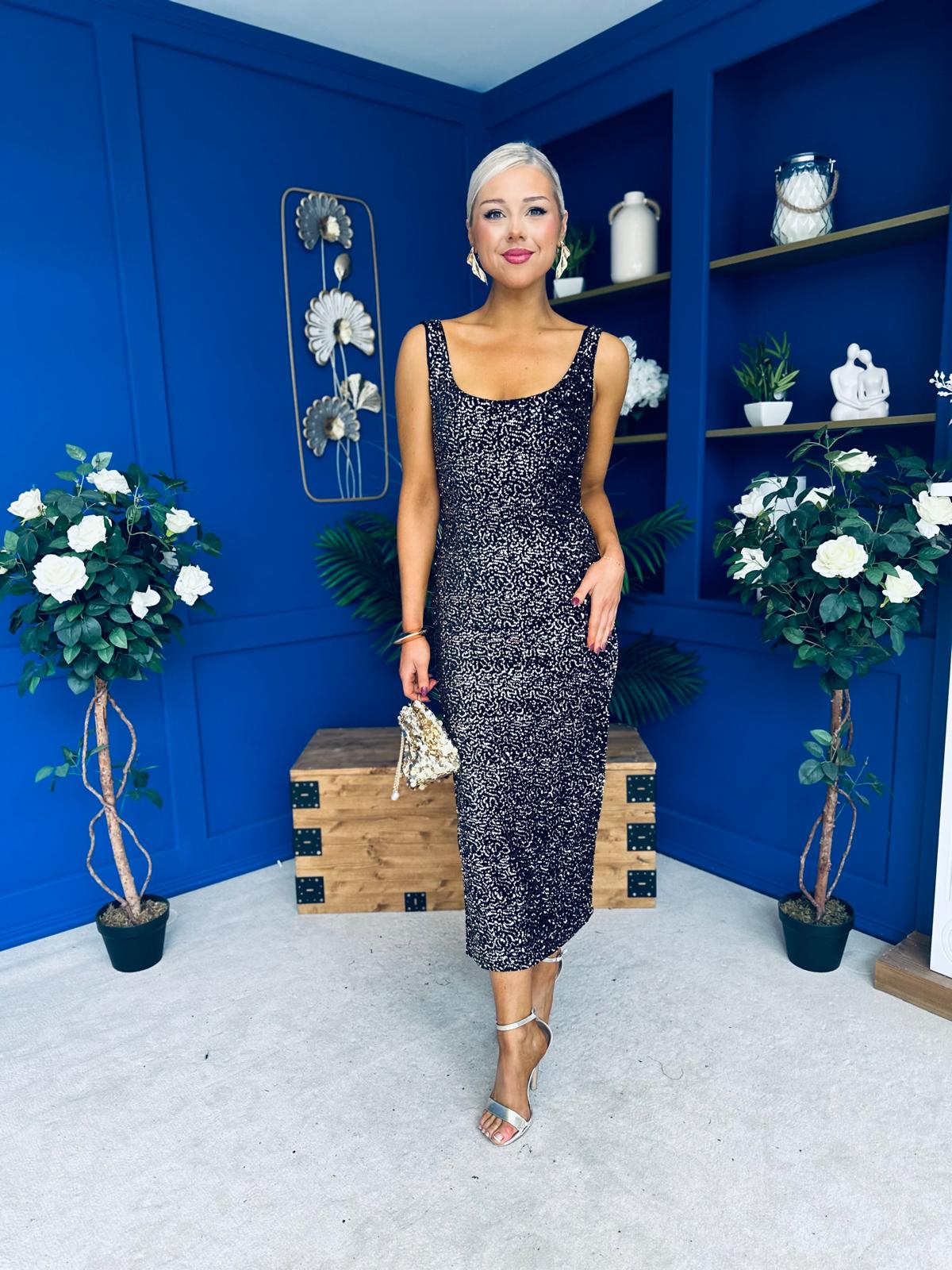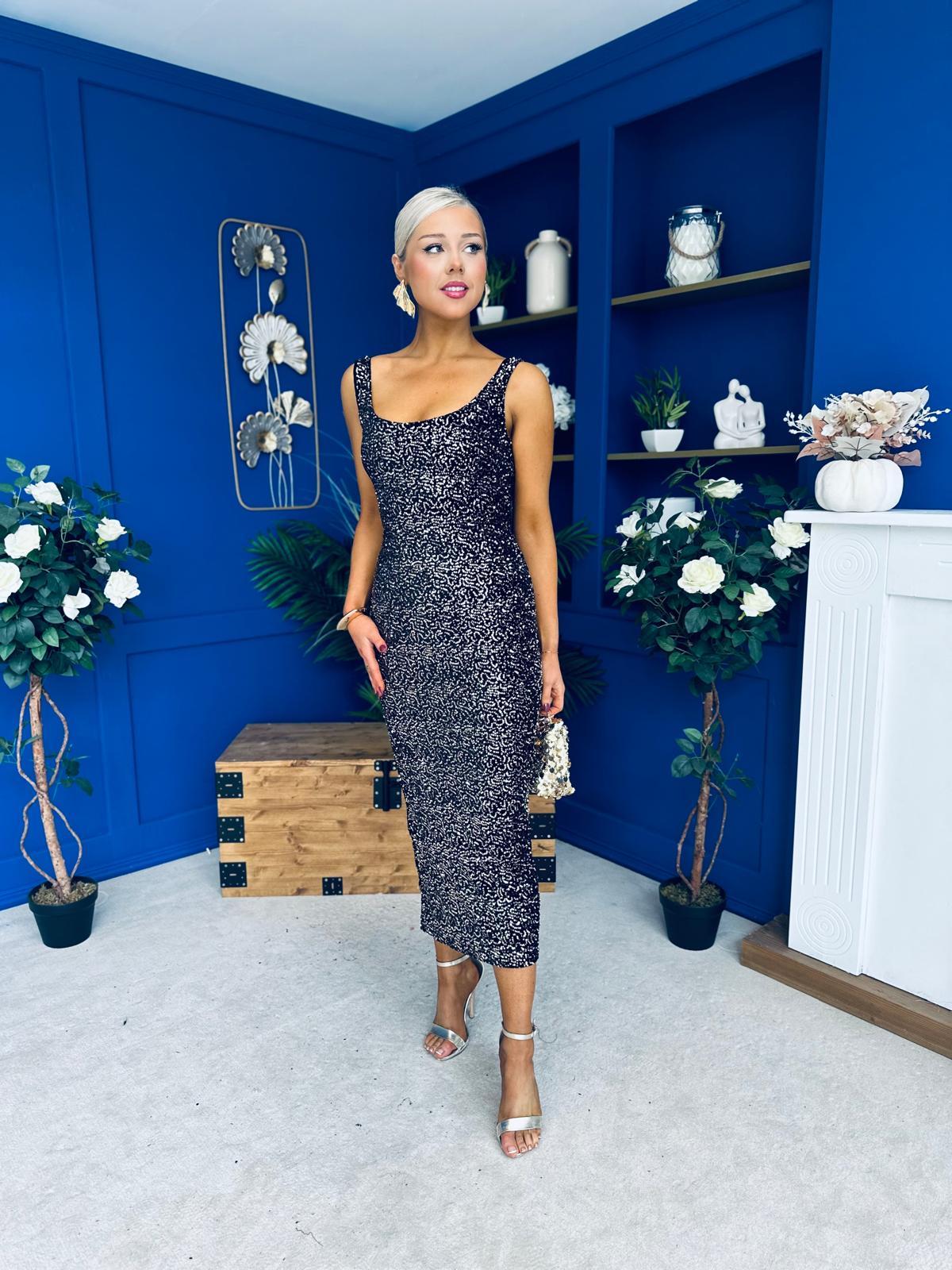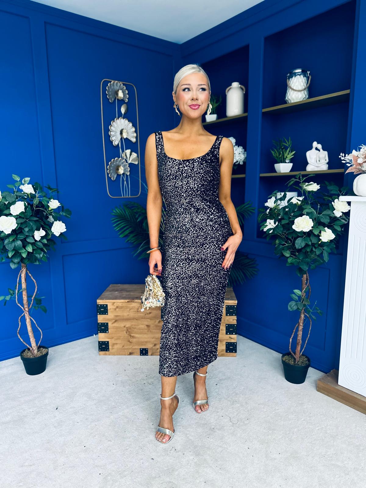 Our stunning Mabel Sequin Midi Dress is the epitome of elegance and luxury.