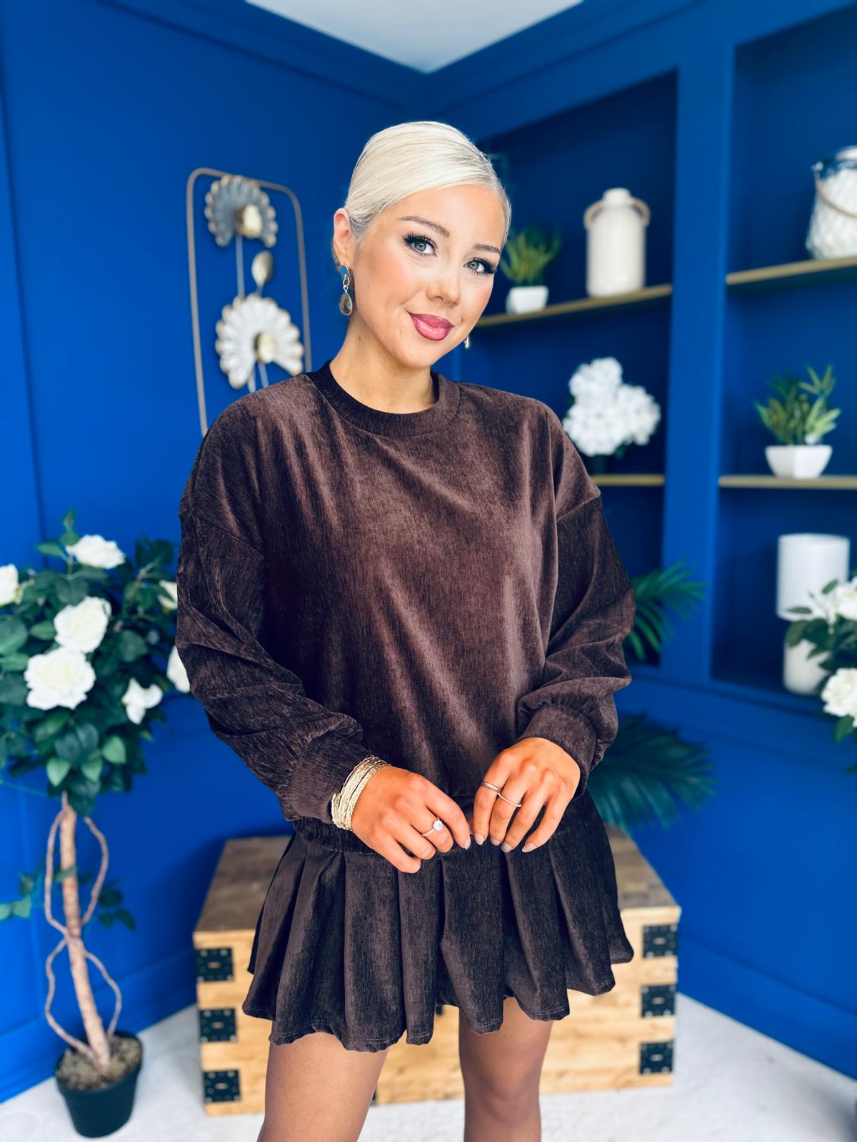 Crafted in a shape holding velvet material, full sleeve and flowing pleated skirt create a stand out country chic look