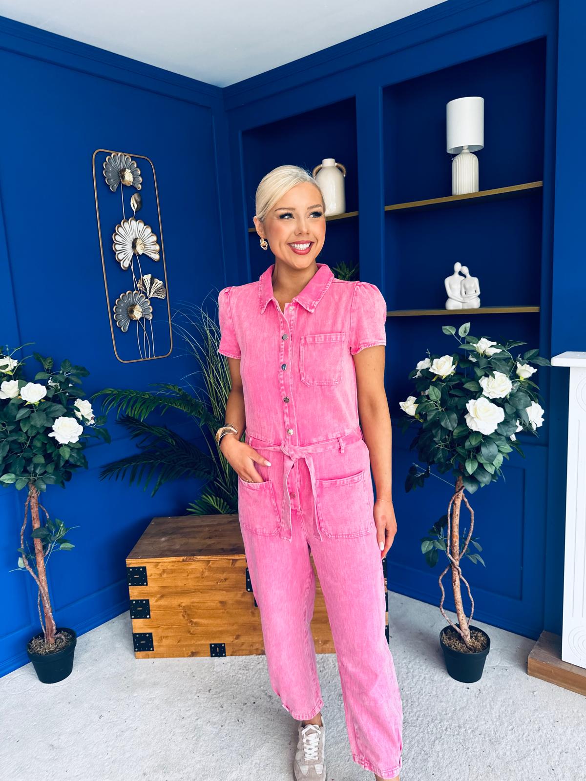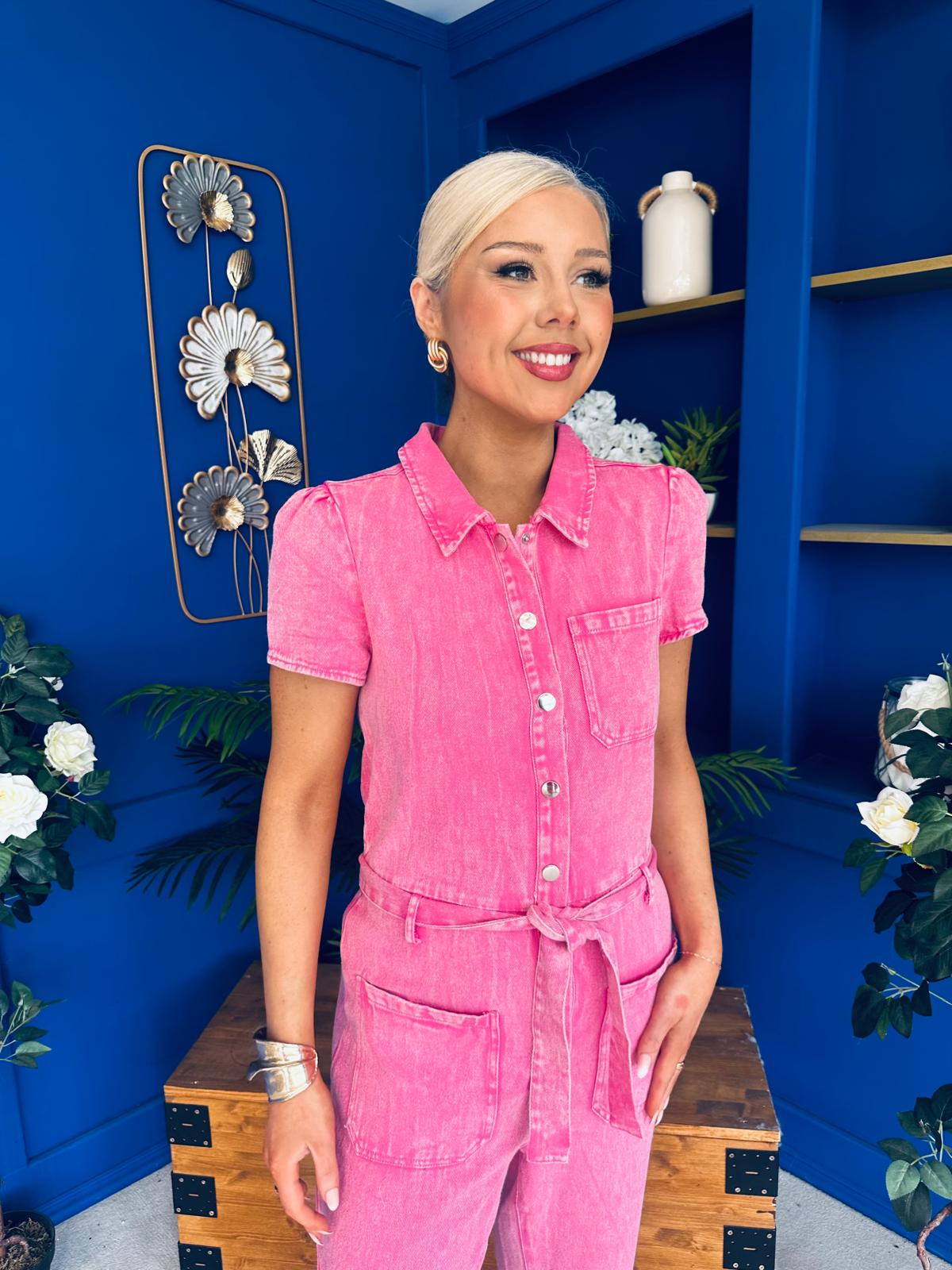 Marissa Short Sleeve Denim Jumpsuit Cerise
