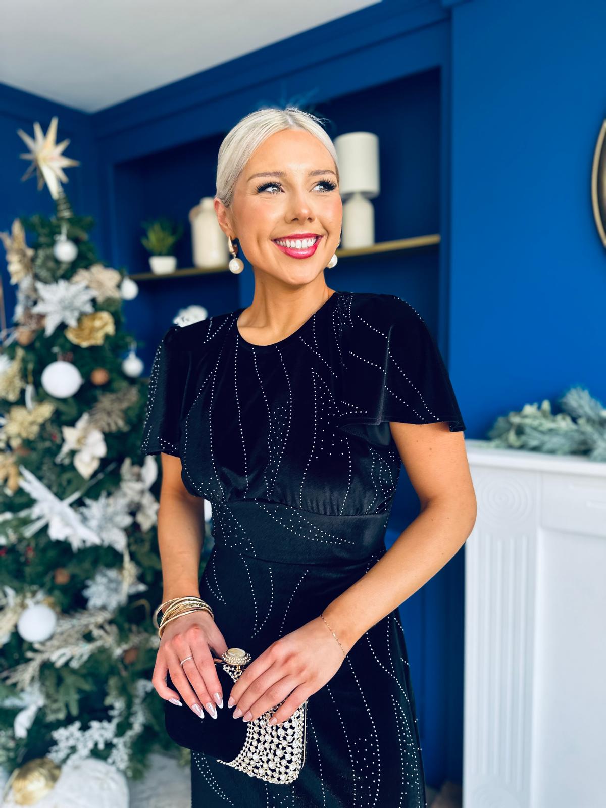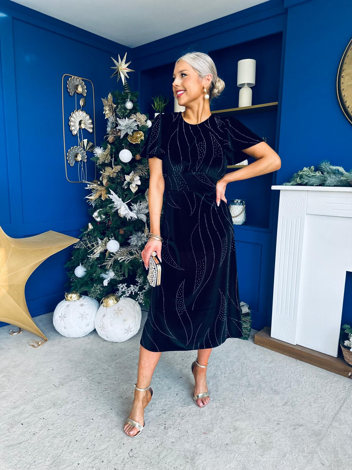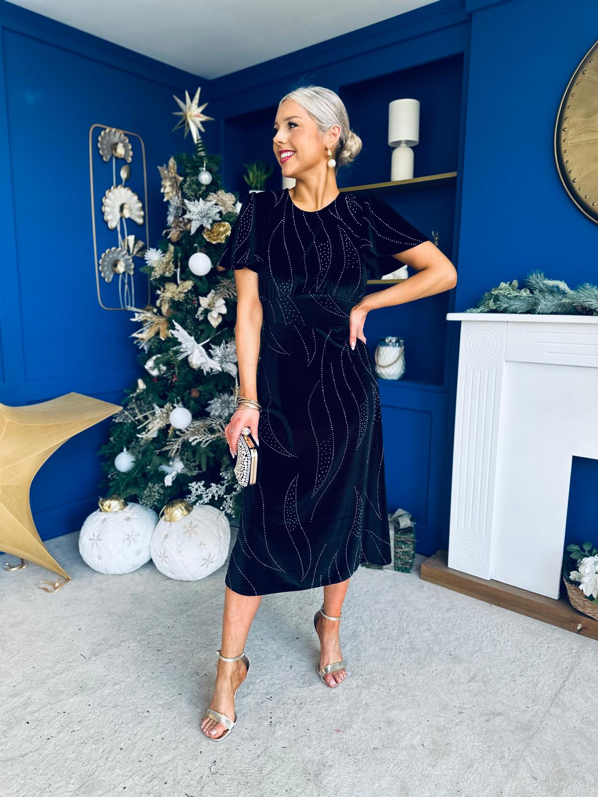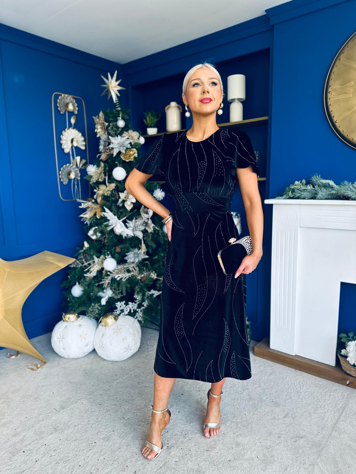 Our new Marissa Studded Leaf design Velvet Dress with Angel sleeve and round neckline, banded waist & flowing skirt is simply fabulous