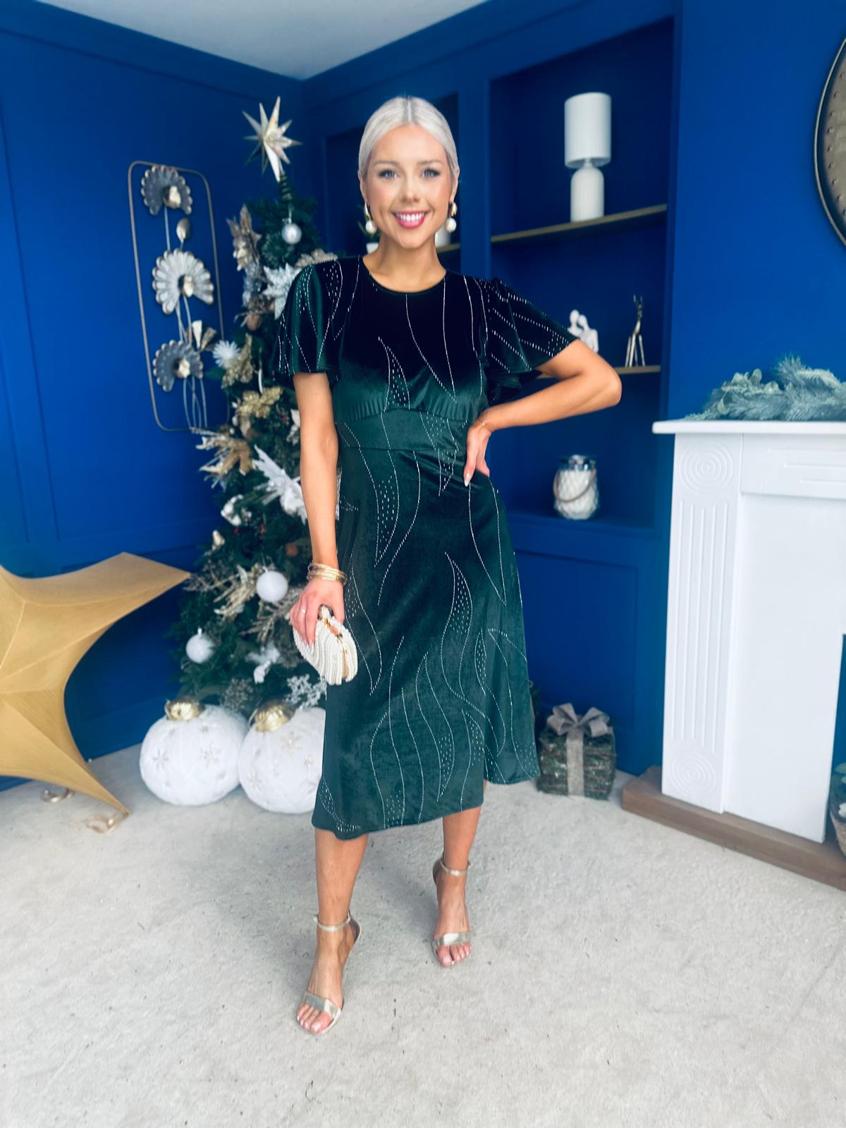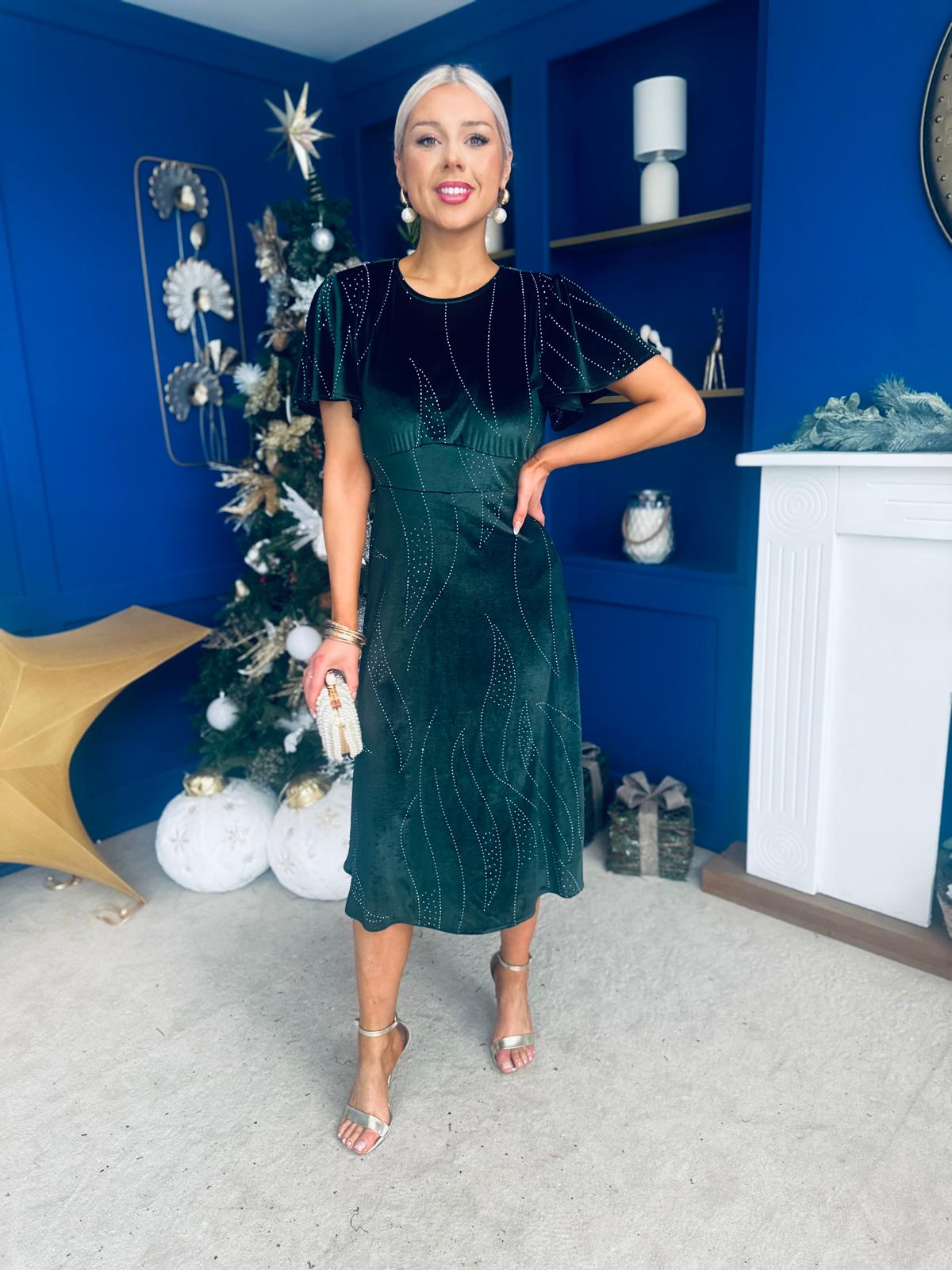 Marissa Studded Leaf Detail Velvet Dress Forest