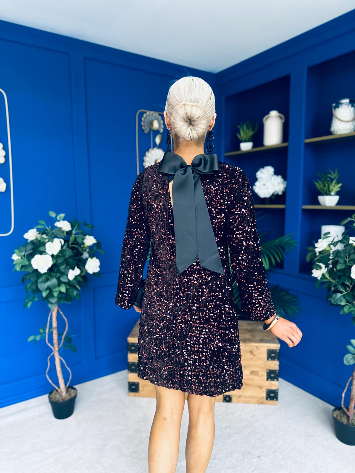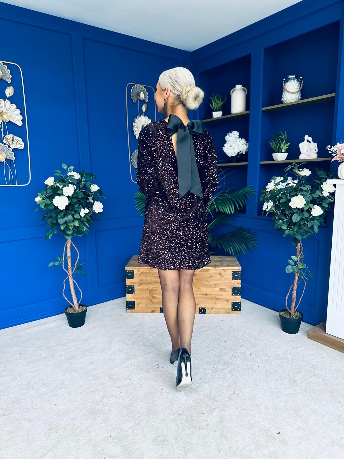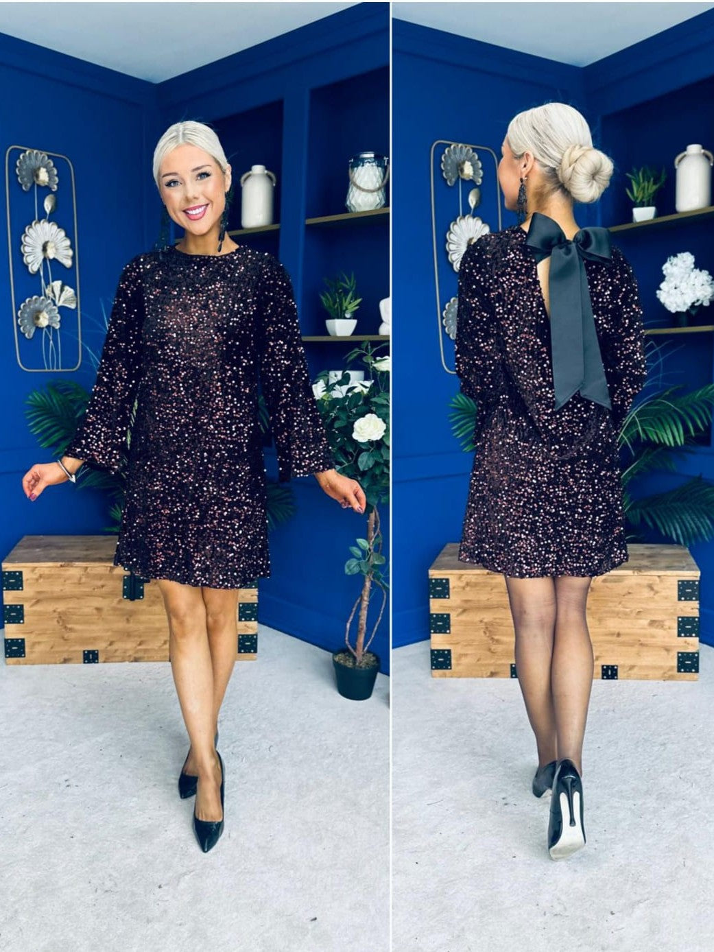 An amazing full sleeve luxurious quality velvet sequin mini dress with satin bow detail to back