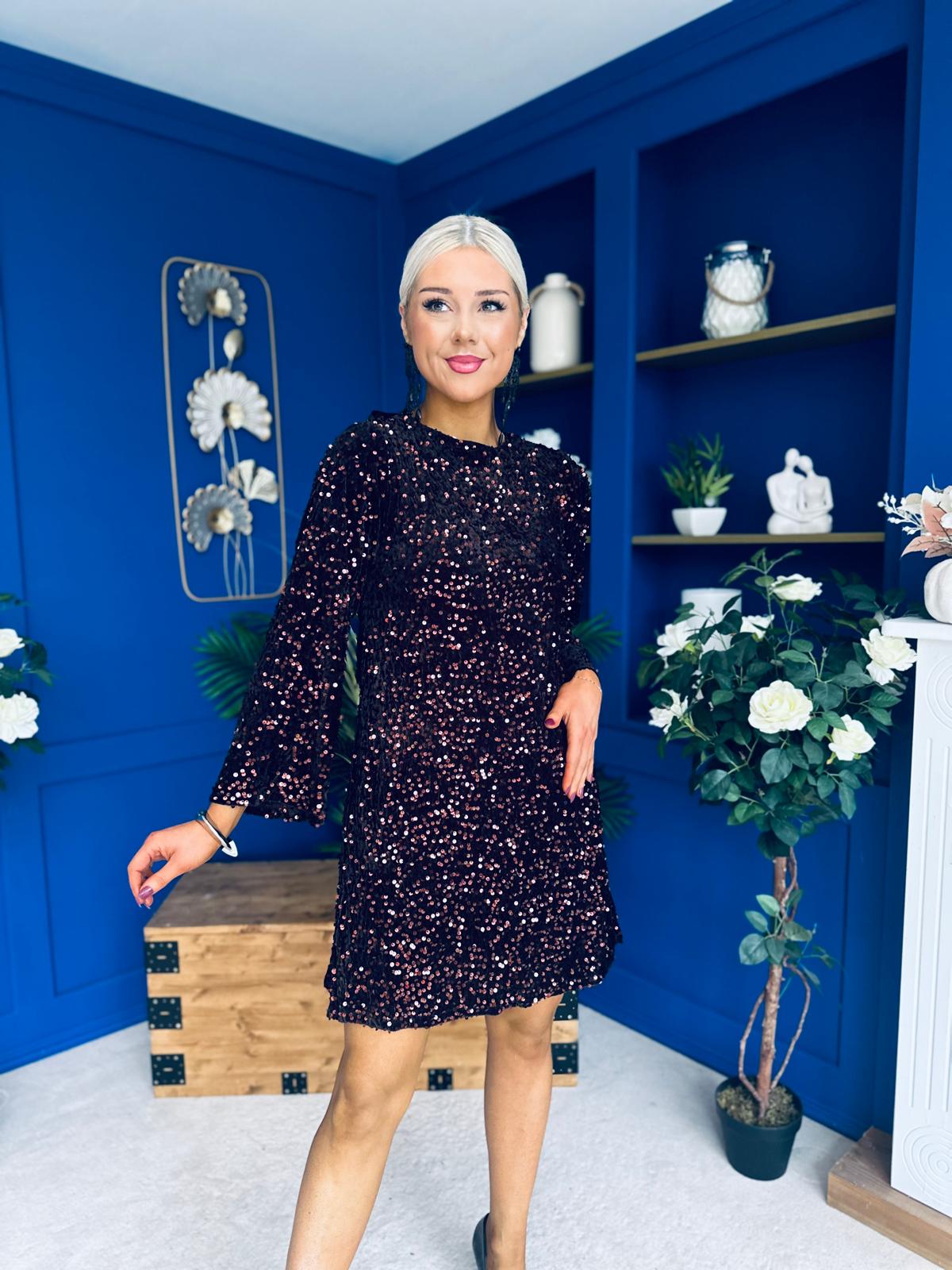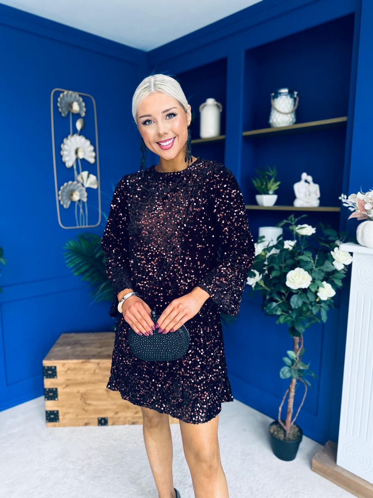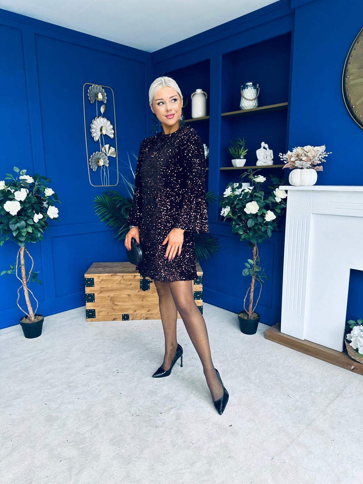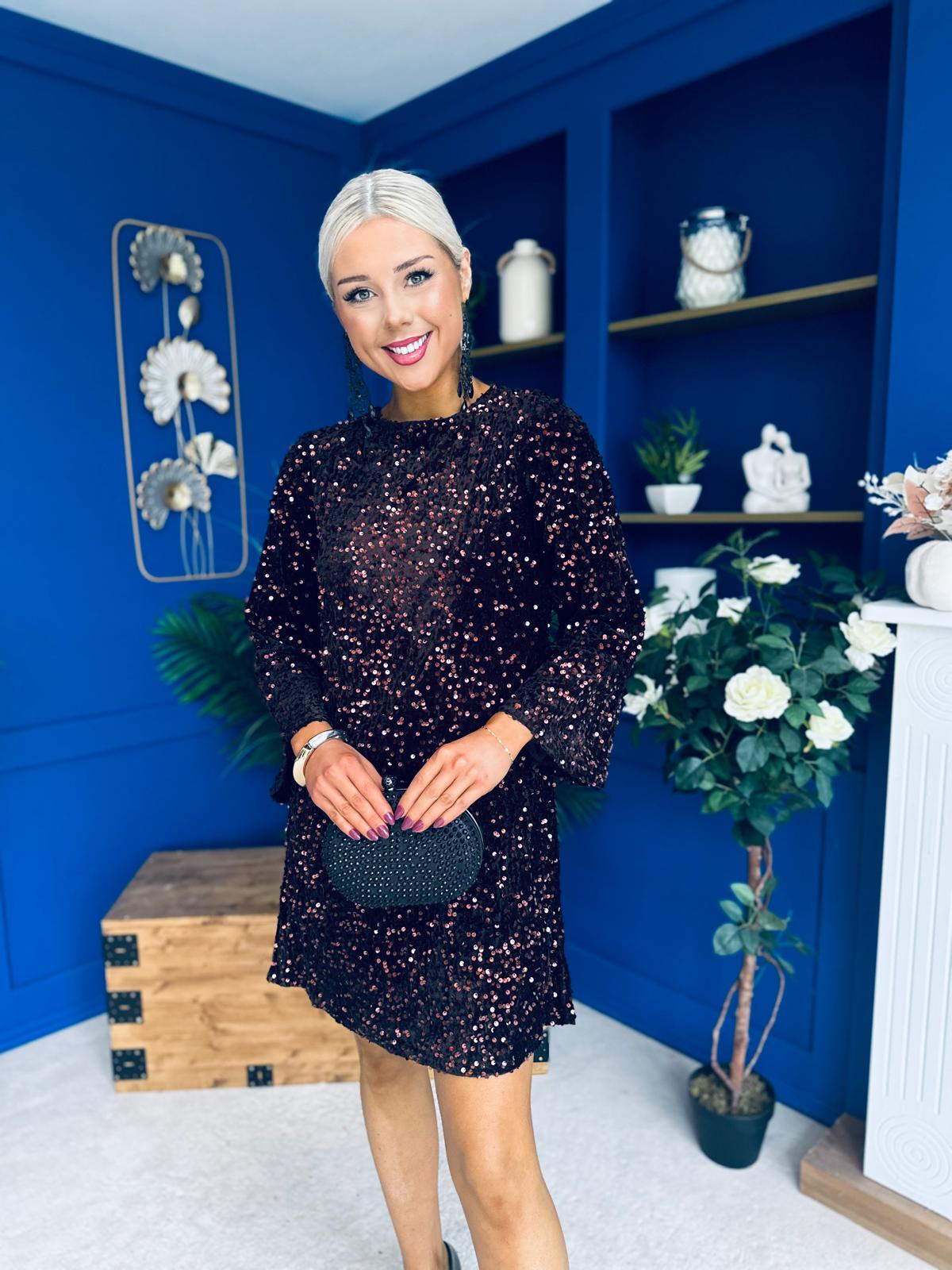 An amazing full sleeve luxurious quality velvet sequin mini dress with satin bow detail to back