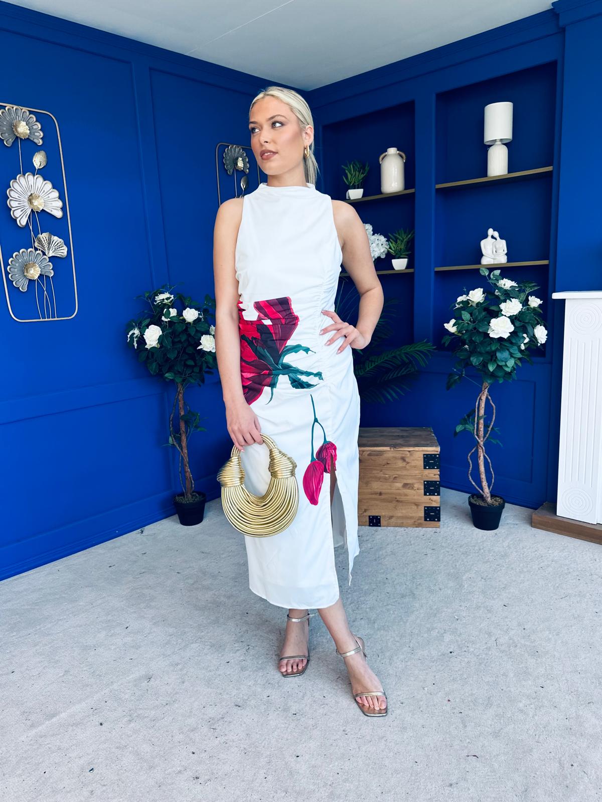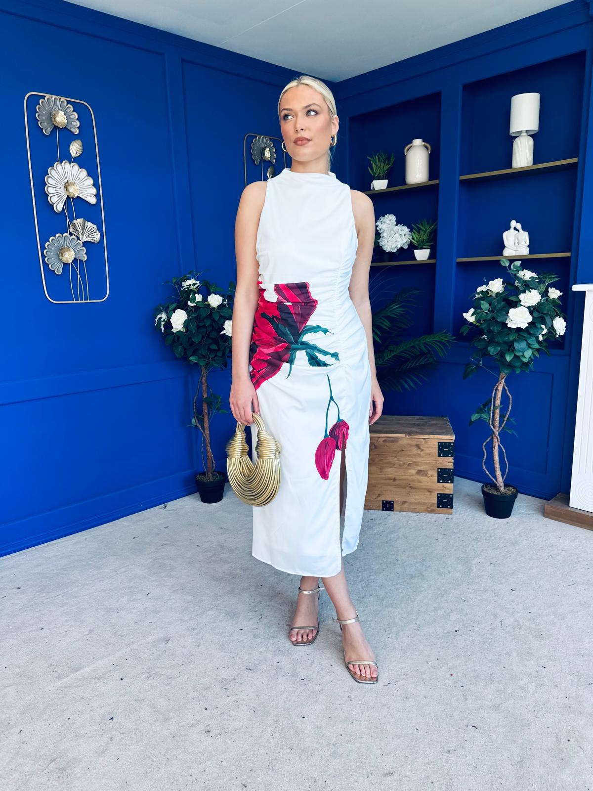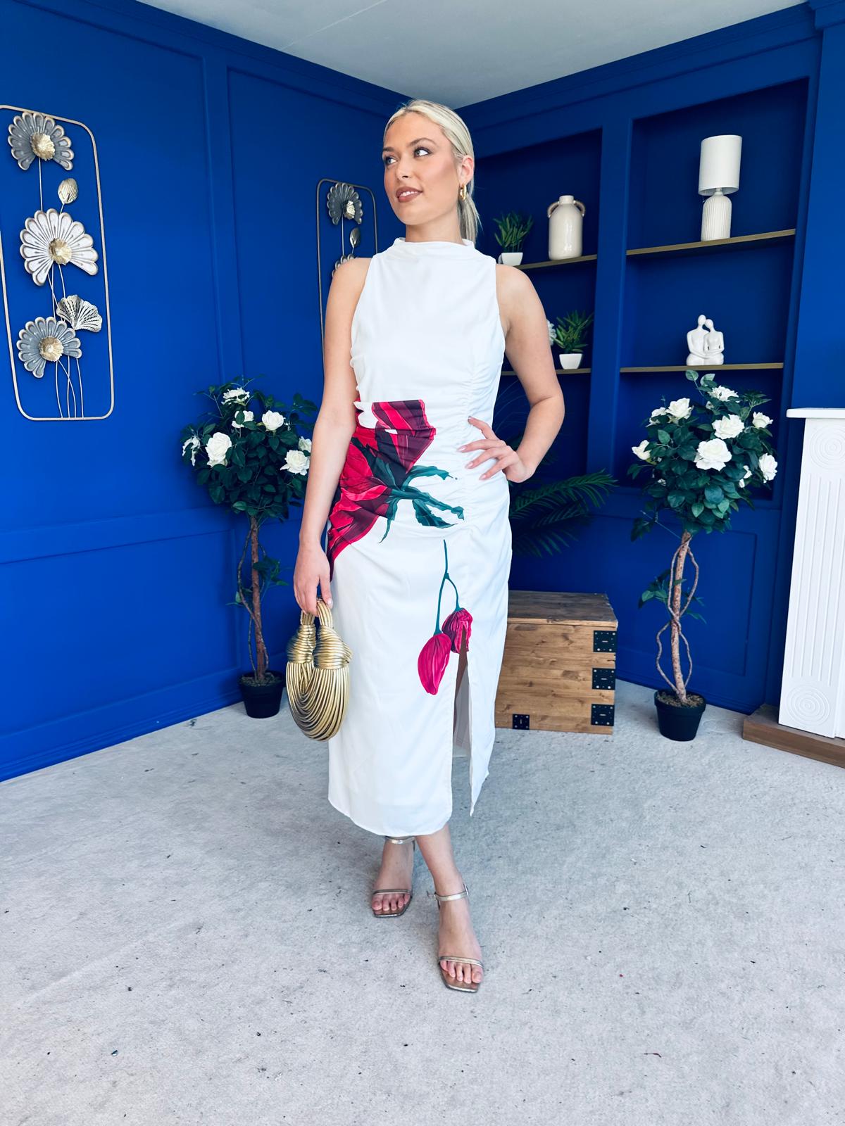 Marta High Neck Ruched Midi Dress Floral White