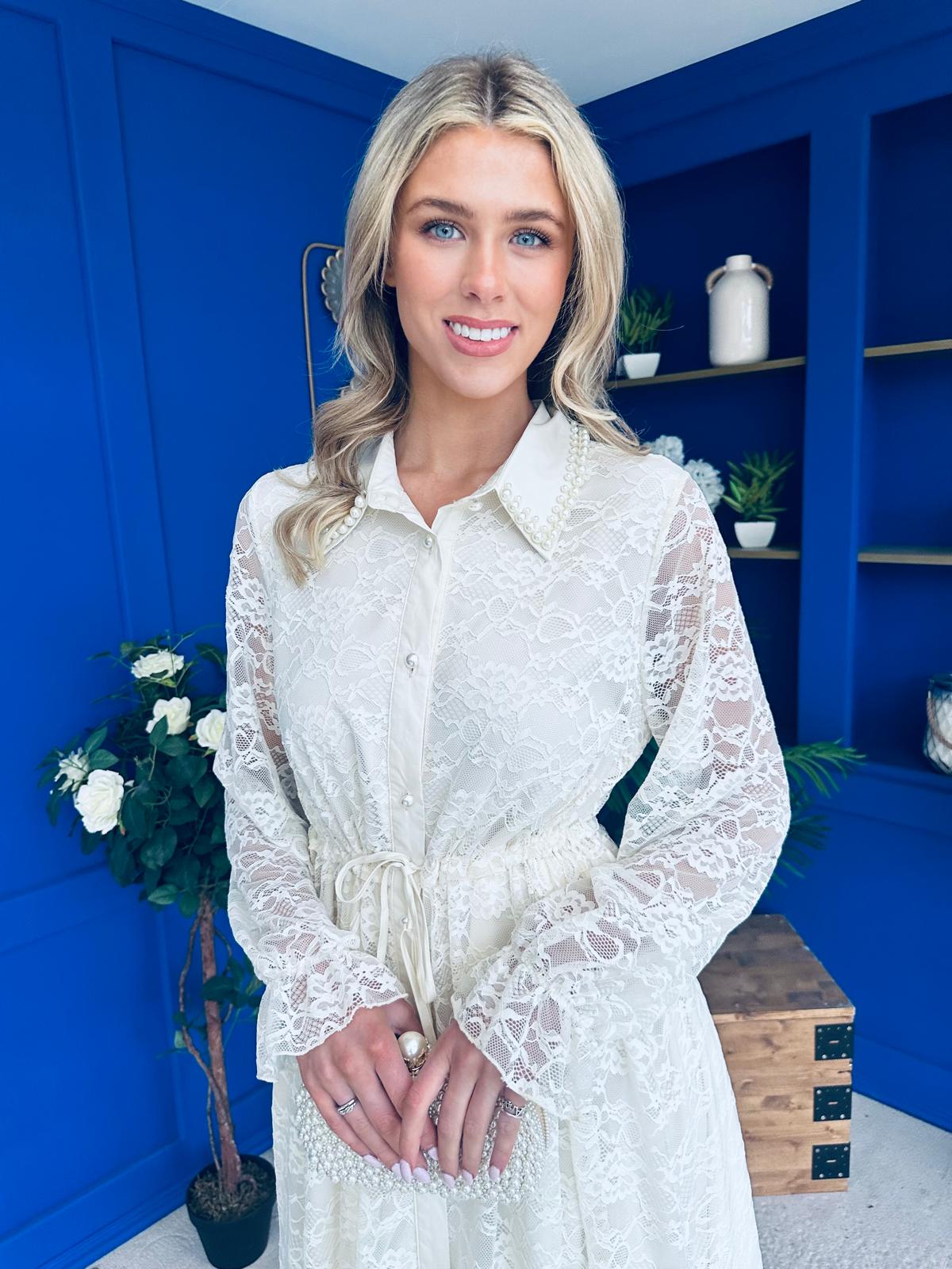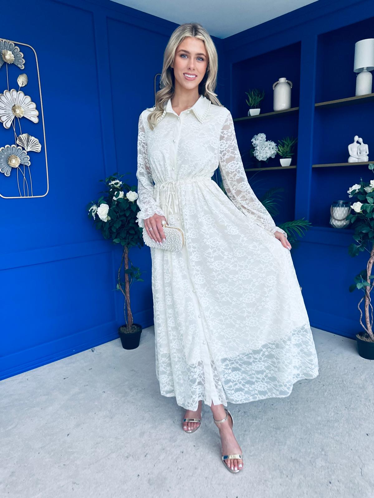 With a classic faux pearl collar neckline, flowing skirt matching drawstring belt, and a wonderful full sleeve.