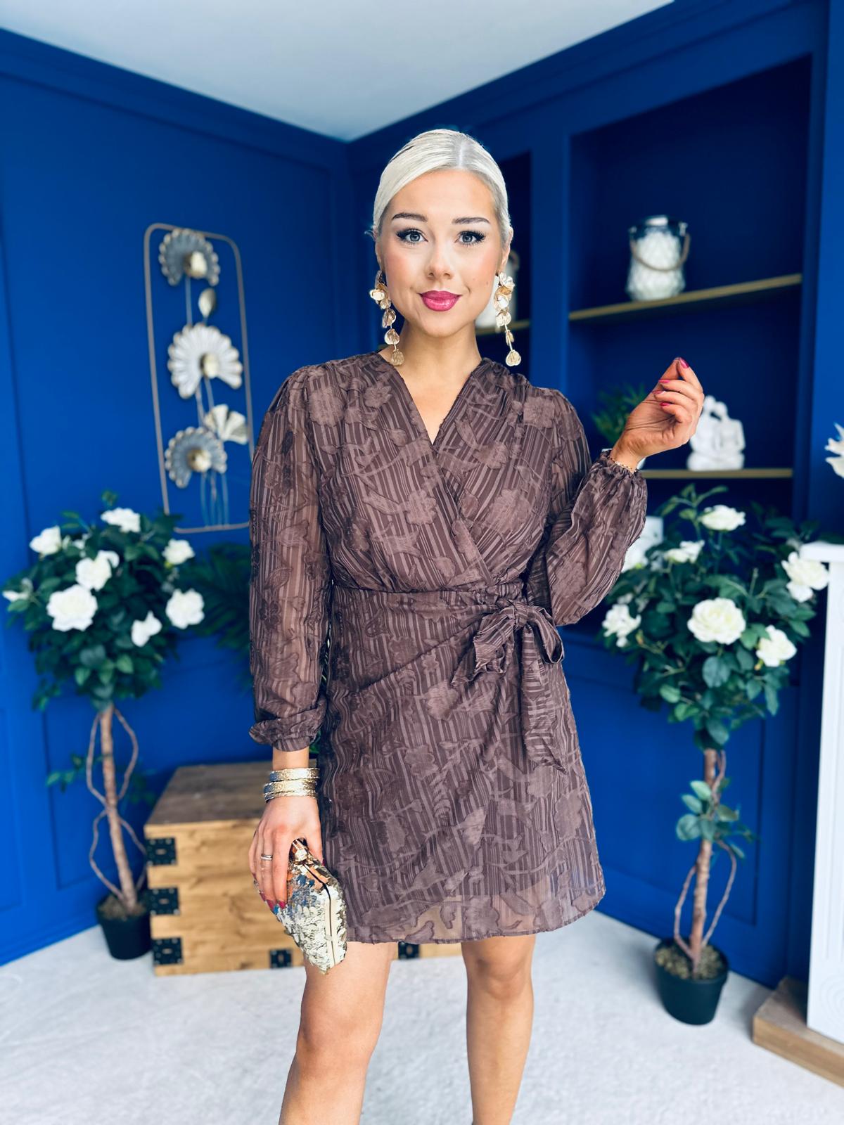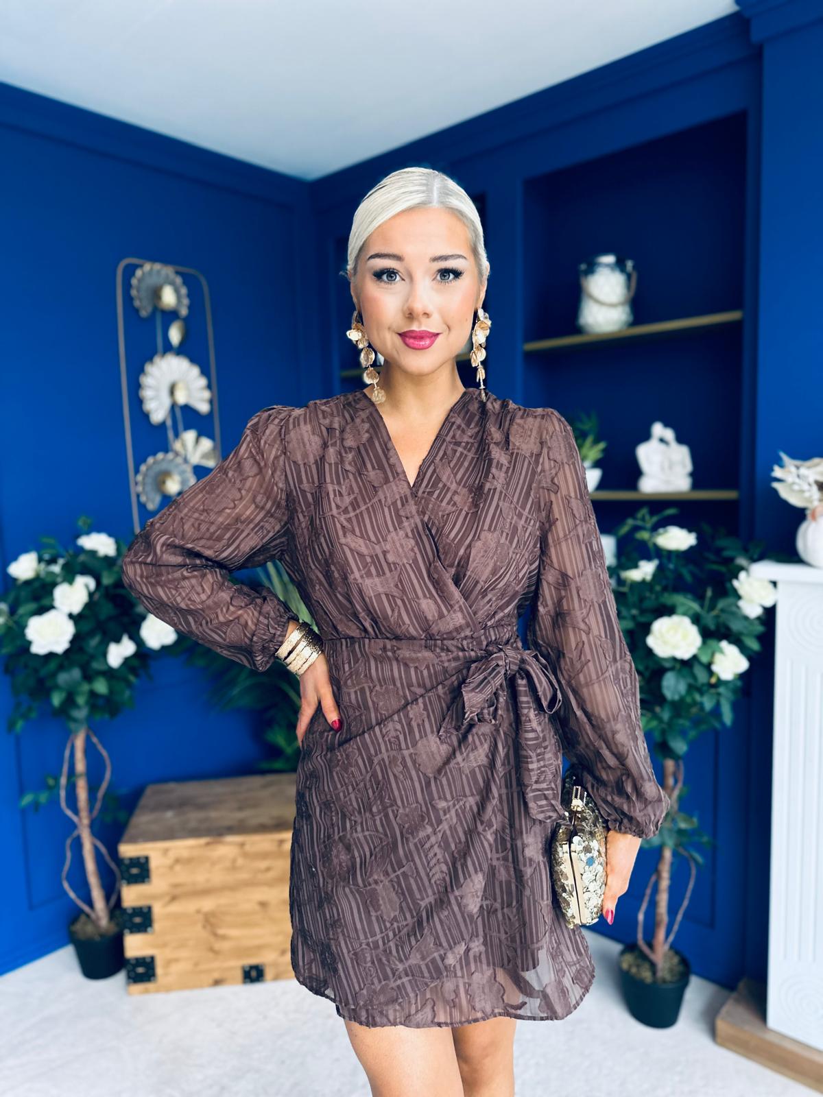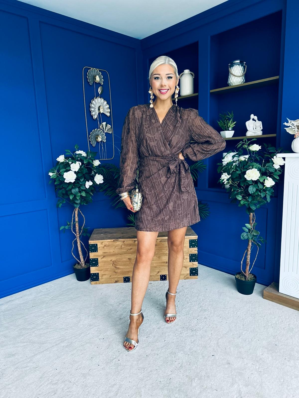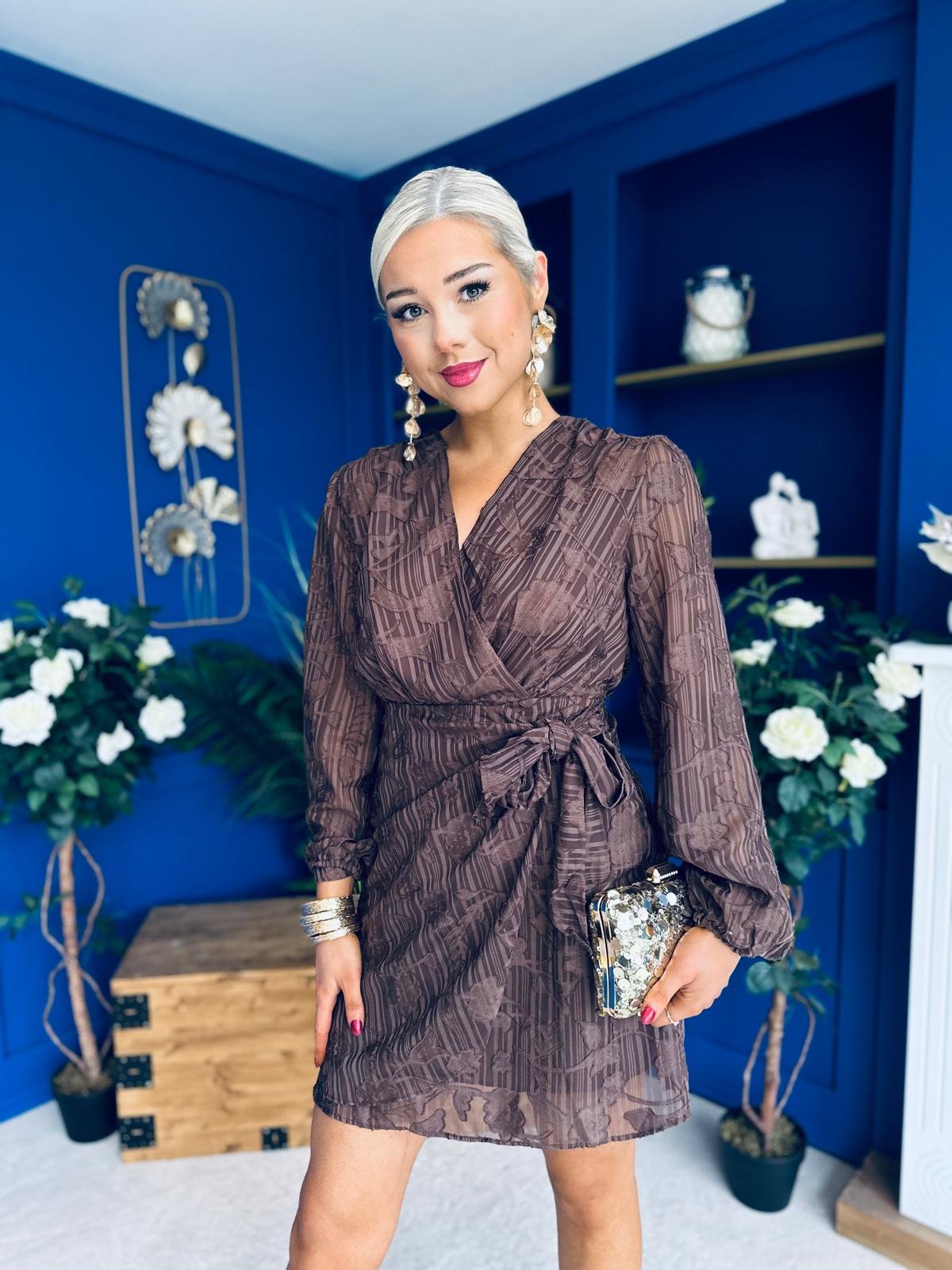 Its dramatic style, wrap over neckline & full sleeve with banded midriff and flowing skirt create a stand out look