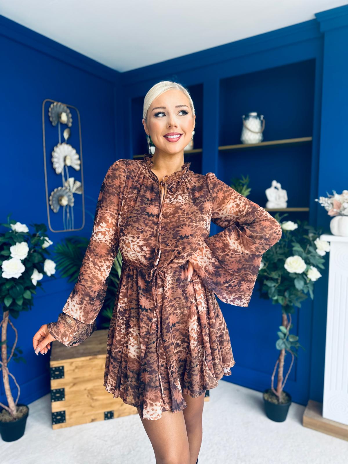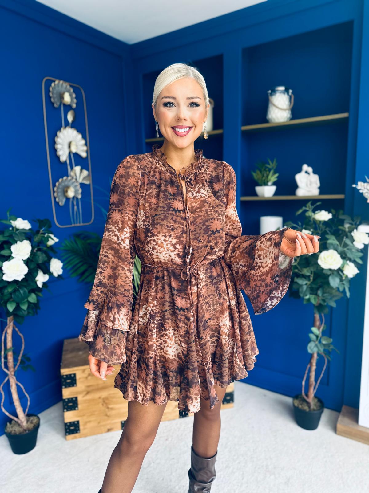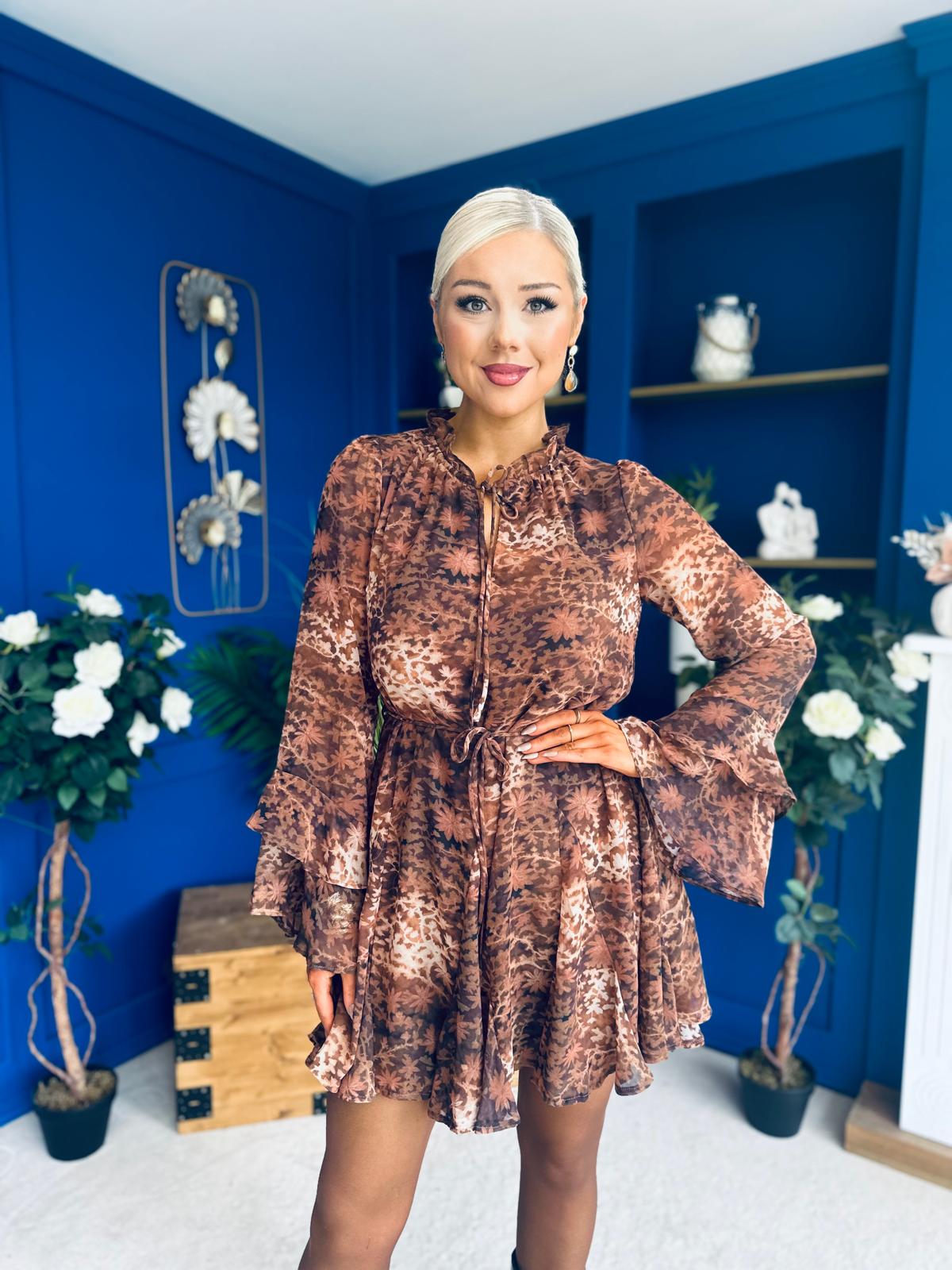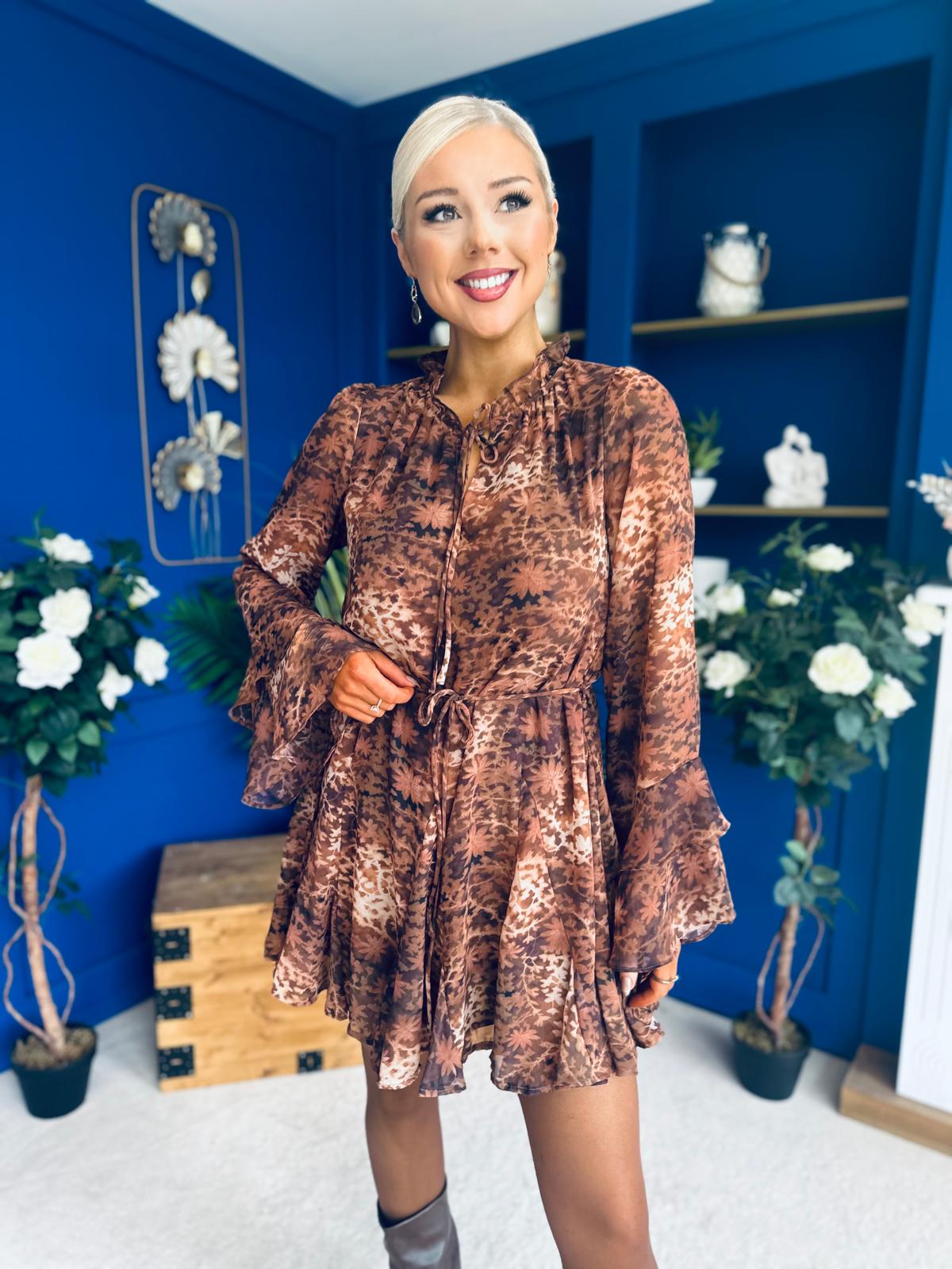 Its dramatic layered bell sleeve, detailed neckline, self tie string belt and flowing skirt create a stand out look