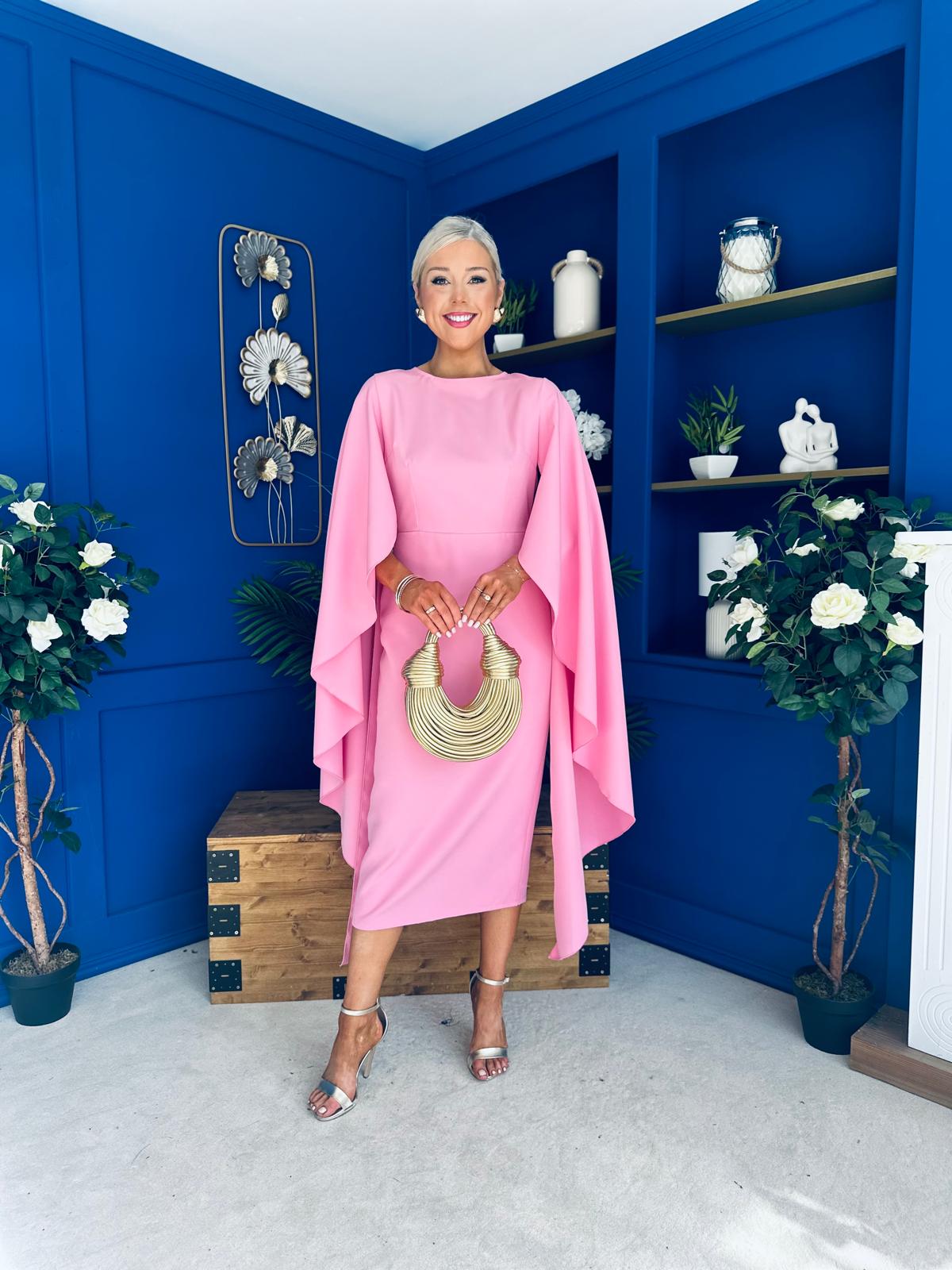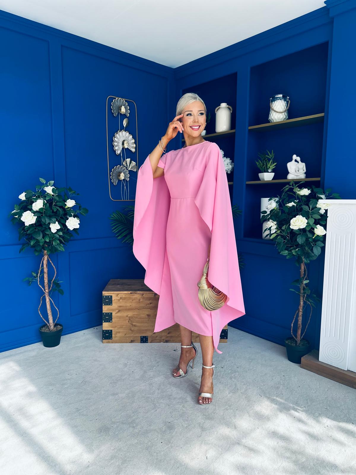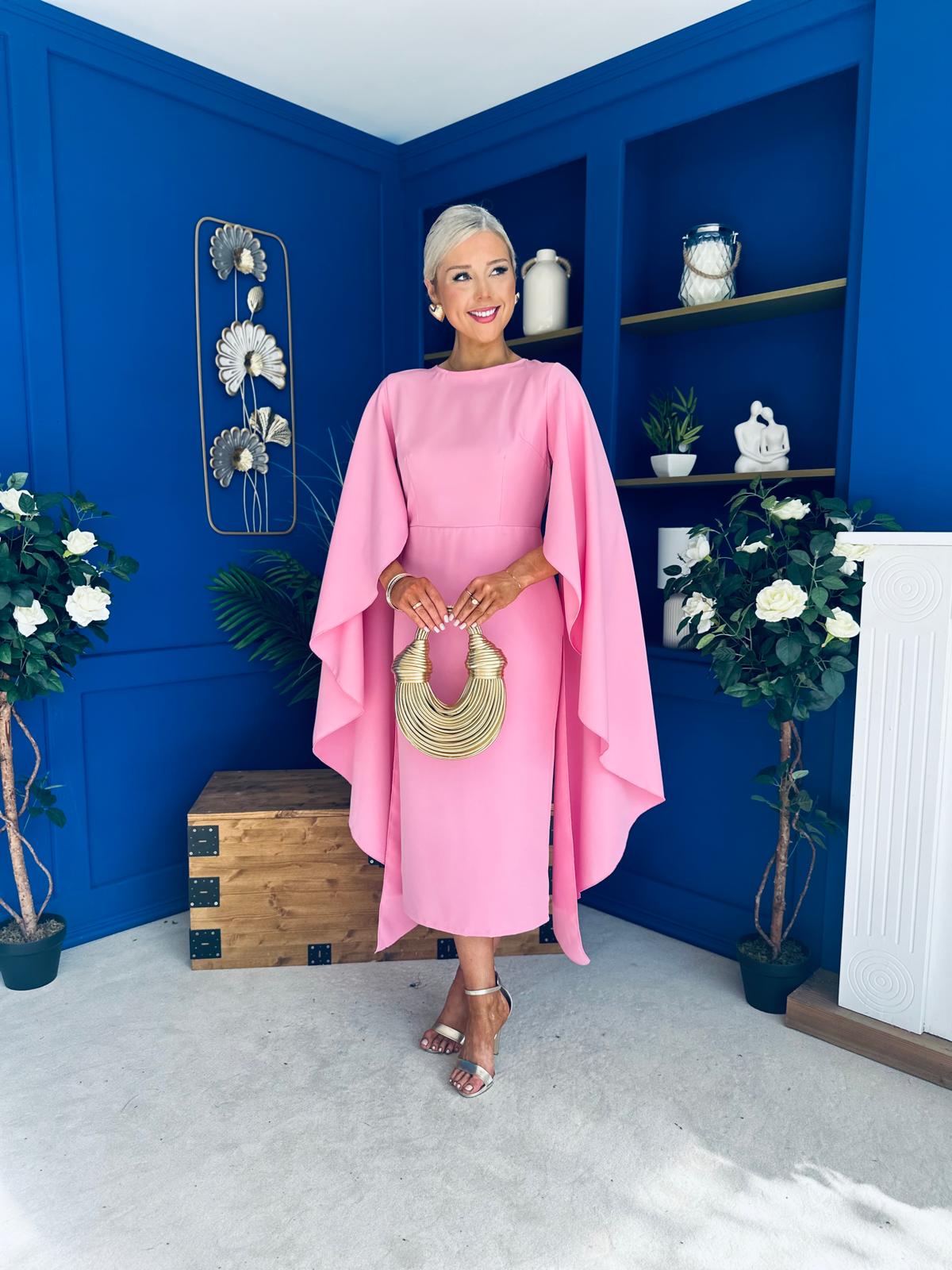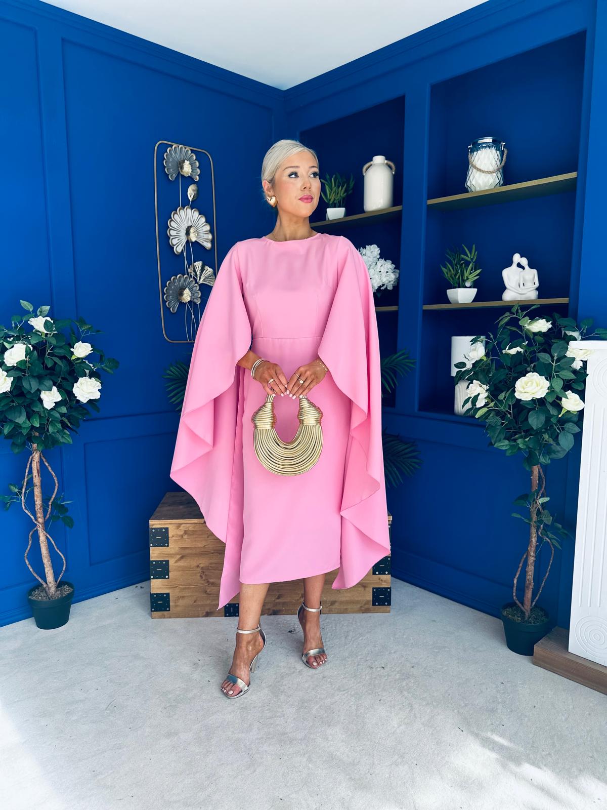 A stunning neckline created by a stand out, shoulder cape extending the length of the dress.