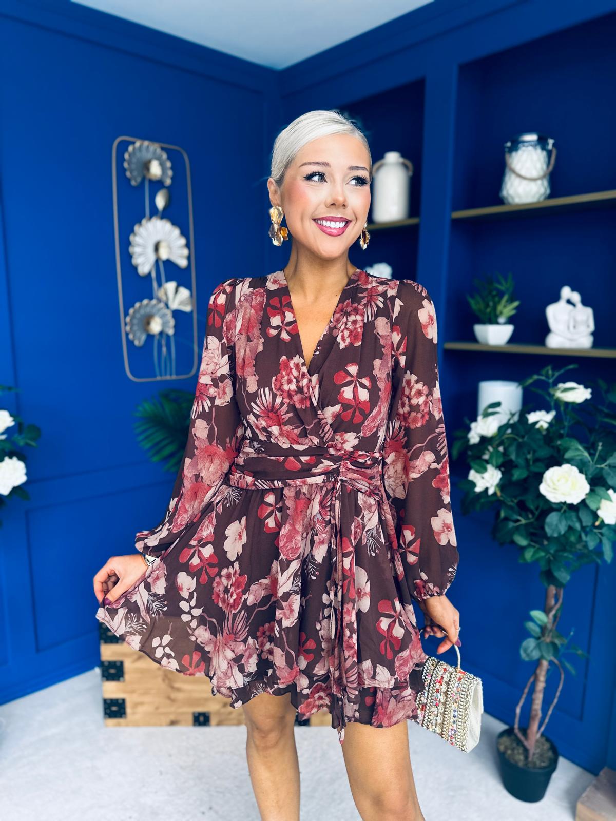 Its dramatic style, wrap over neckline & full sleeve with banded midriff and flowing skirt create a stand out look