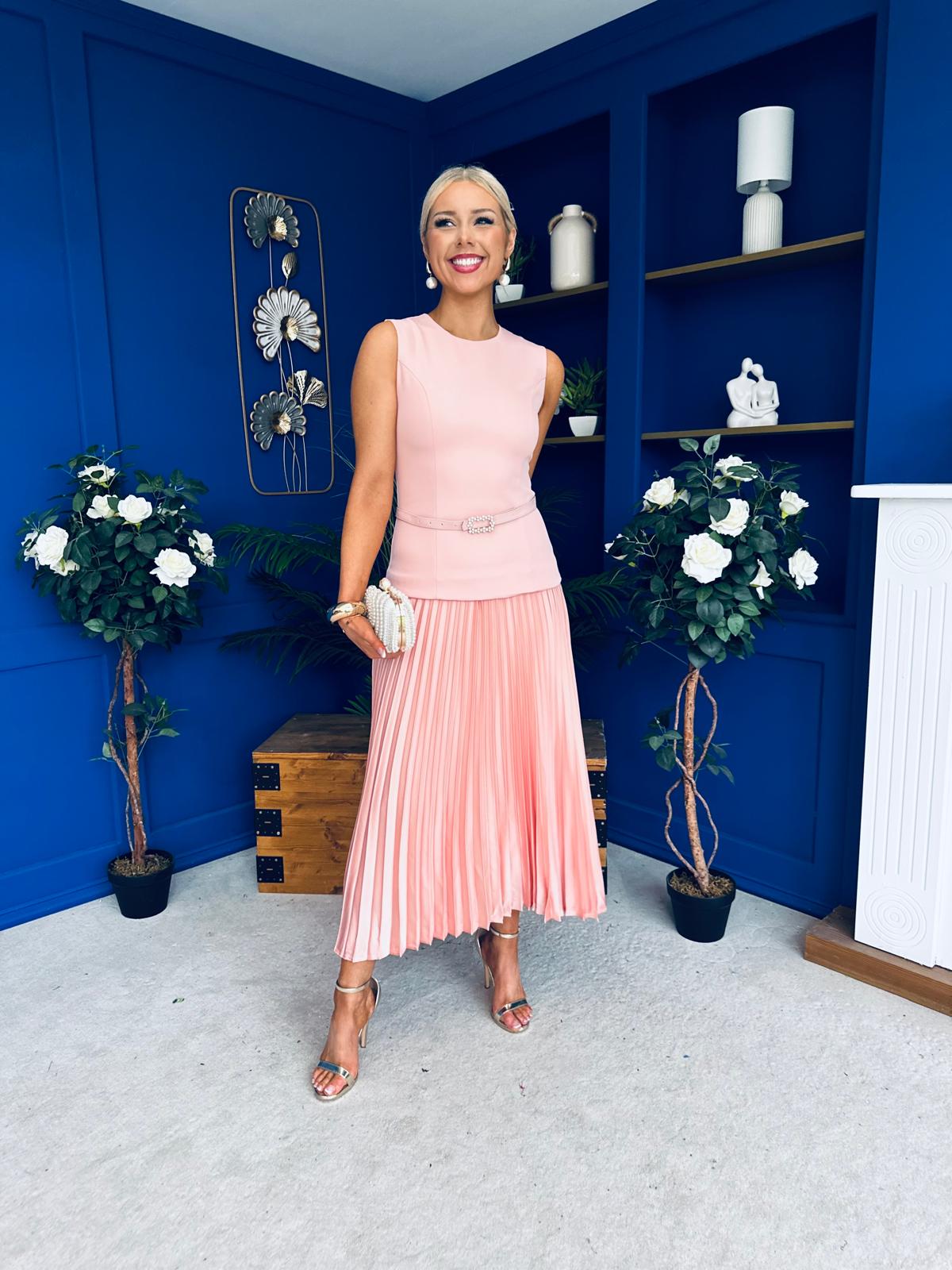 With a classic sleeveless top meets peplum detail, matching embellished belt and amazing flowing pleated satin skirt
