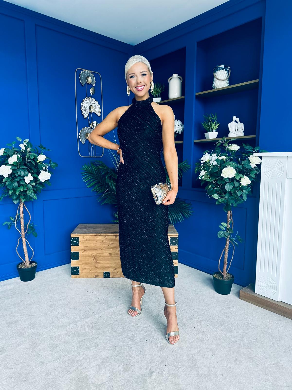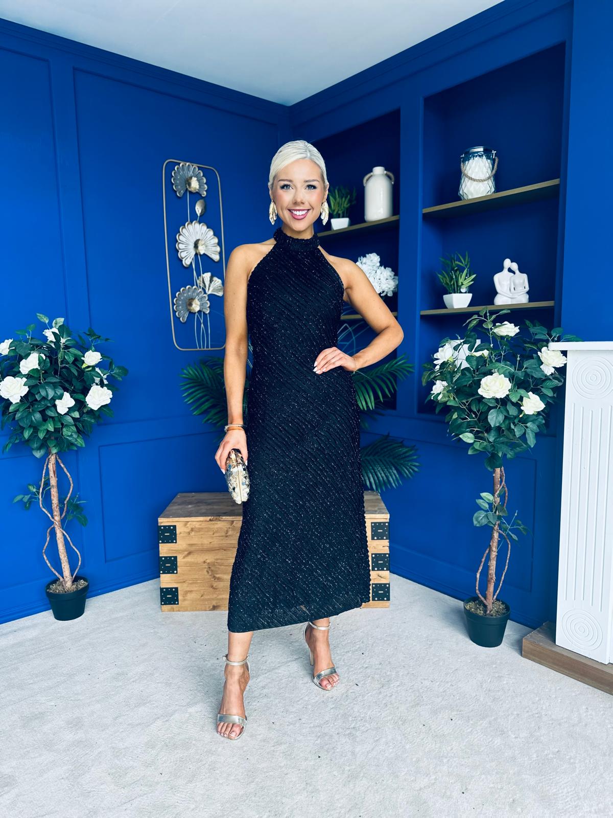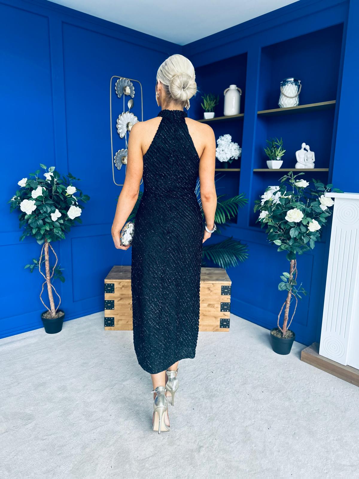 Exuding timeless elegance, the Mira Halterneck Shimmer Midi Dress pairs a classic silhouette with a subtle shimmer that catches the light gracefully.