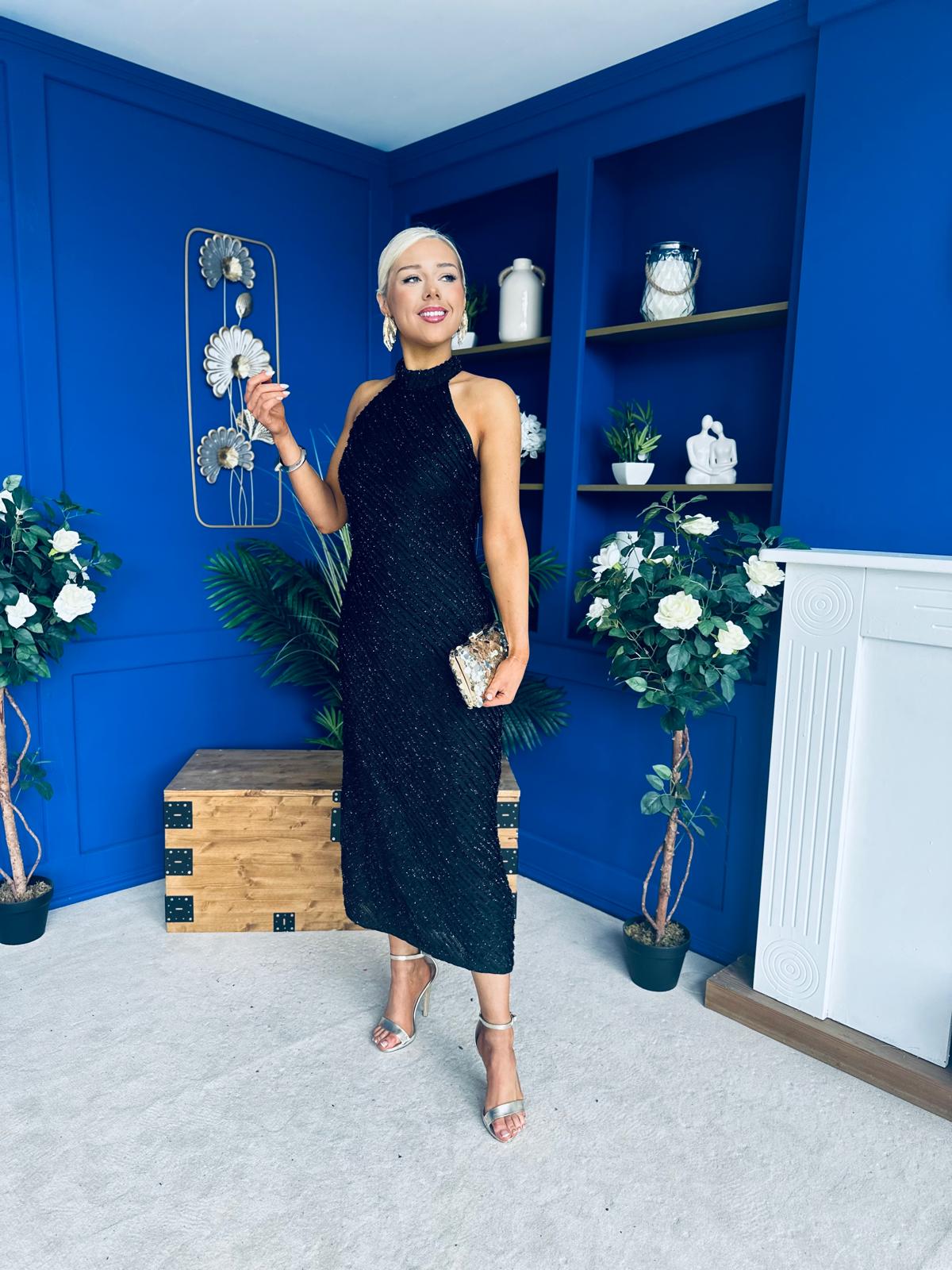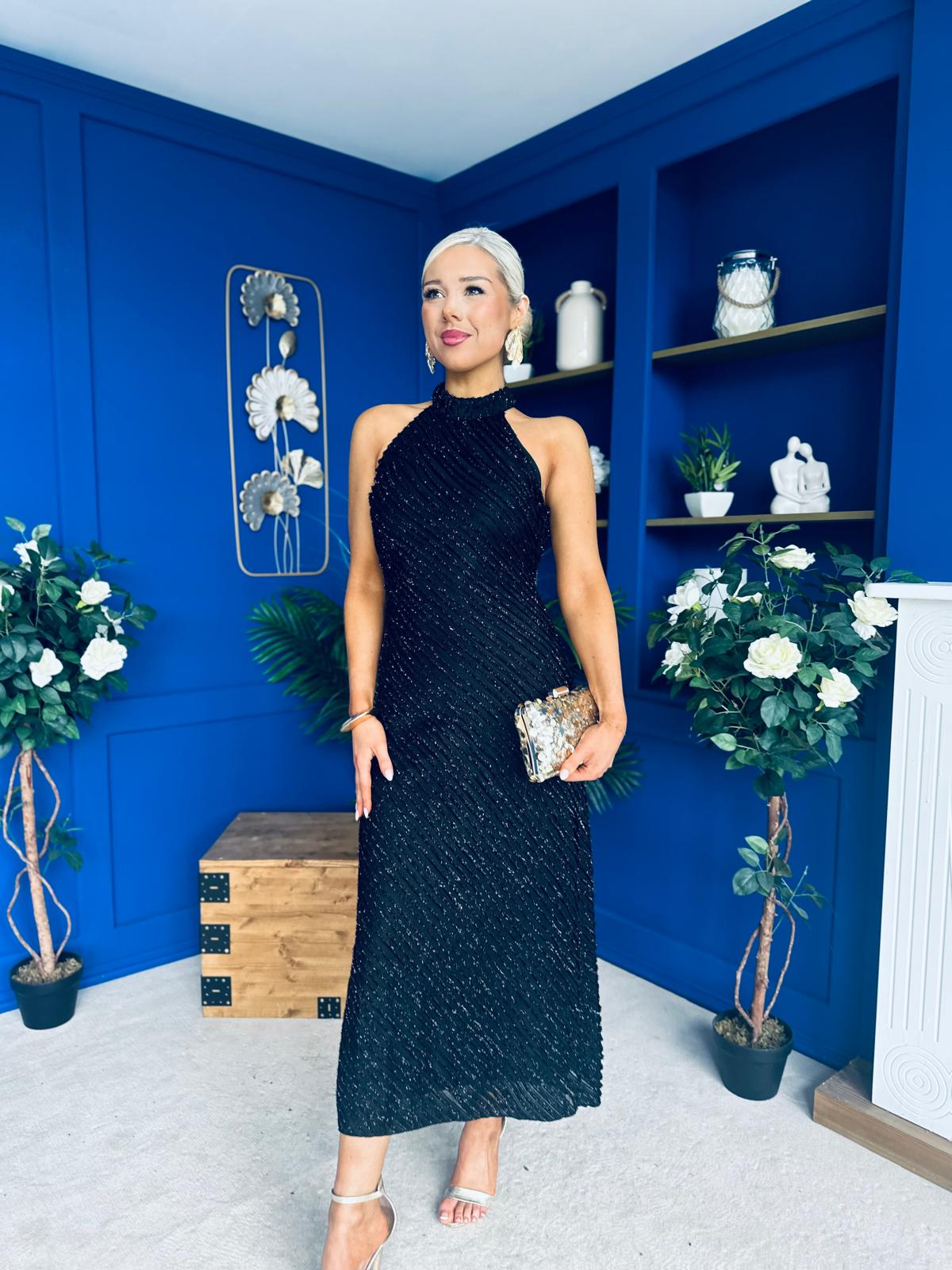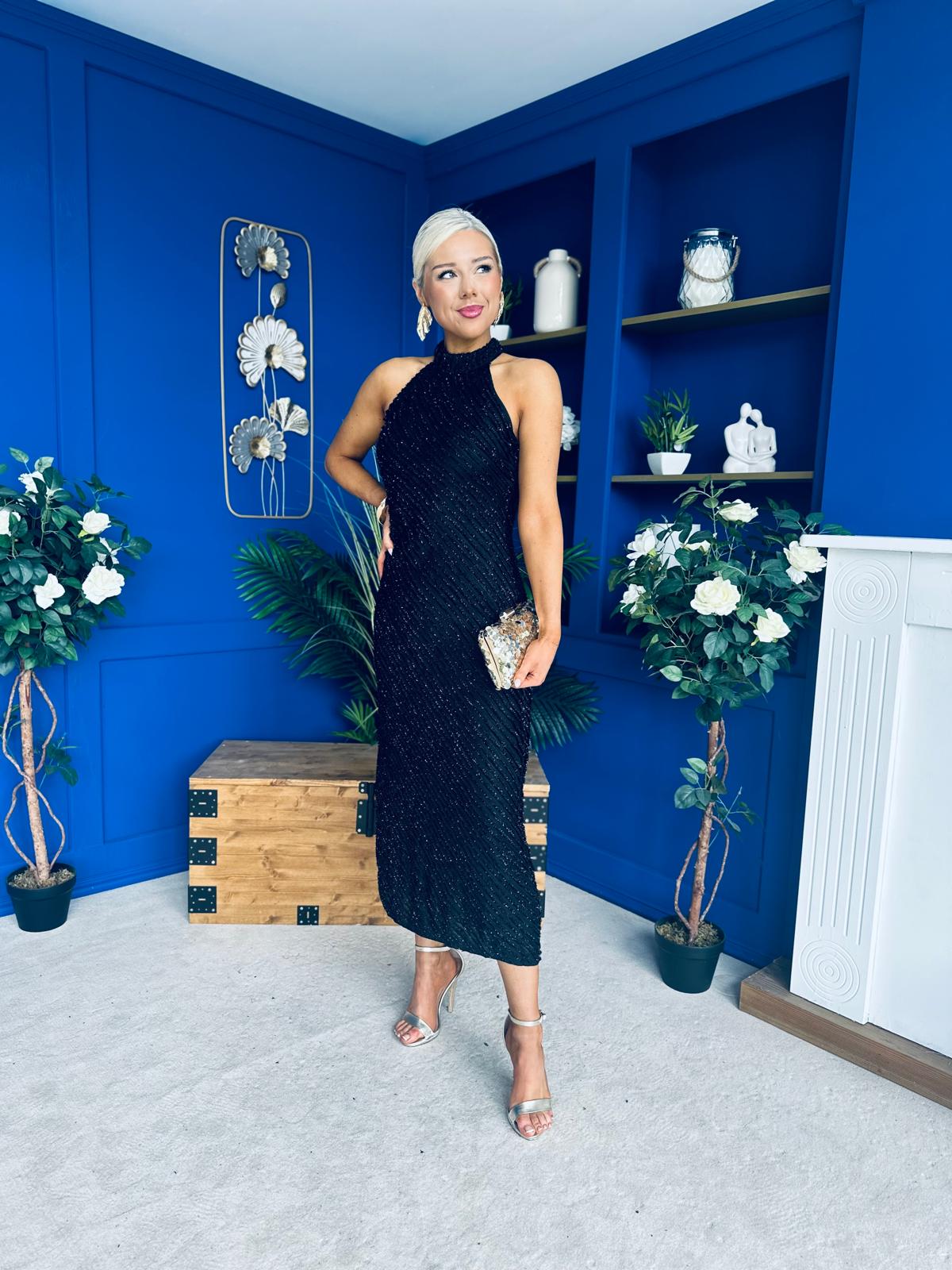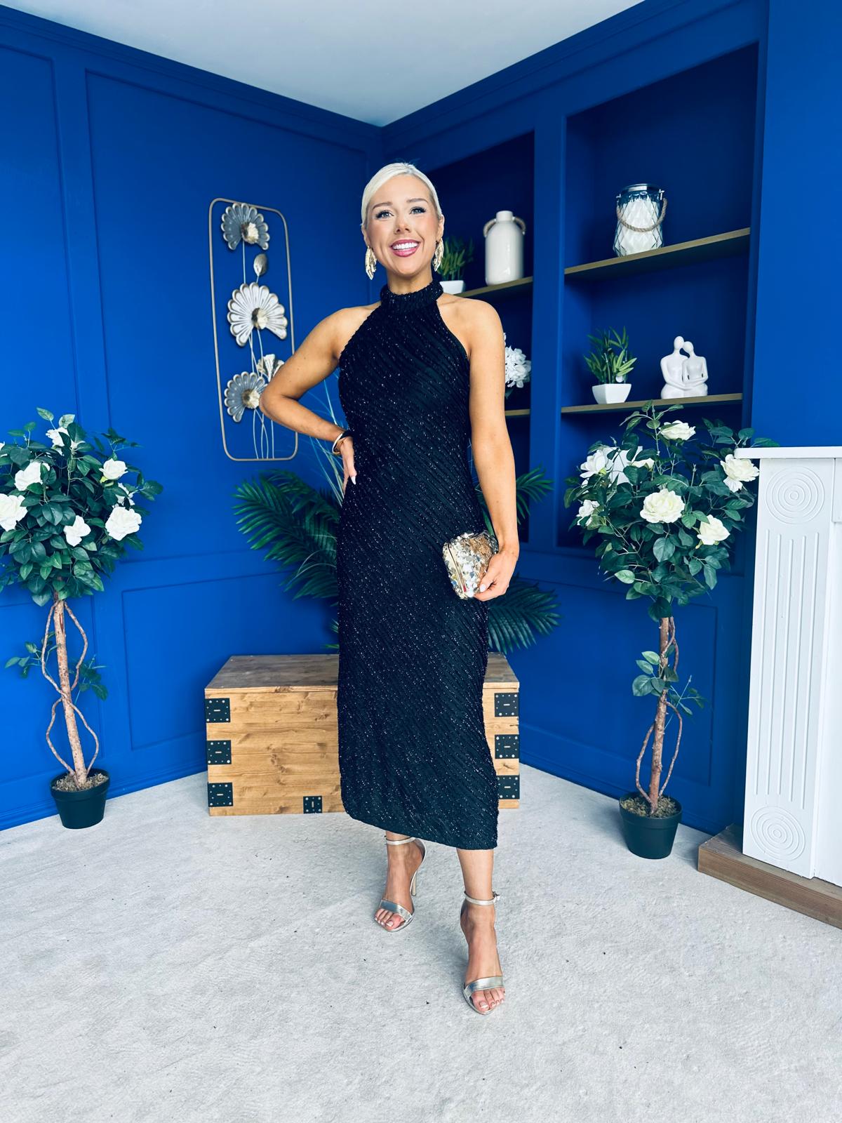 Exuding timeless elegance, the Mira Halterneck Shimmer Midi Dress pairs a classic silhouette with a subtle shimmer that catches the light gracefully.