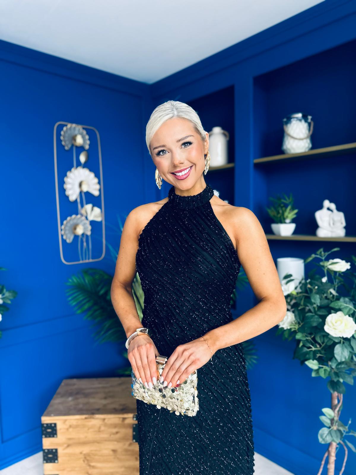 Designed to flatter the figure, its halterneck style offers a refined, sophisticated look perfect for evening events or special occasions.