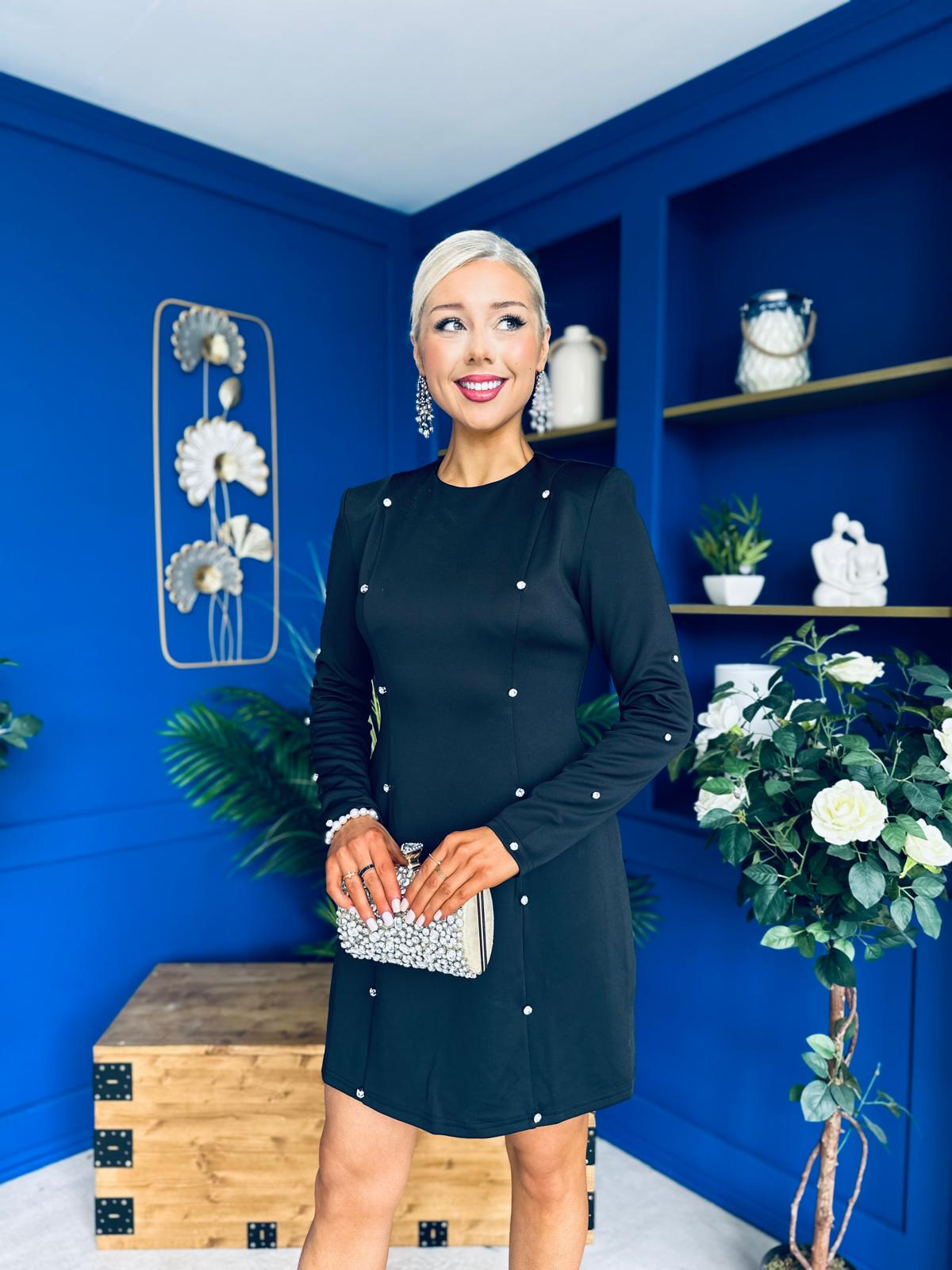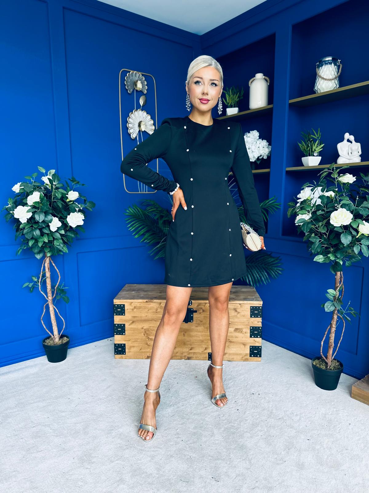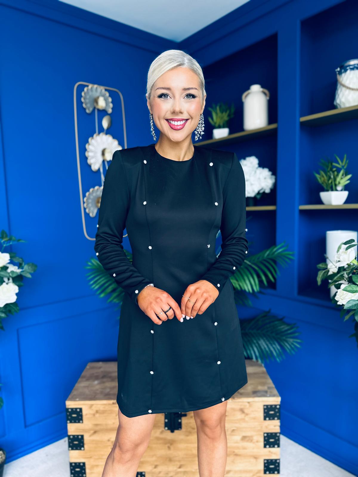 The Morrigan Studded Long Sleeve Mini Dress in Black features an effortlessly classic and elegant silhouette enhanced by delicate studded details.