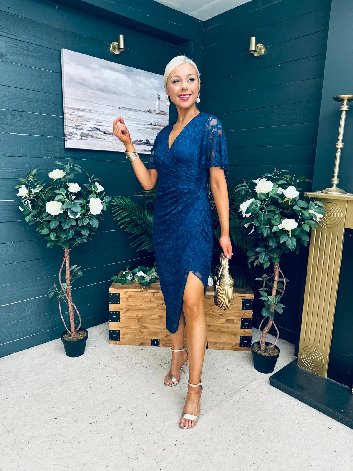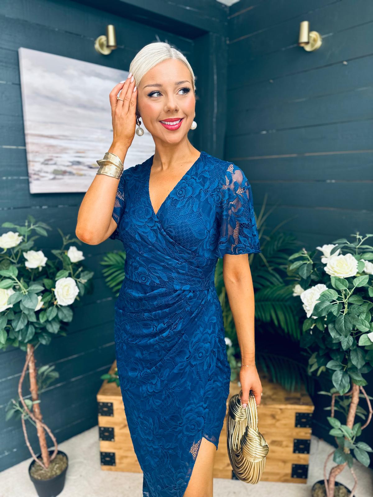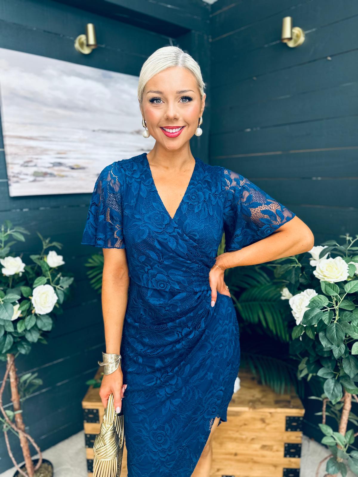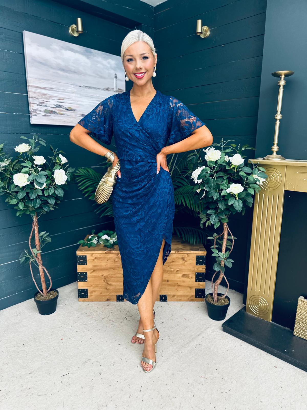 Natasha Angel Sleeve Midi Dress In Navy Lace