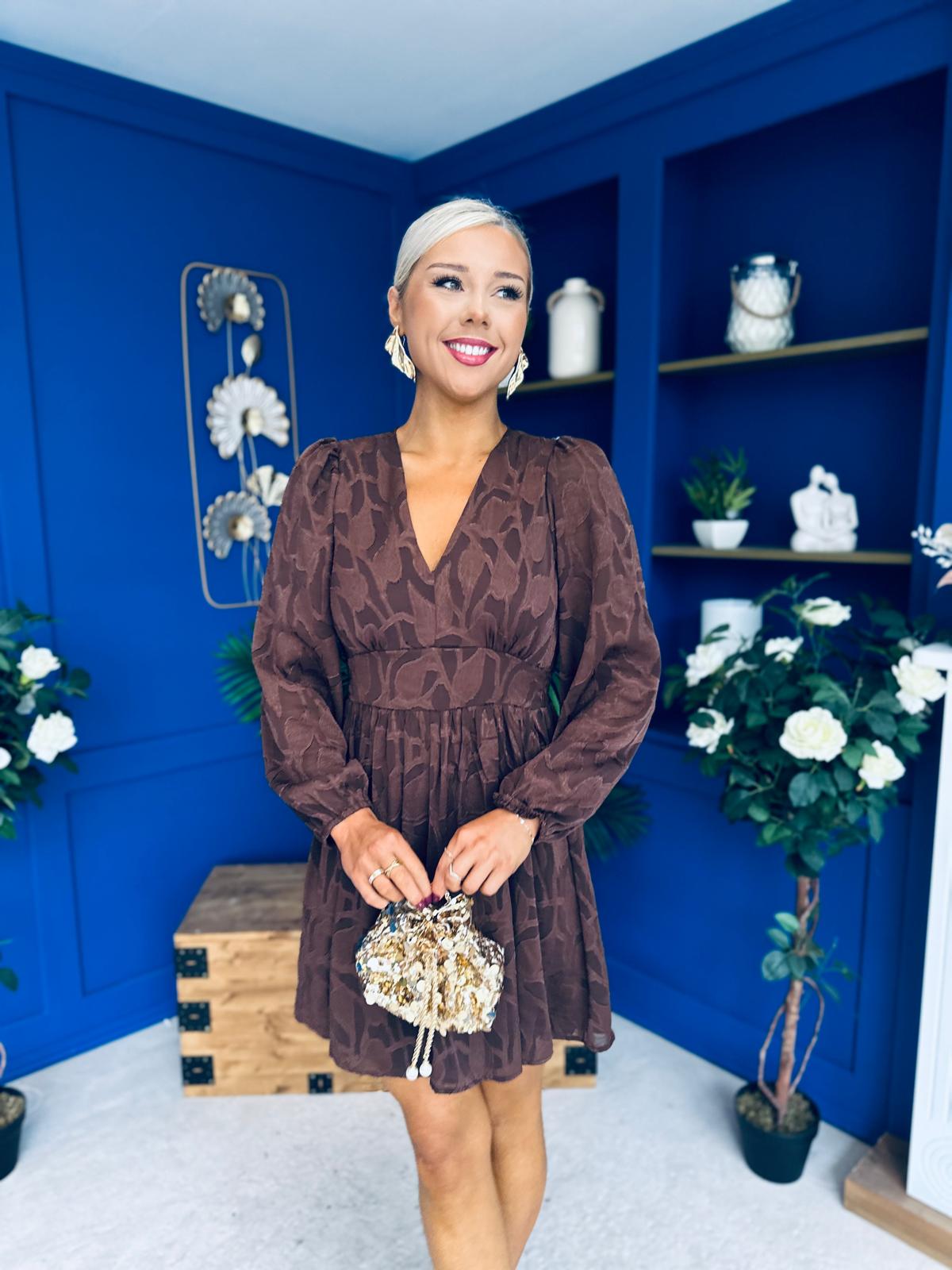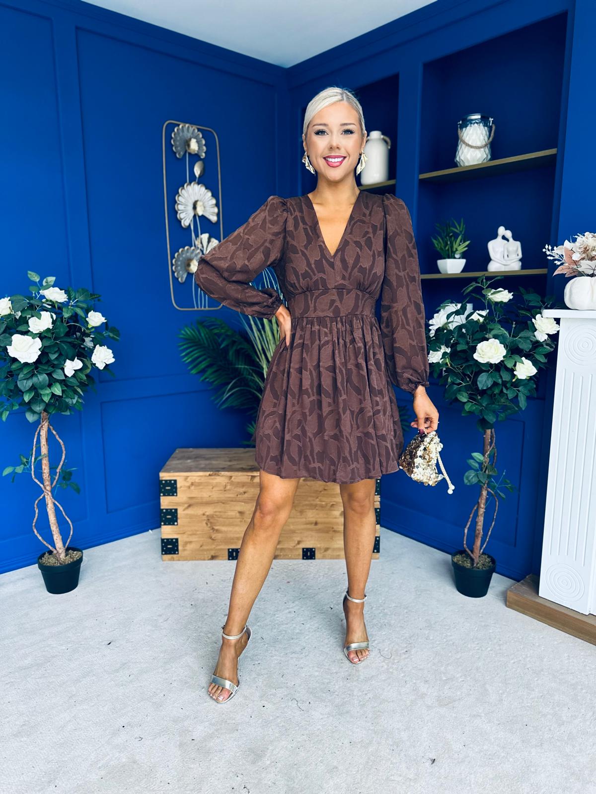 Its dramatic burnout fabric, V neckline, full sleeve with elasticated waist and flowing skirt detail create a stand out look