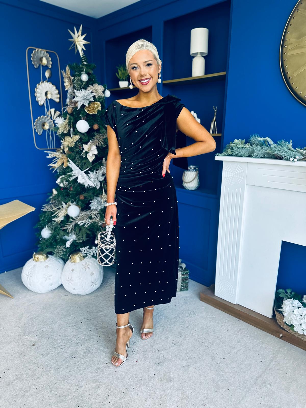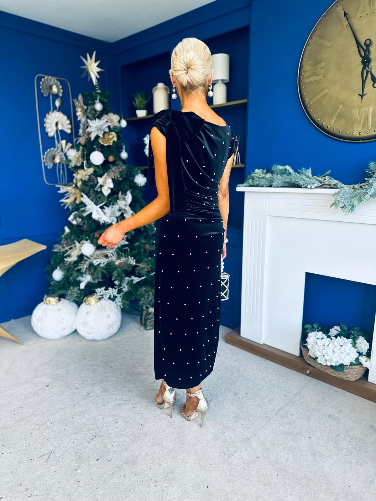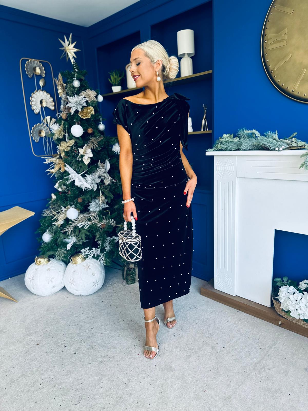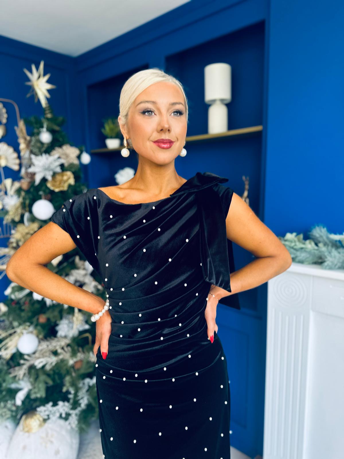 Class & sophistication in a luxurious velvet material with pearl embellishment throughout & solid velvet bow to shoulder