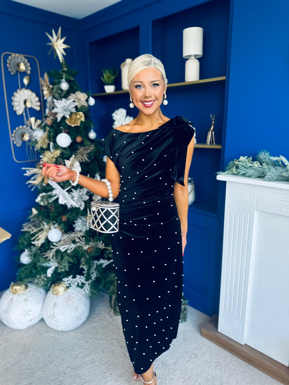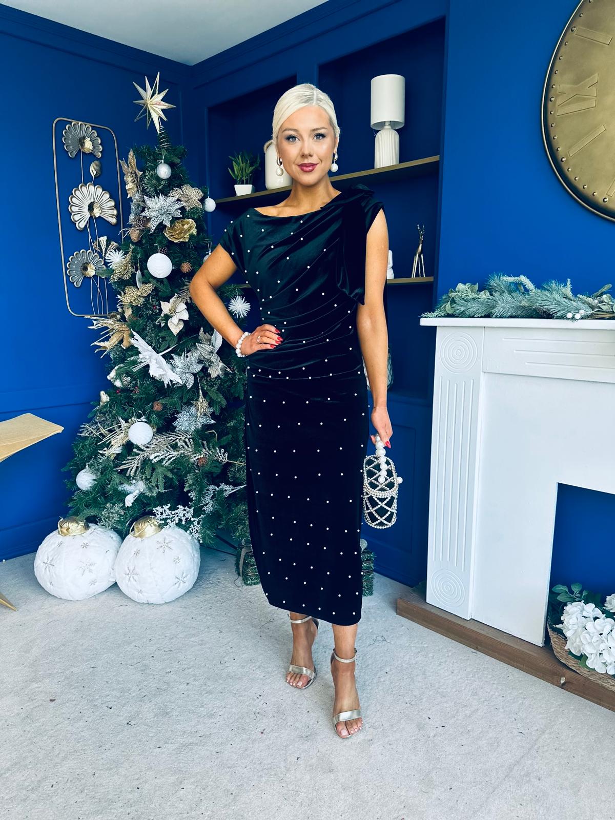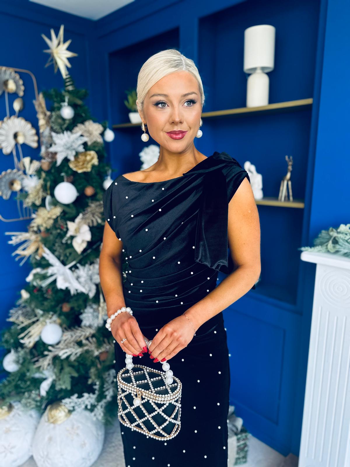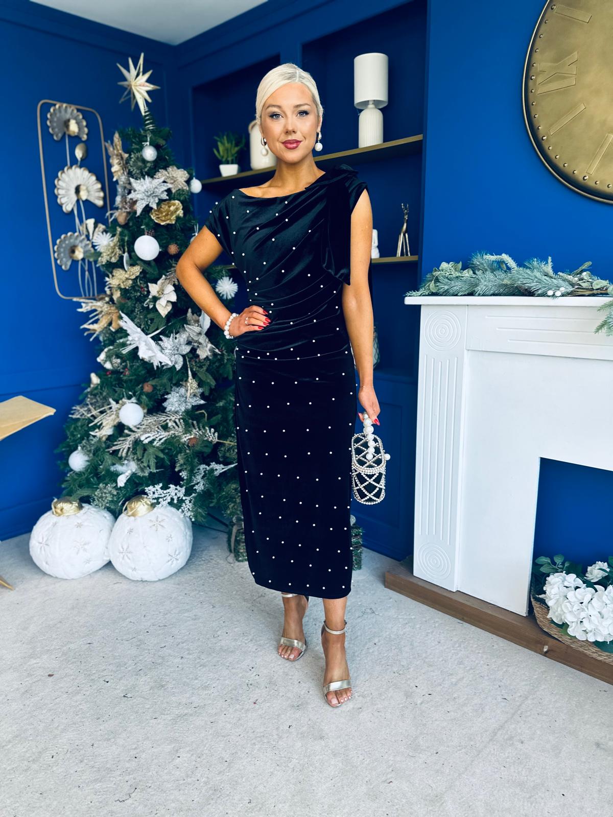 Class & sophistication in a luxurious velvet material with pearl embellishment throughout & solid velvet bow to shoulder