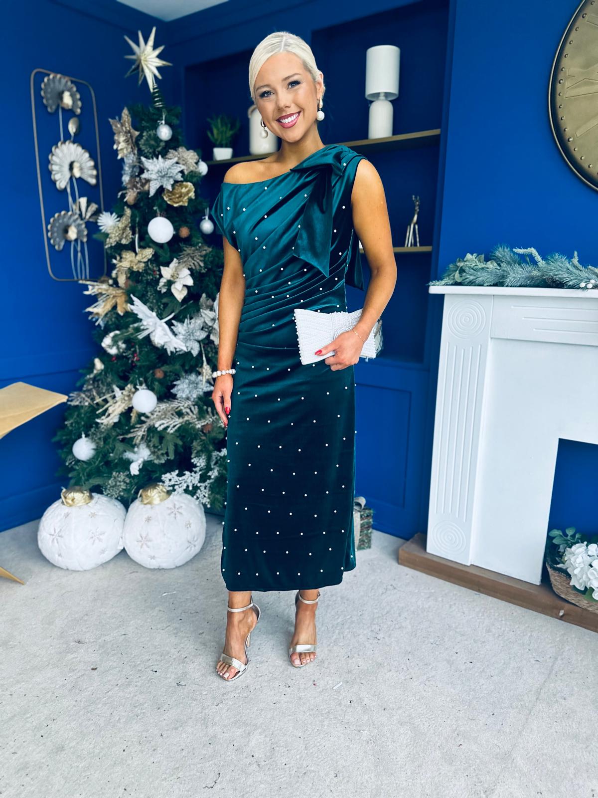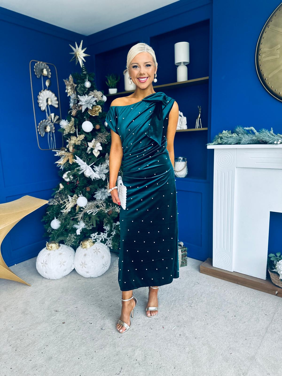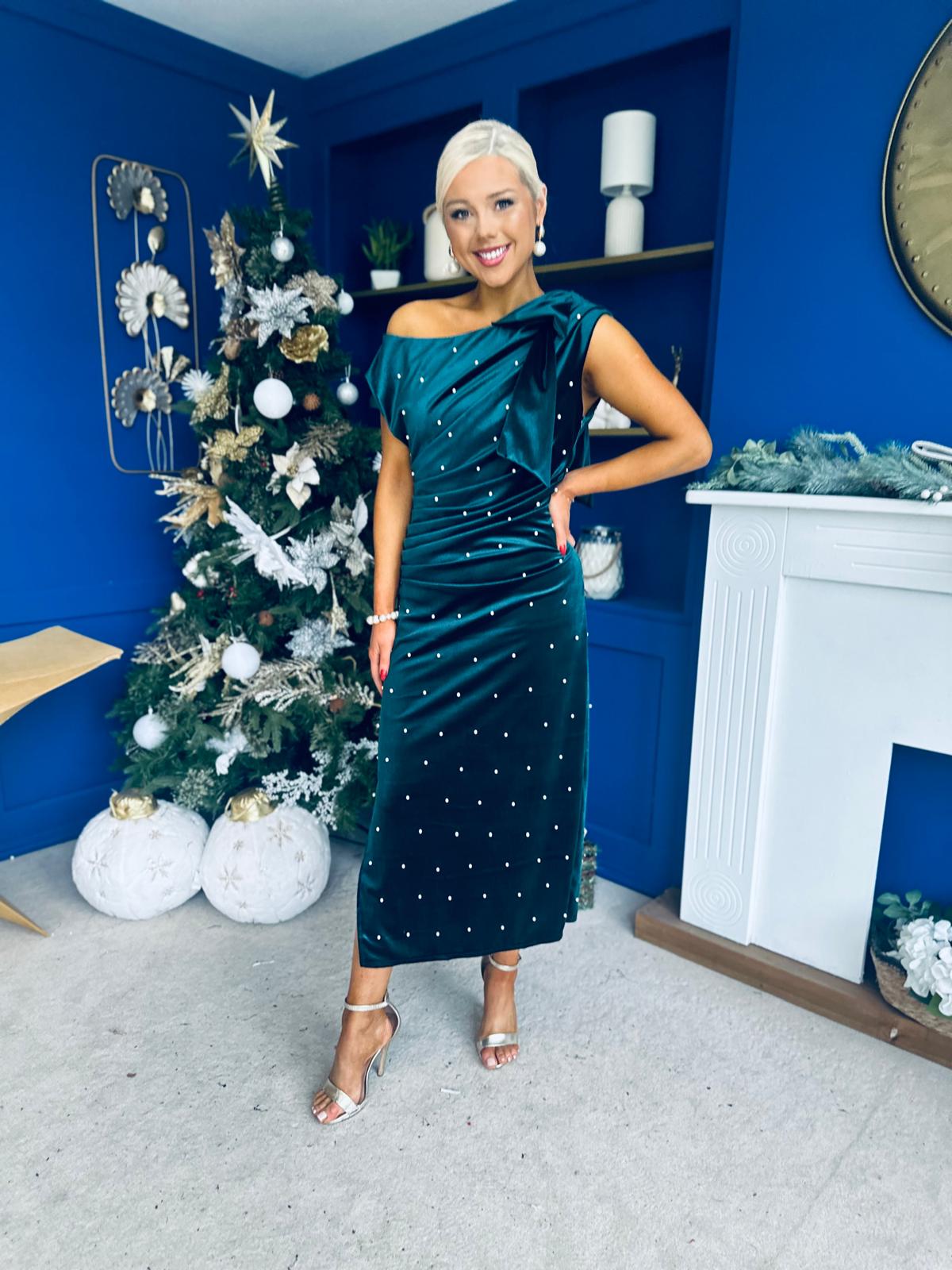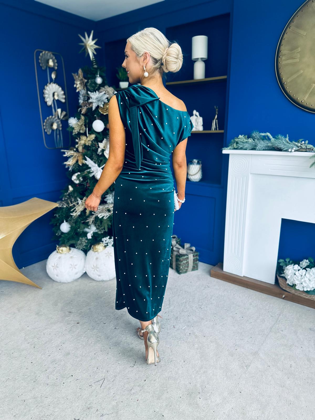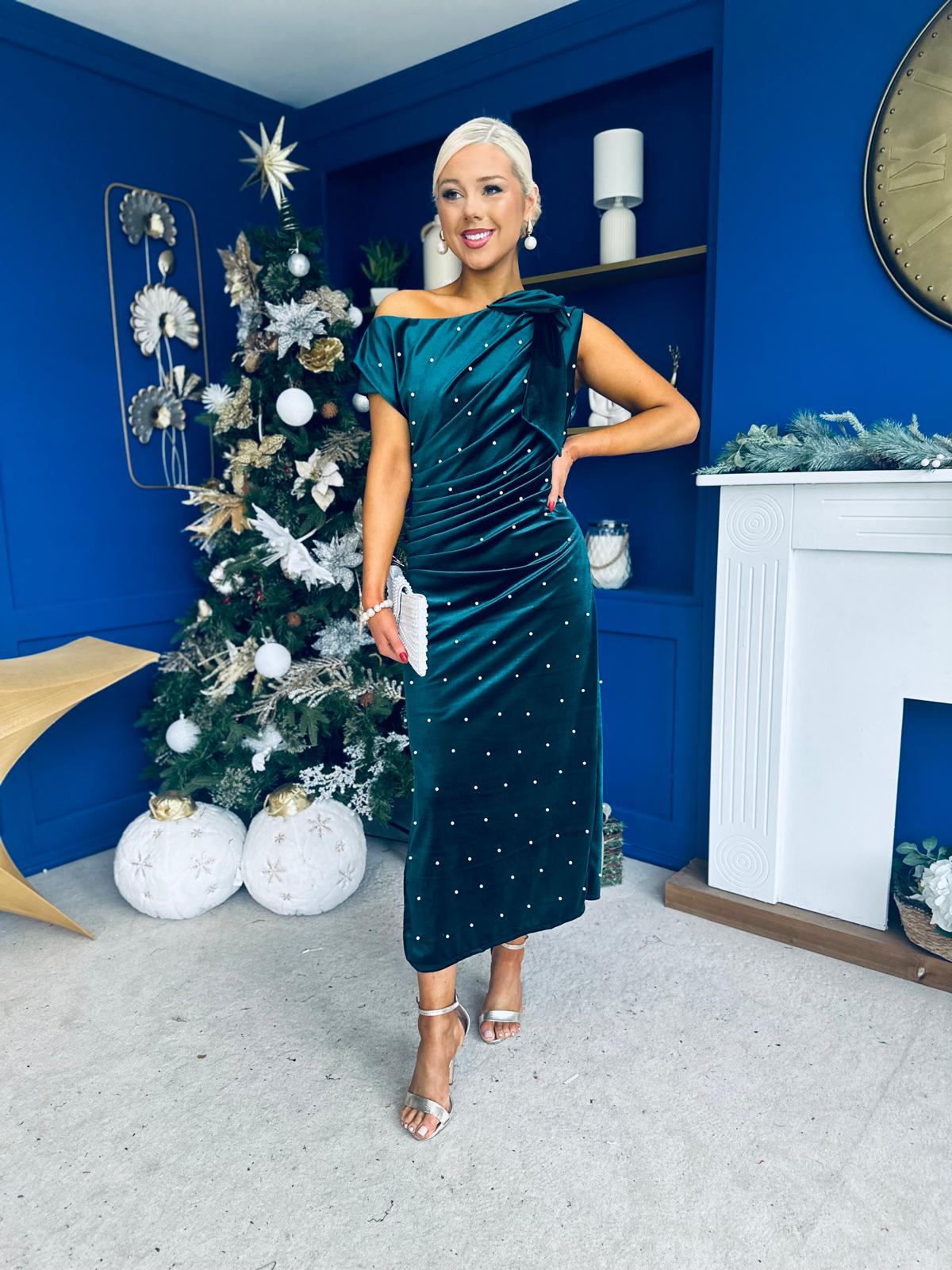 Nicole Bow Detail Pearl Embellished Dress Forest