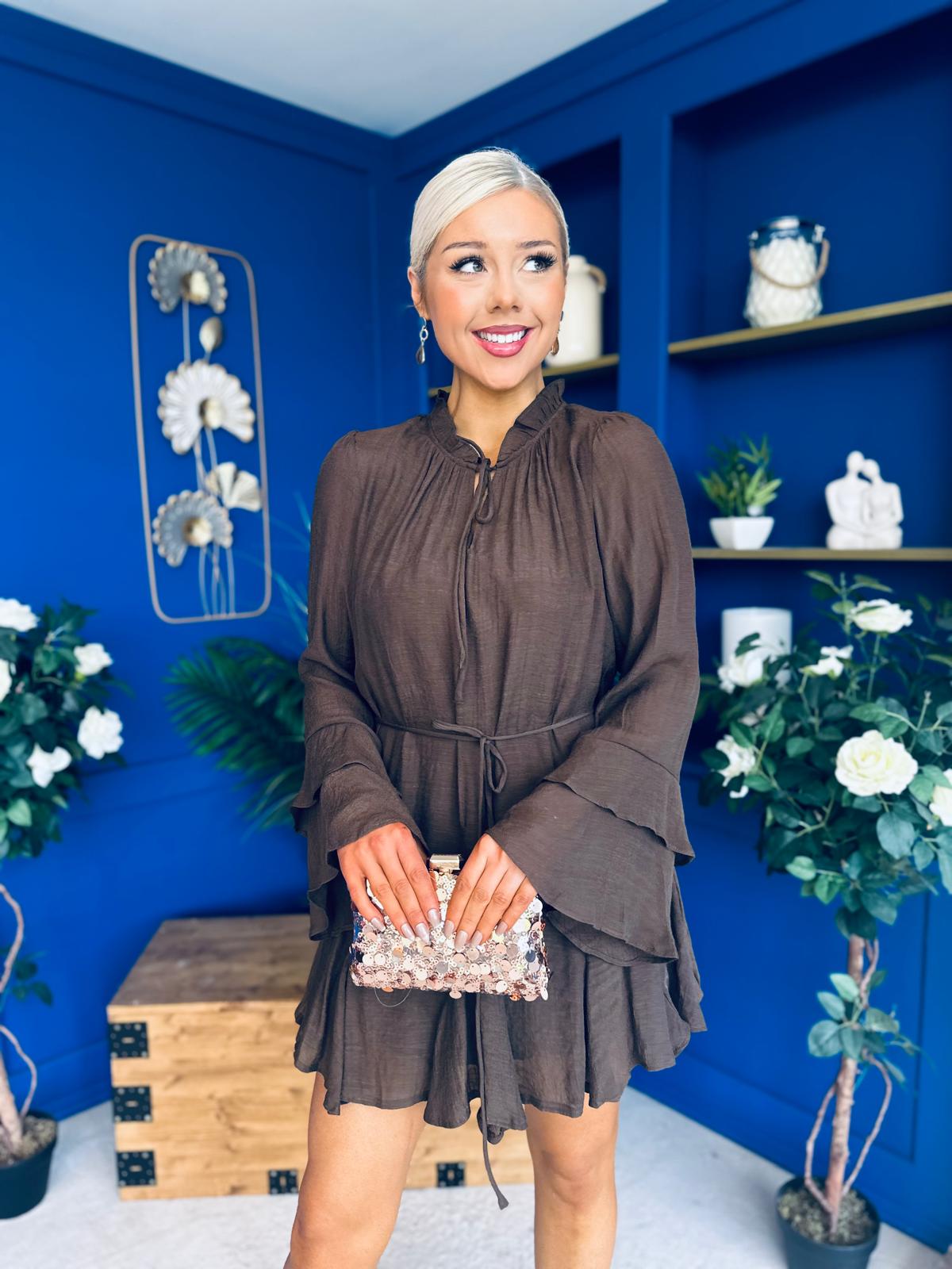 Its dramatic layered bell sleeve, detailed neckline, self tie string belt and flowing skirt create a stand out look