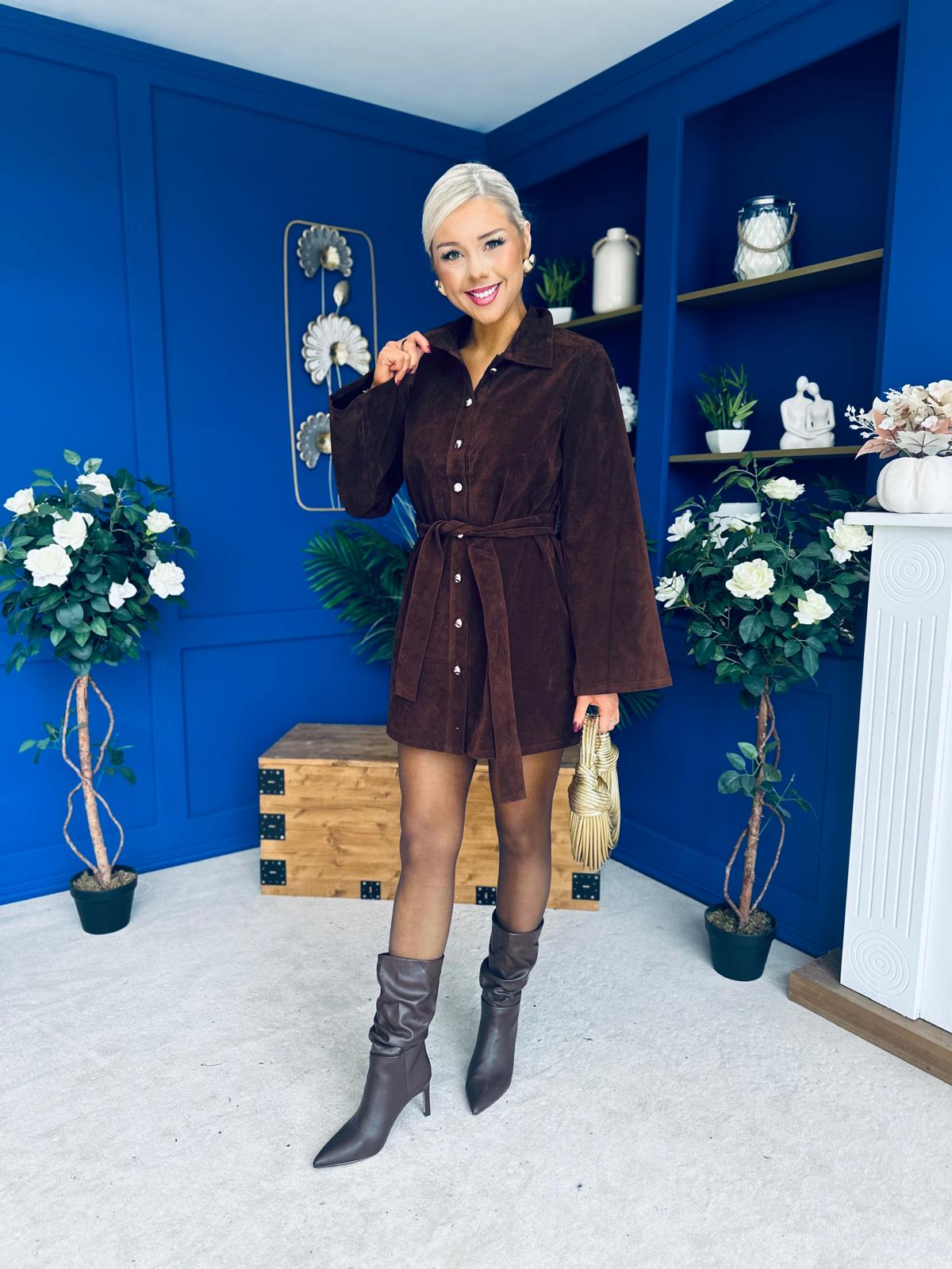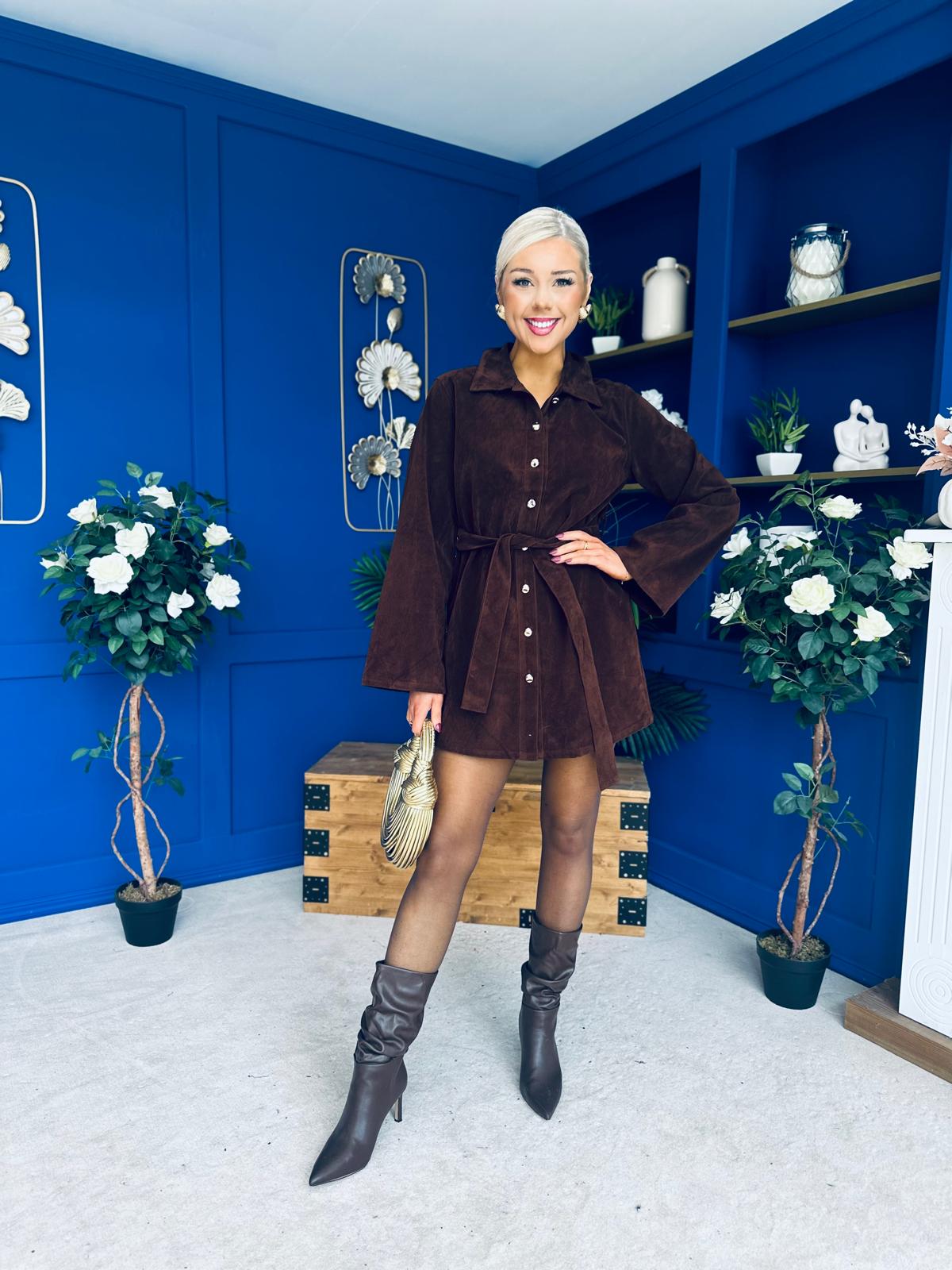 Opal Faux Velvet Mini Shirt Dress Coffee