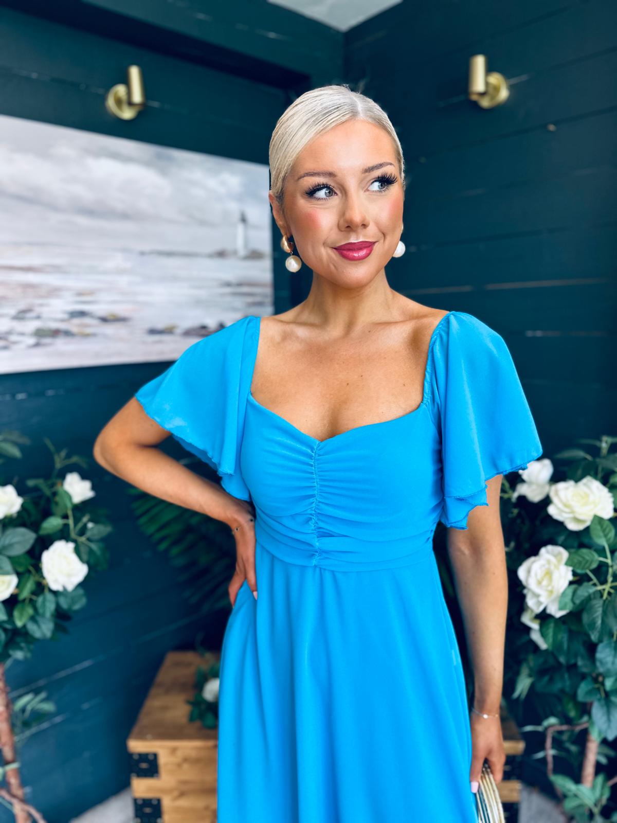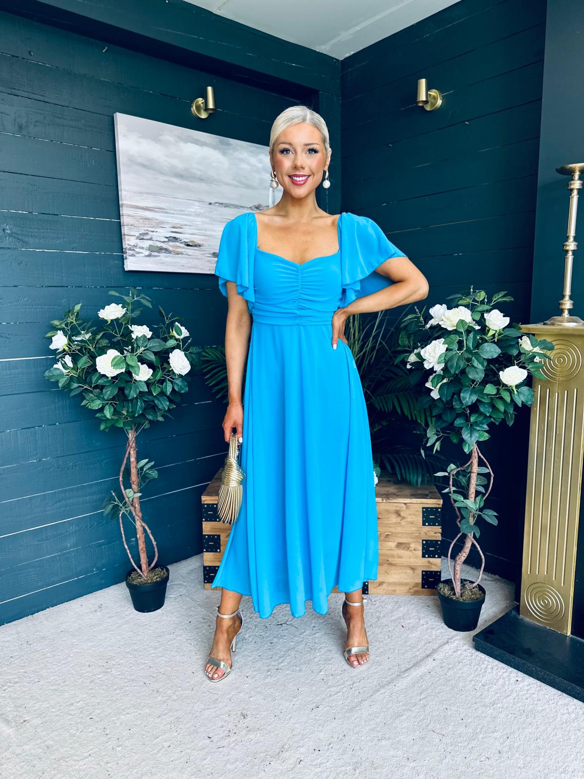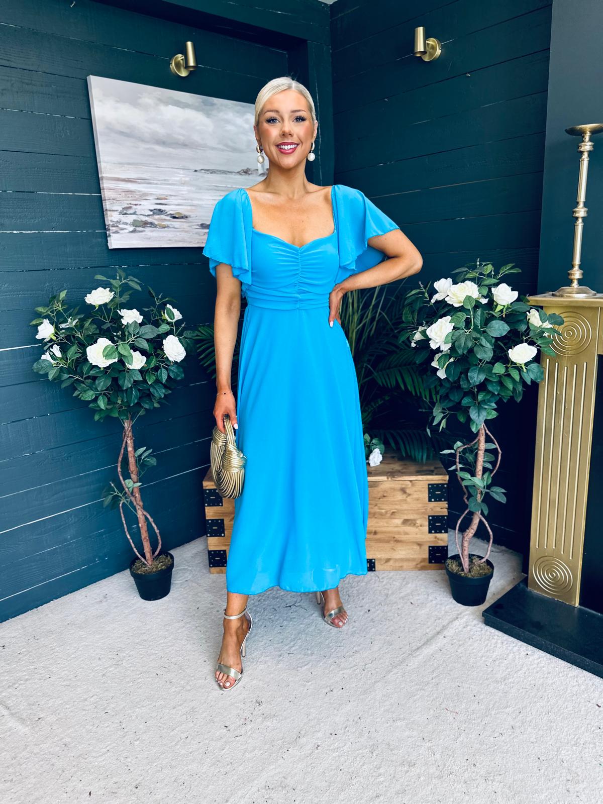 This dress comes in the most amazing lined chiffon, with beautiful sleeve detail, ruched bust, banded midriff, elasticated back to cinch and flowing skirt to flatter
