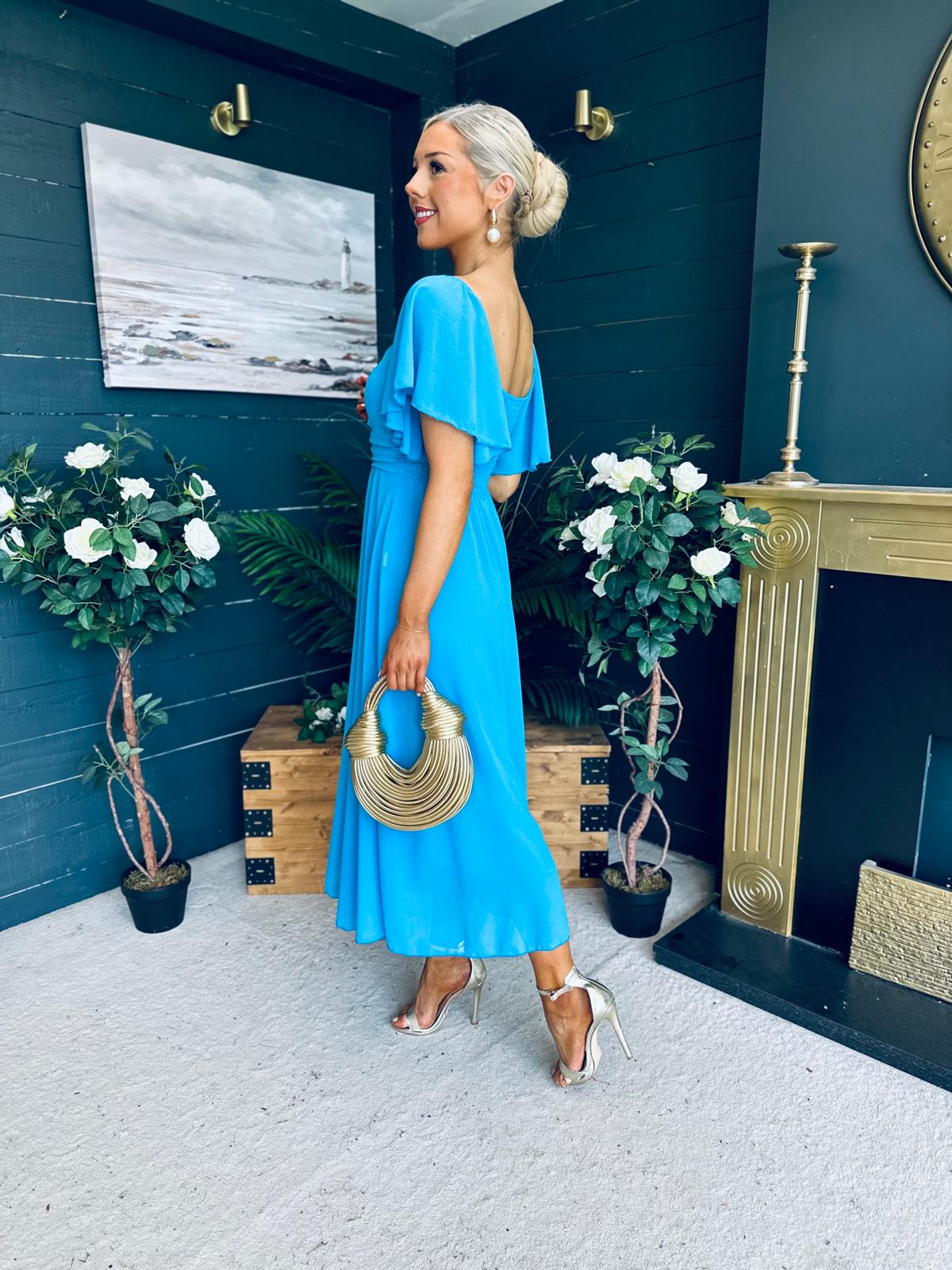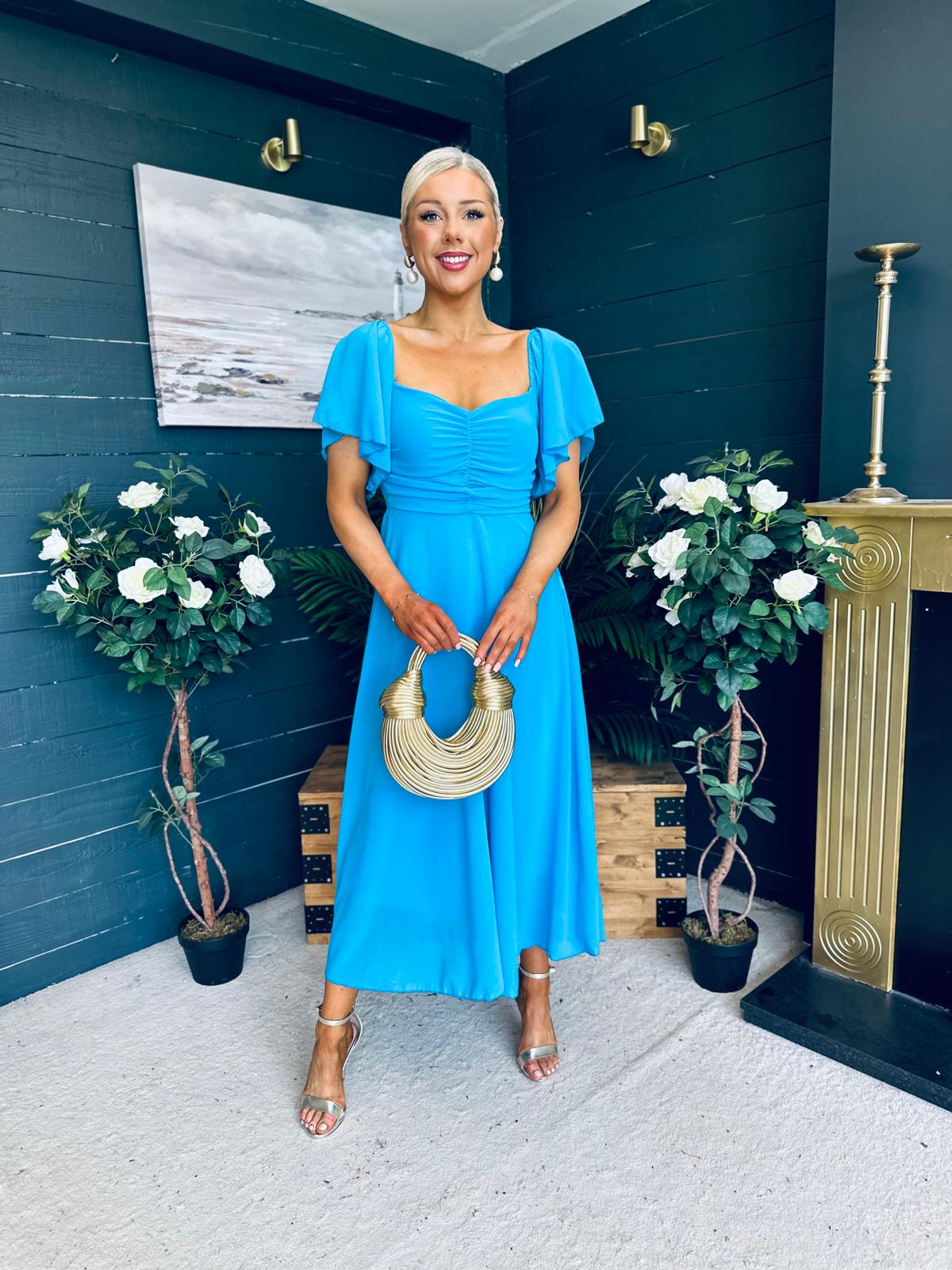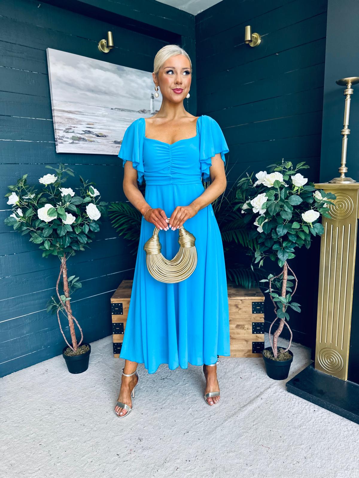 This dress comes in the most amazing lined chiffon, with beautiful sleeve detail, ruched bust, banded midriff, elasticated back to cinch and flowing skirt to flatter