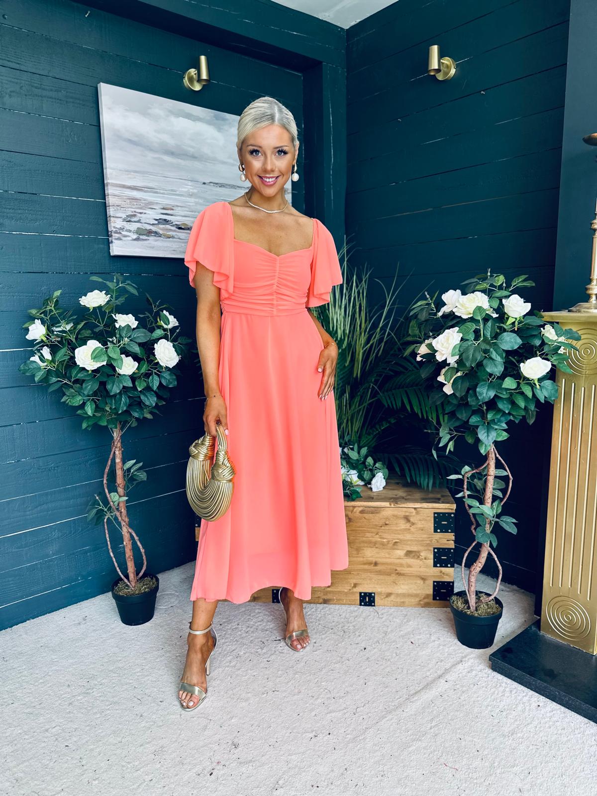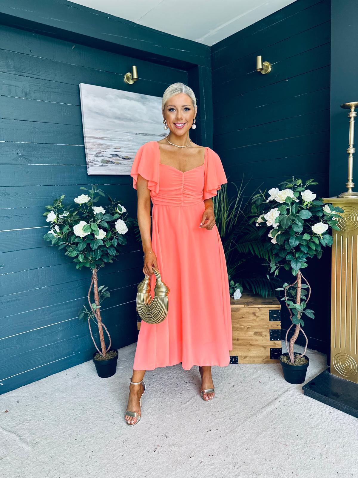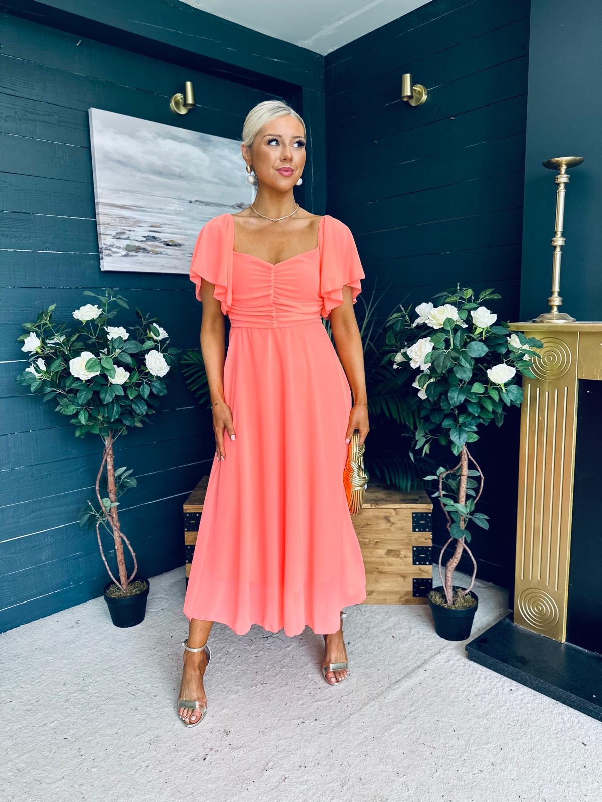 This dress comes in the most amazing lined chiffon, with beautiful sleeve detail, ruched bust, banded midriff, elasticated back to cinch and flowing skirt to flatter