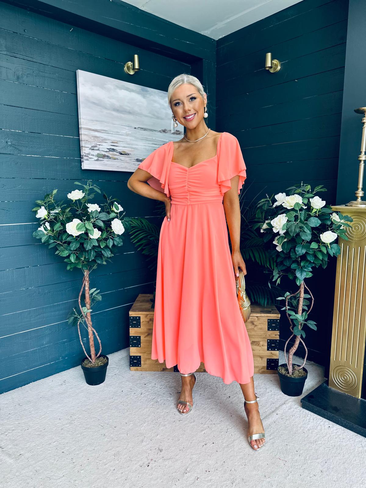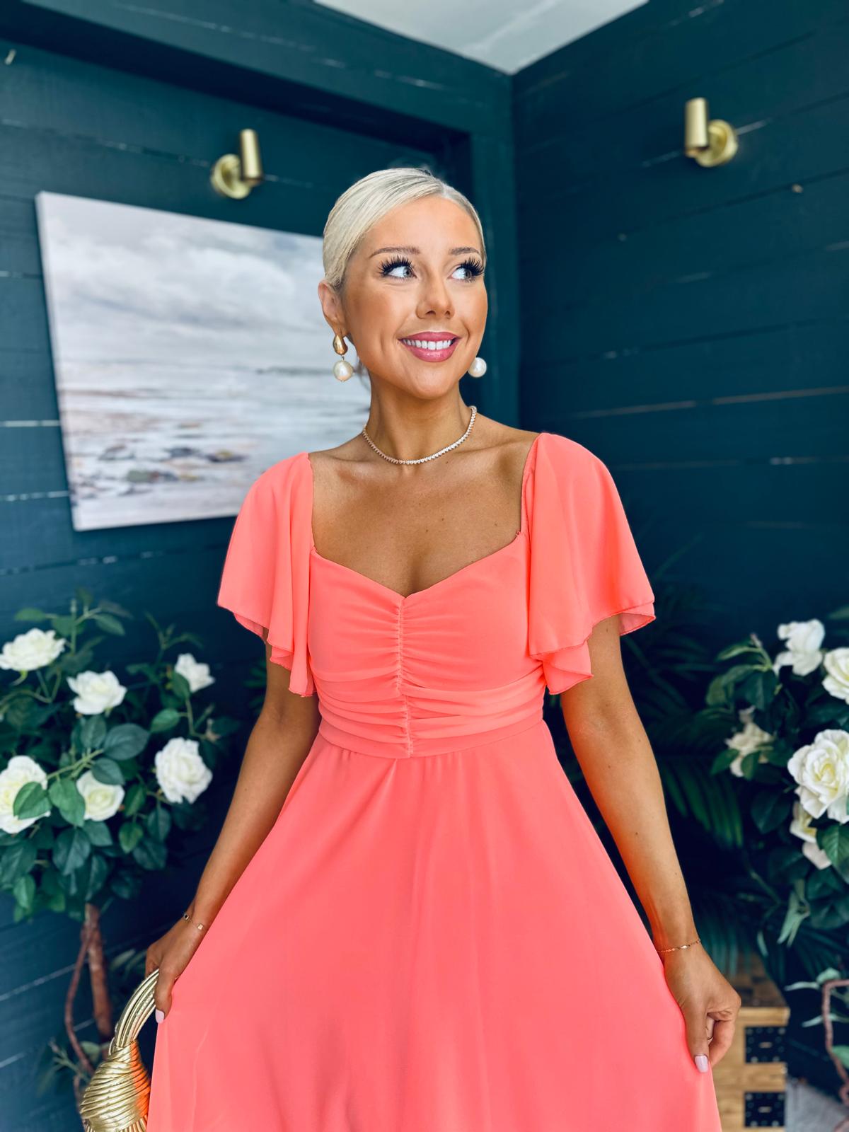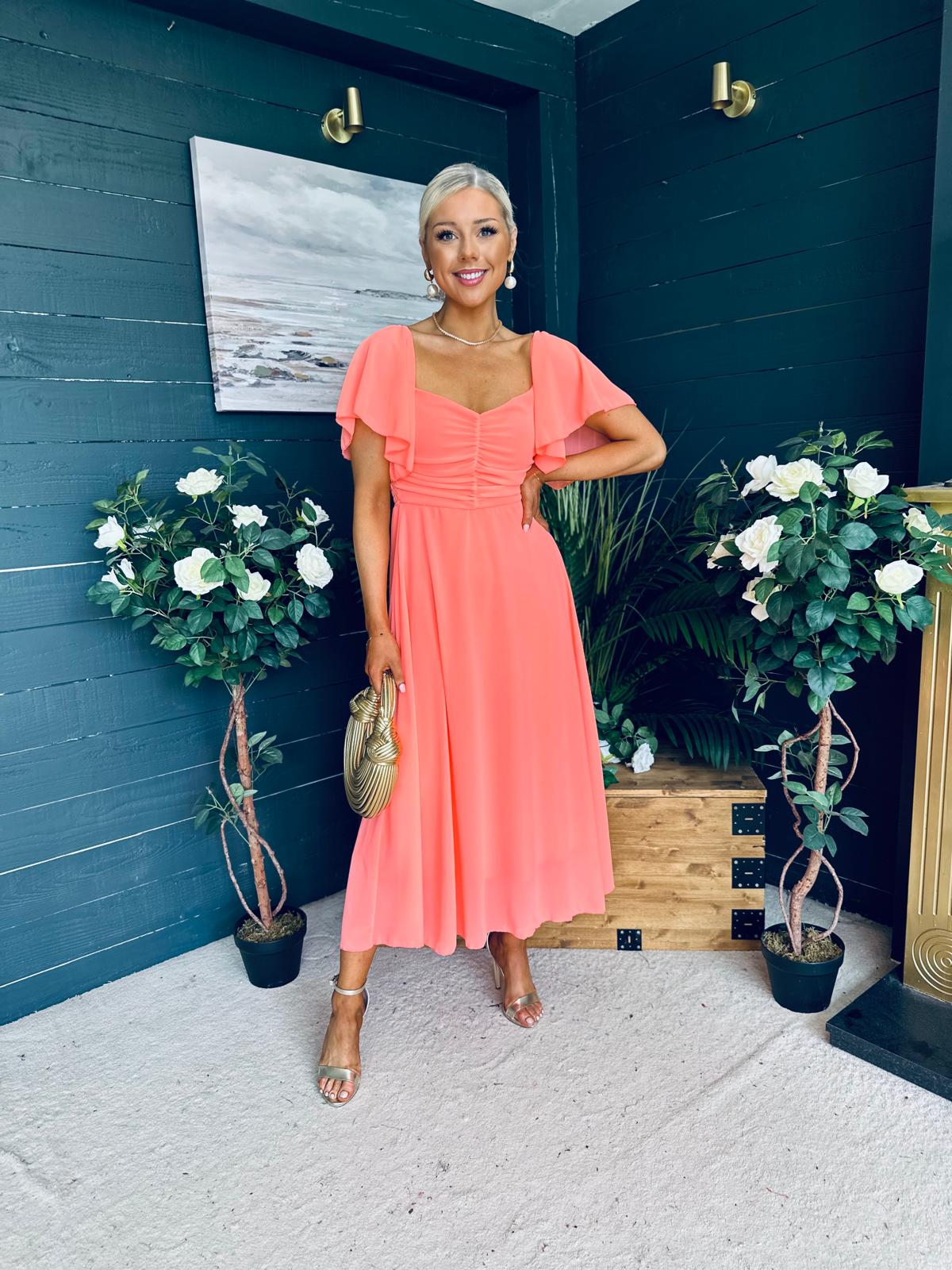 This dress comes in the most amazing lined chiffon, with beautiful sleeve detail, ruched bust, banded midriff, elasticated back to cinch and flowing skirt to flatter