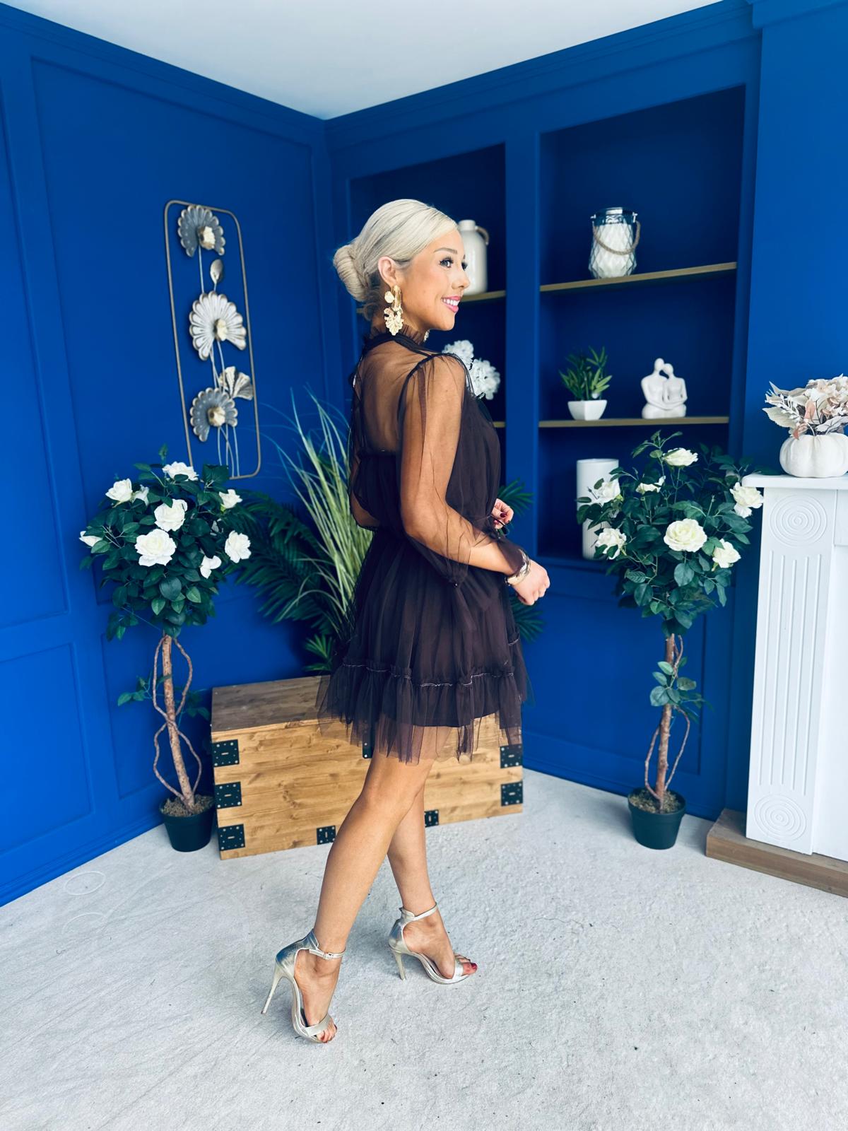 We are loving this flowing mini dress with gorgeous neckline and flowing tulle skirt.