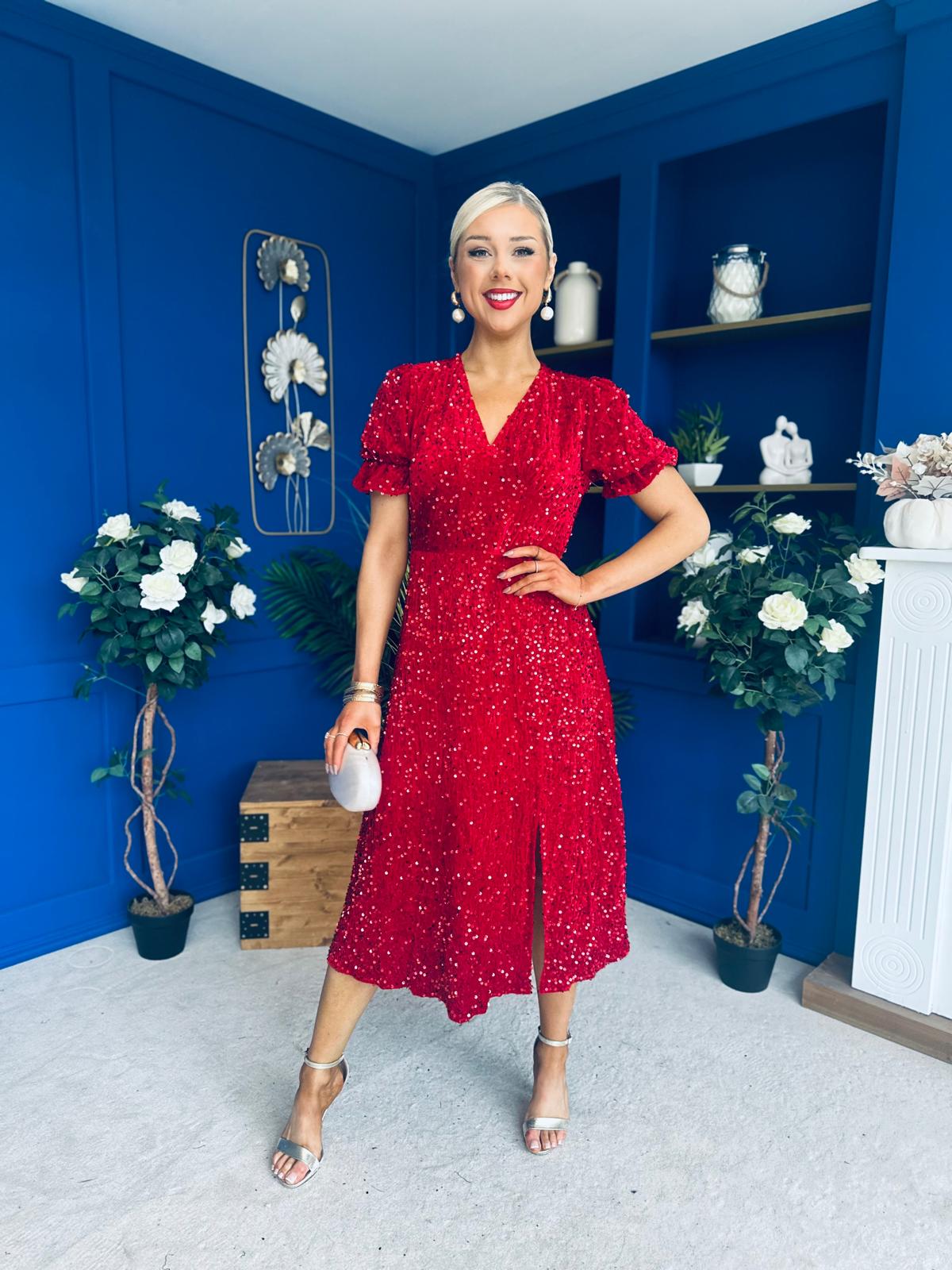 Phoebe Banded Sequin Midi Dress Red