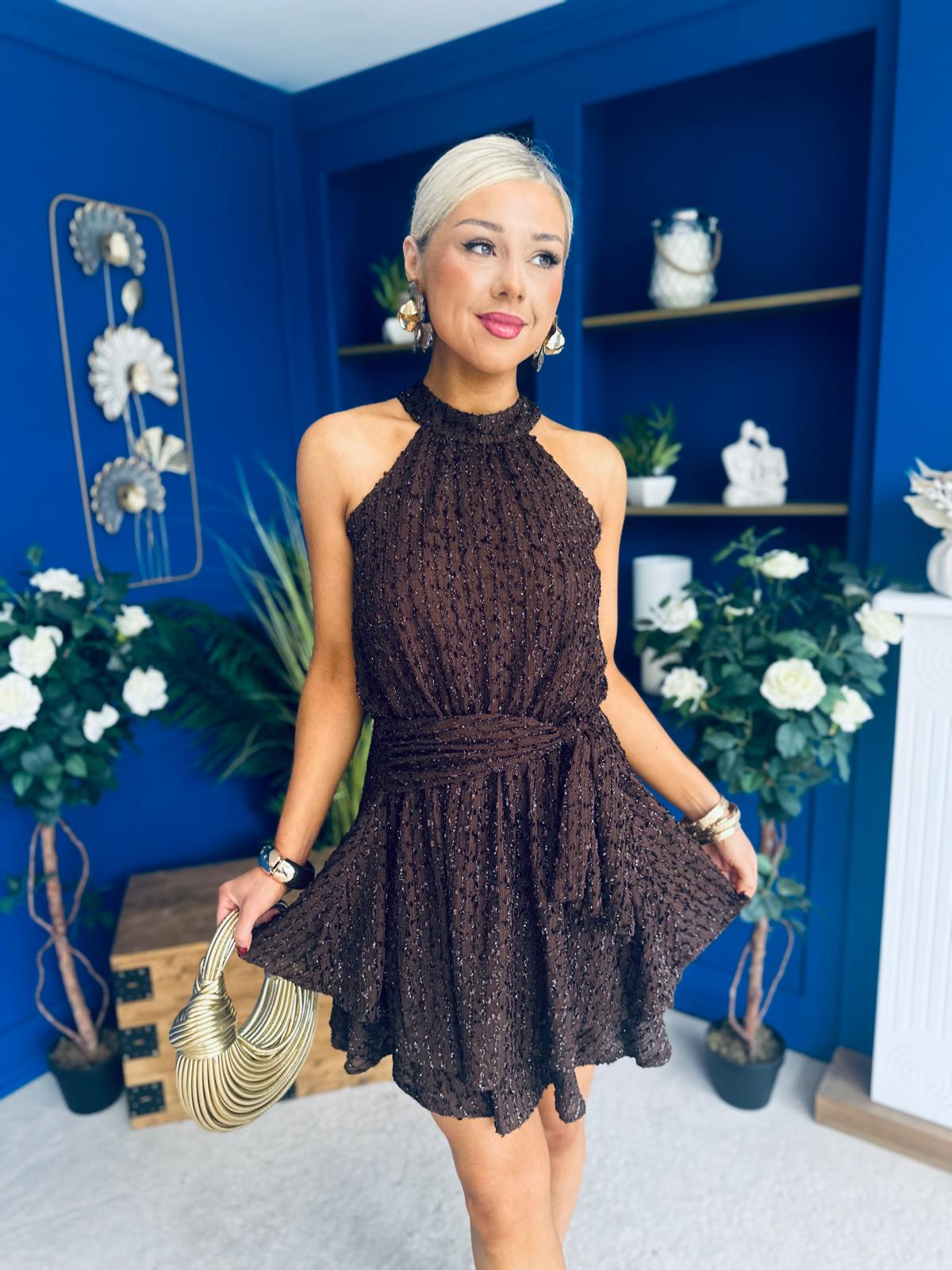 Phoebe Halterneck Embellished Mini Dress Chocolate