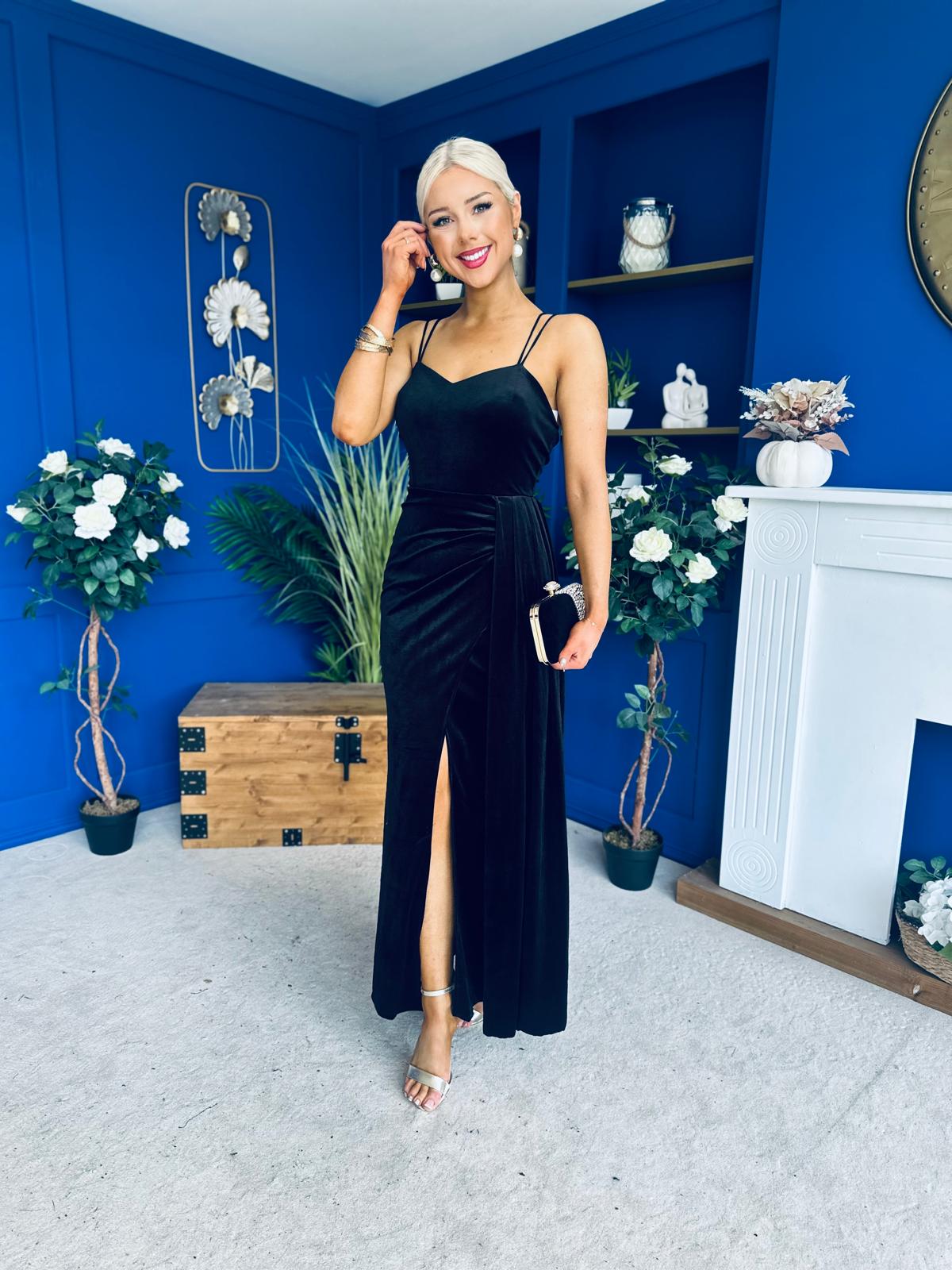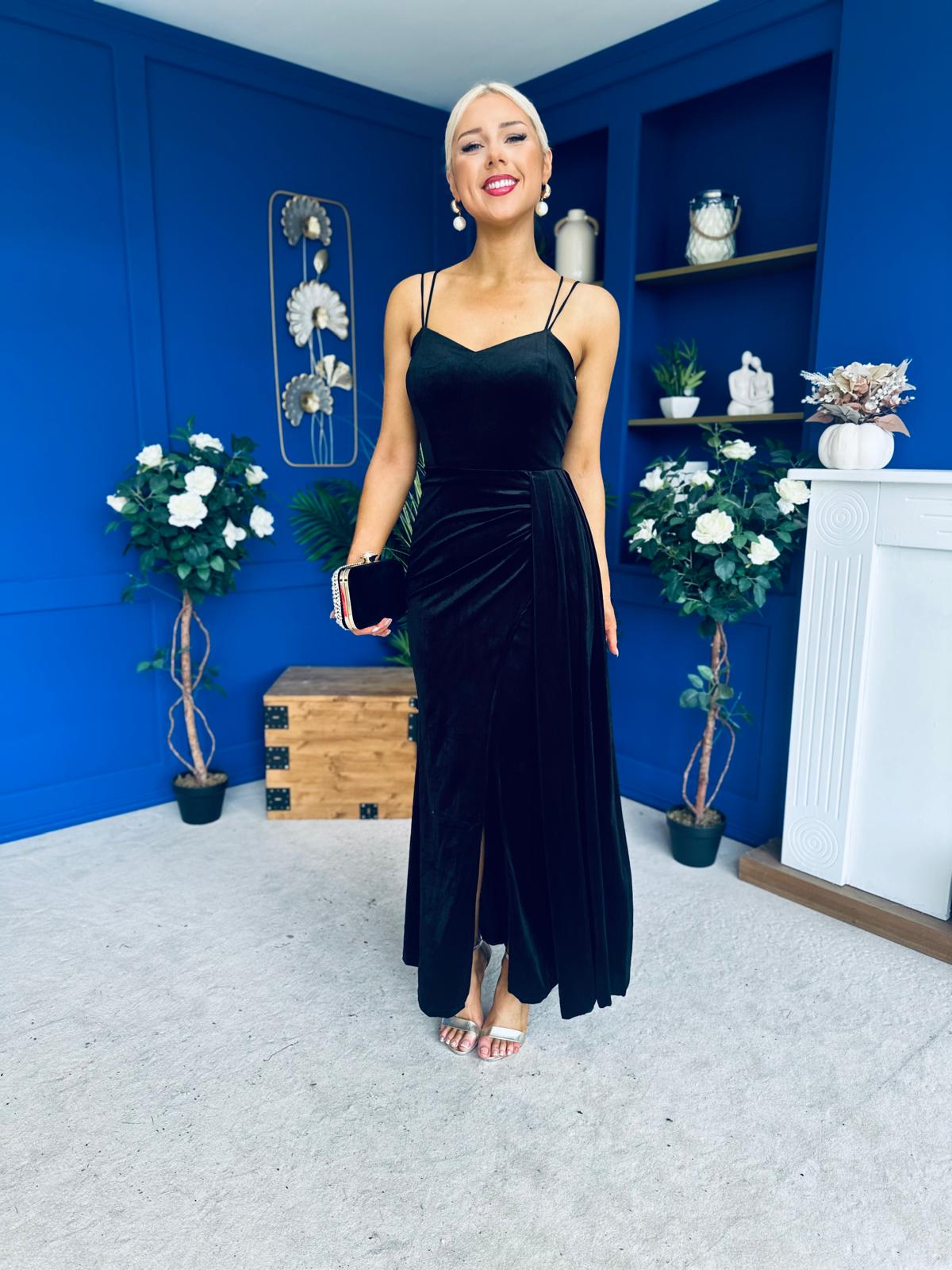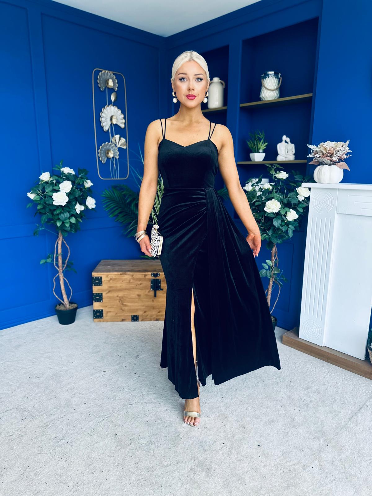 The amazing Piper occasion dress, in a fabulous velvet material, with gathered detail and side drape to skirt