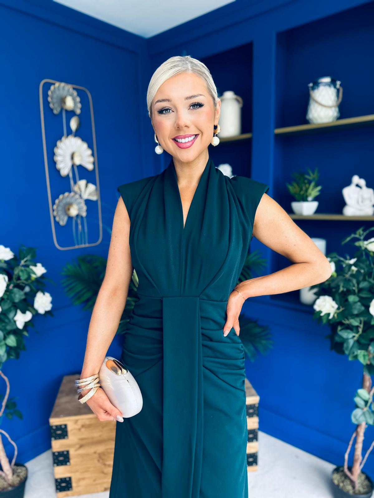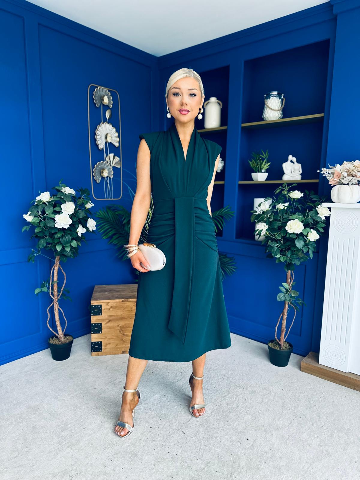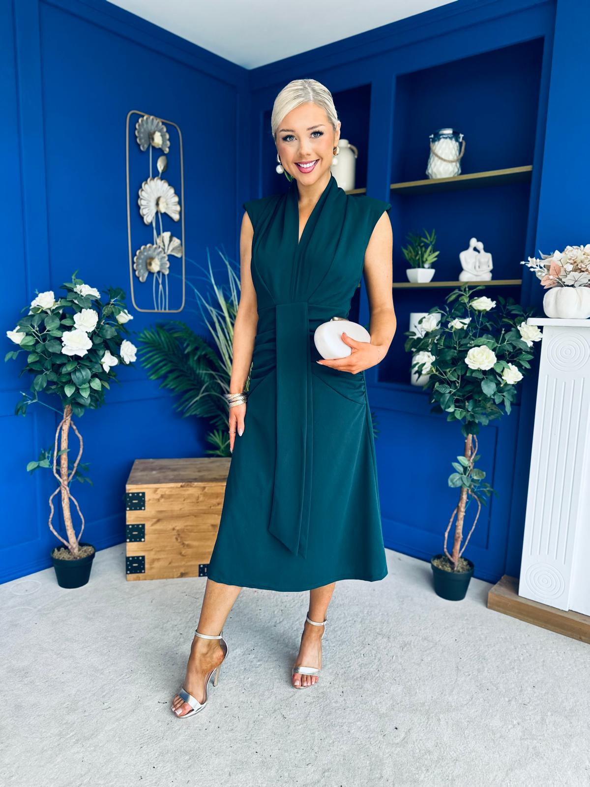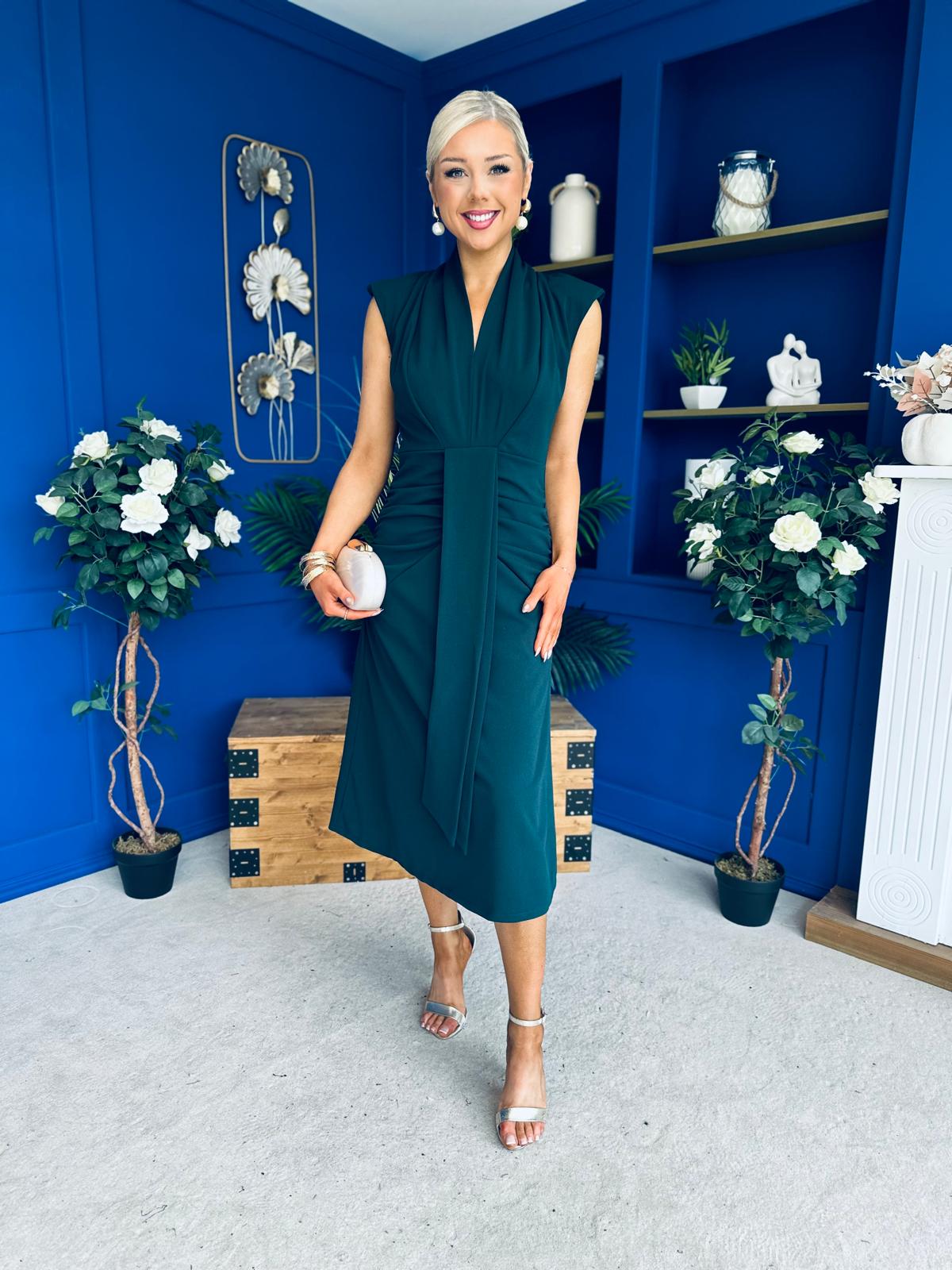 Our new Quinn dress has it all, with gorgeous detailed neckline, padded shoulder, ruching and drape detail