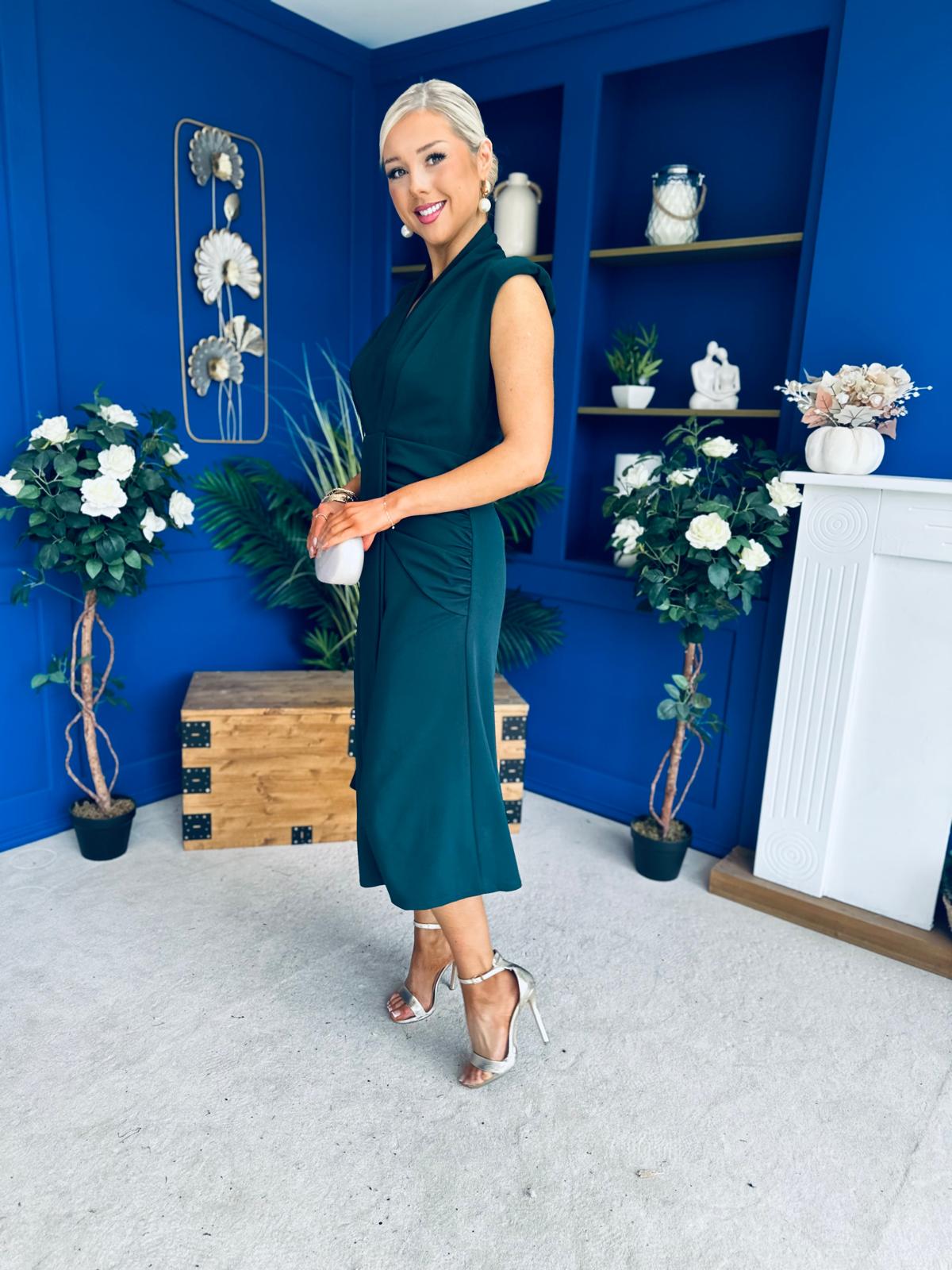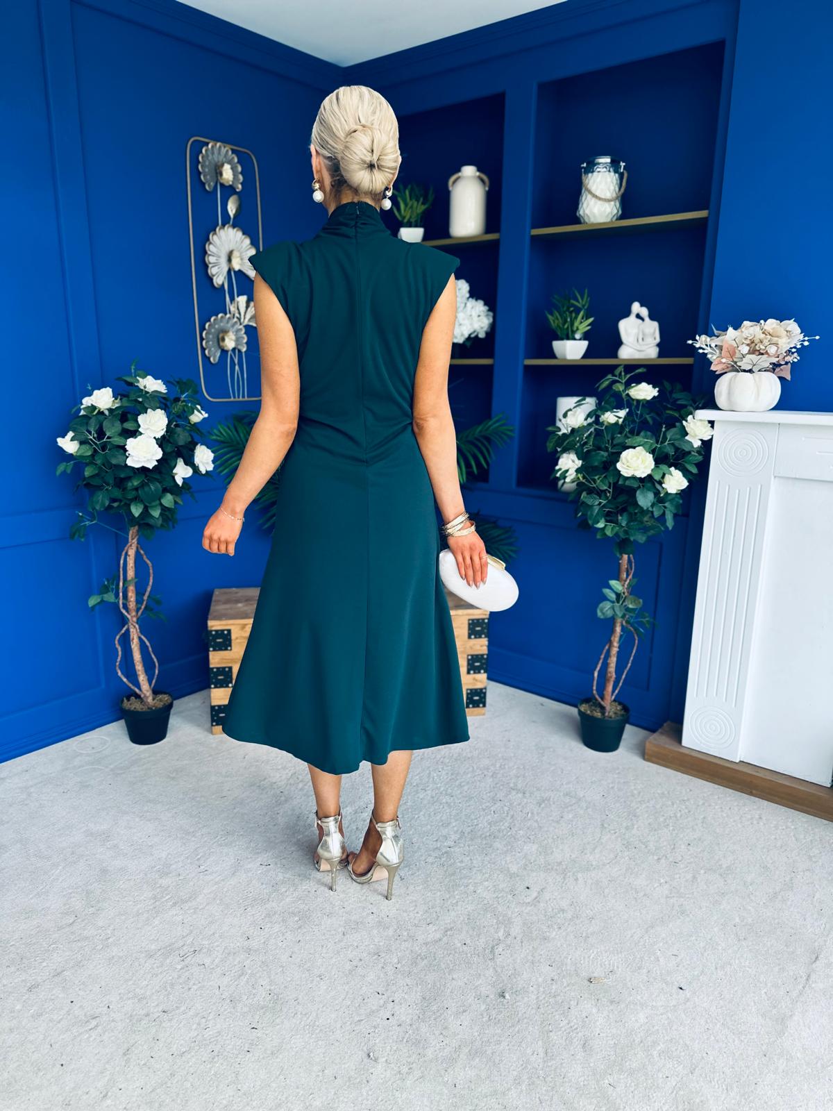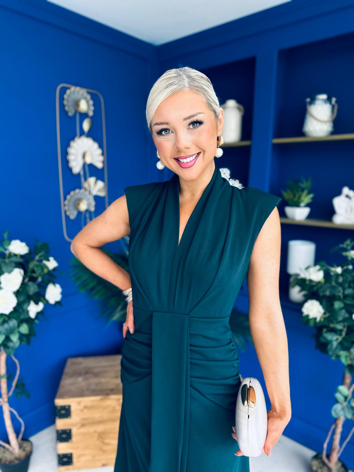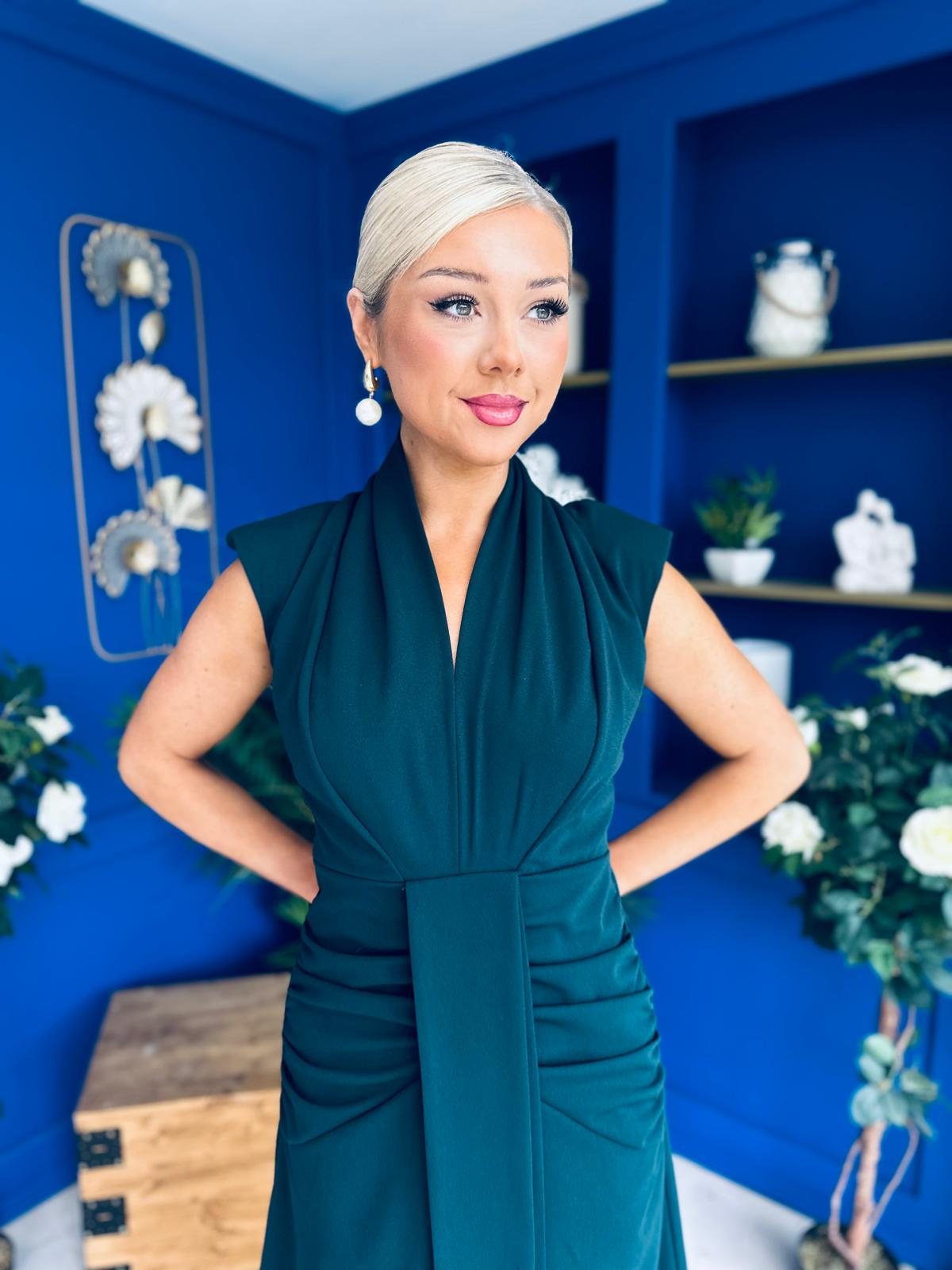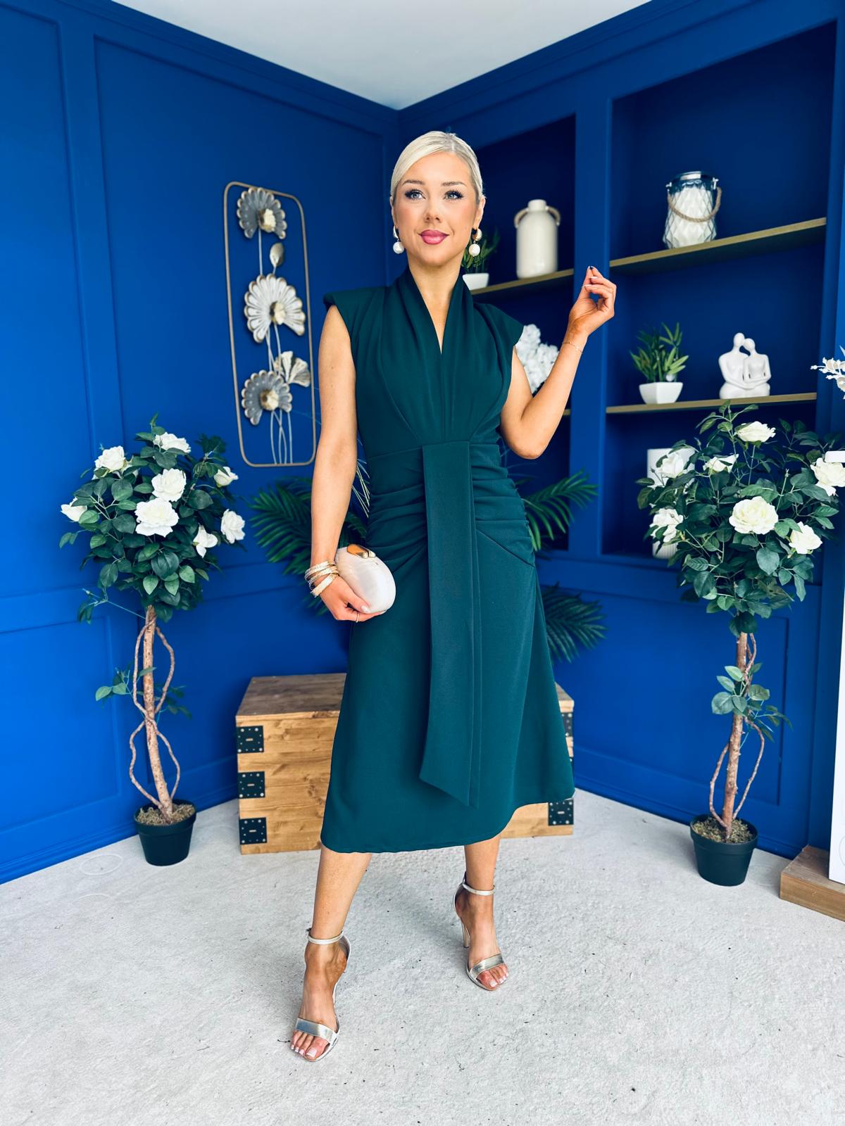 Our new Quinn dress has it all, with gorgeous detailed neckline, padded shoulder, ruching and drape detail