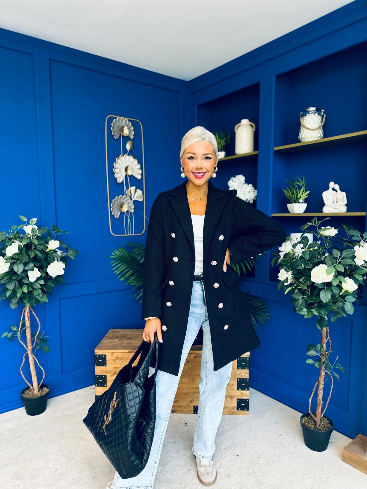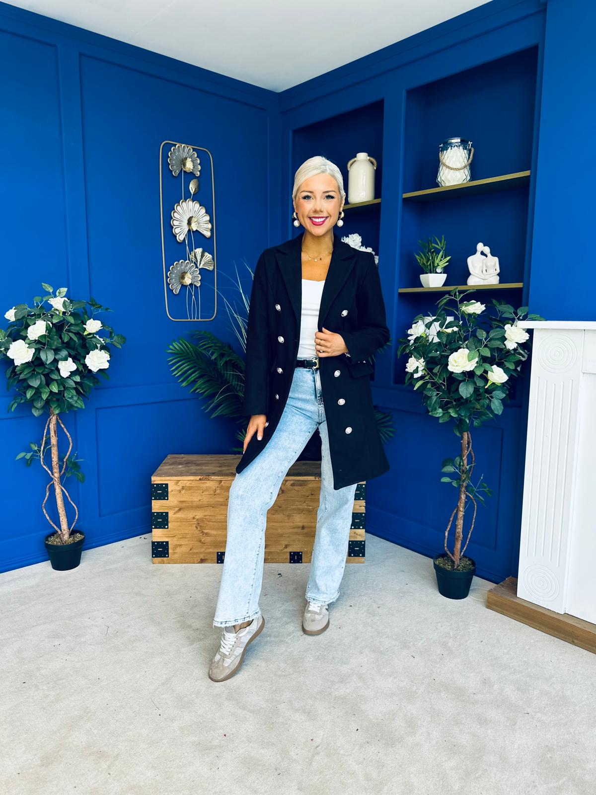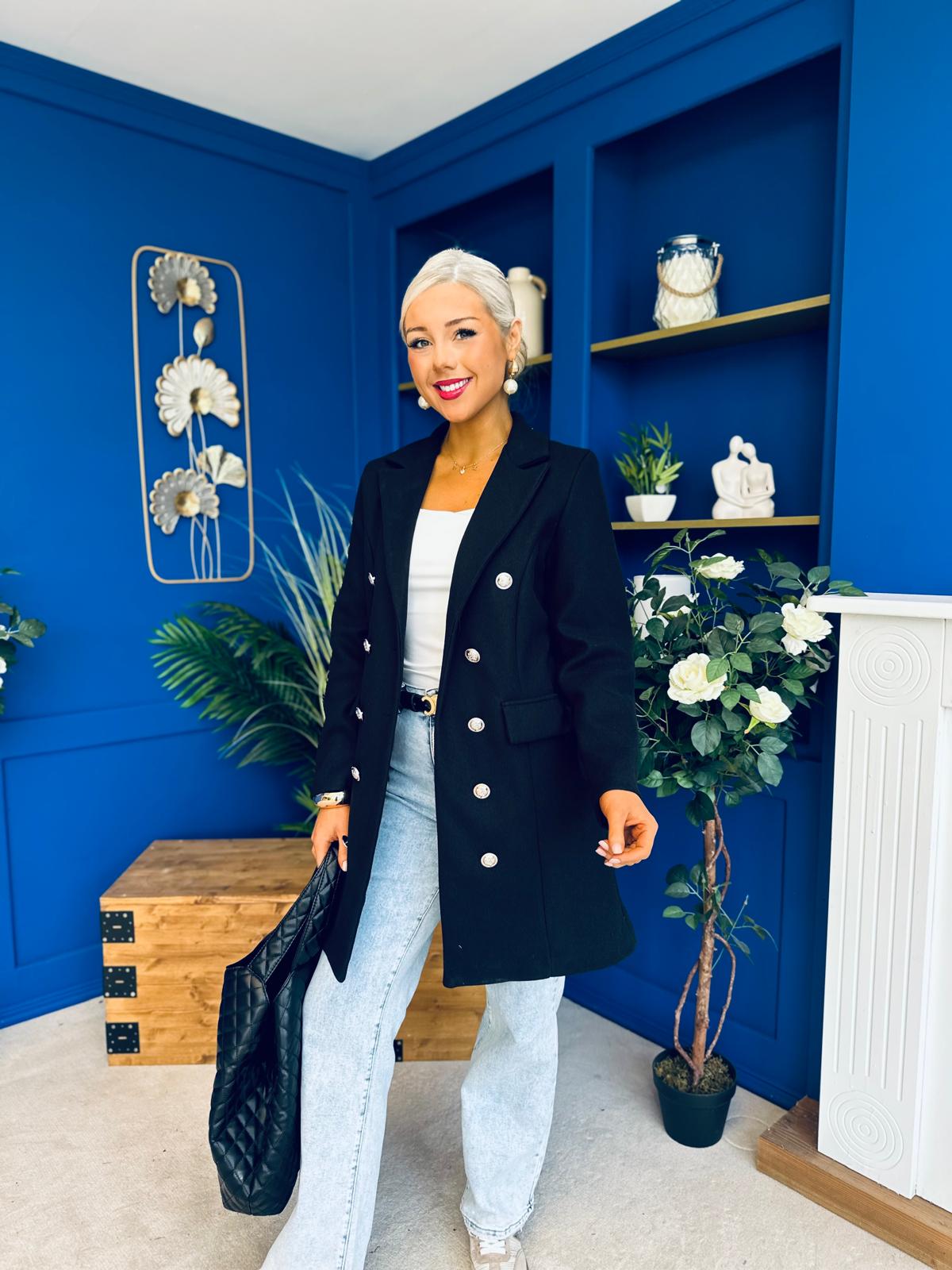 In a Bouble Breasted detailed Button closing style with faux button cuff detail